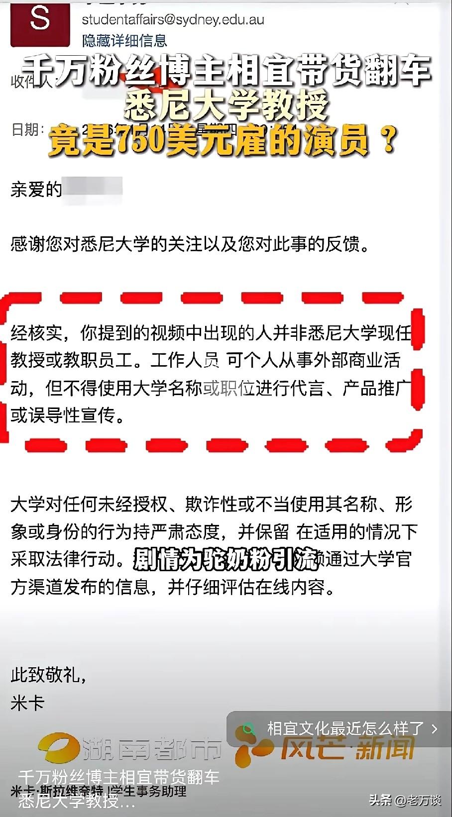千万粉丝博主、知名直播带货达人相宜被爆直播带货造假,而且还是抓典型,她言之凿凿请来的悉尼大学教授原来是 750 美元请来的模特,根本就不是悉尼大学的教职员工相宜故意打造高端人设吸引粉丝购买,实际上就是几千块钱而已,相宜从农村一路走来不容易,辞掉了铁饭碗,一心一意直播带货,也算是赚的盆满钵满,成为带货达人。为什么越来越多的年轻人不好好工作,总想着靠直播带货实现财富自由。这个实在太可怕了,必须让年轻人明白其中的利害