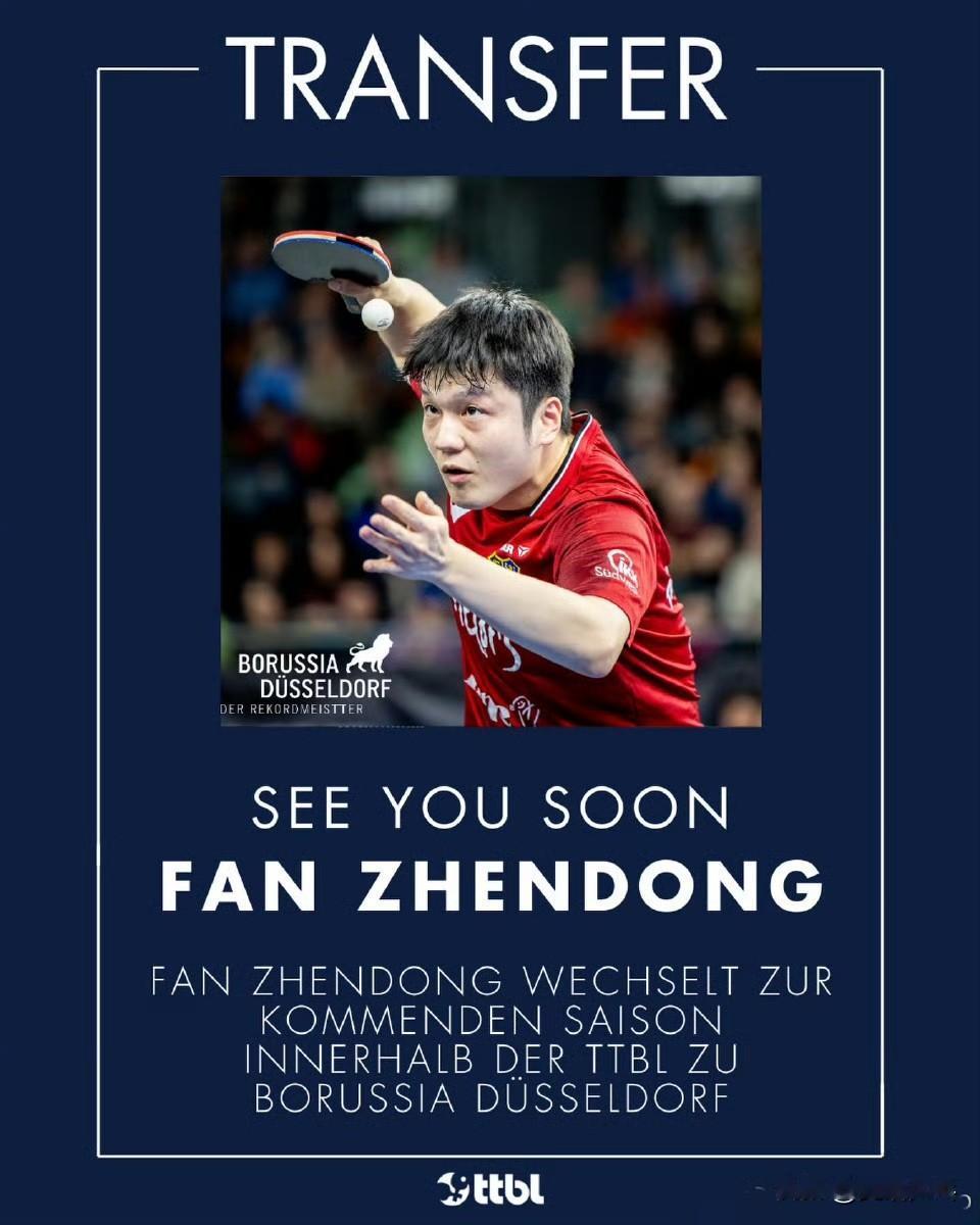凭借签下中国超级巨星樊振东这一轰动性操作,杜塞尔多夫俱乐部意欲书写乒乓球历史新篇章。在传奇选手蒂姆·波尔退役一年后,这位2024年奥运会男单冠军已签下一份2026/2027赛季为期一年的合同。 樊振东将于2026年7月1日从联赛竞争对手萨尔布吕肯俱乐部转投莱茵河畔的杜塞尔多夫,补强由邱党(2022年欧锦赛冠军,世界排名第12)、安东·卡尔伯格(2024年瑞典奥运银牌得主,世界排名第31)、卡纳克·贾哈(世界排名第28)与李永胤组成的阵容。(机翻) 2026.3.16