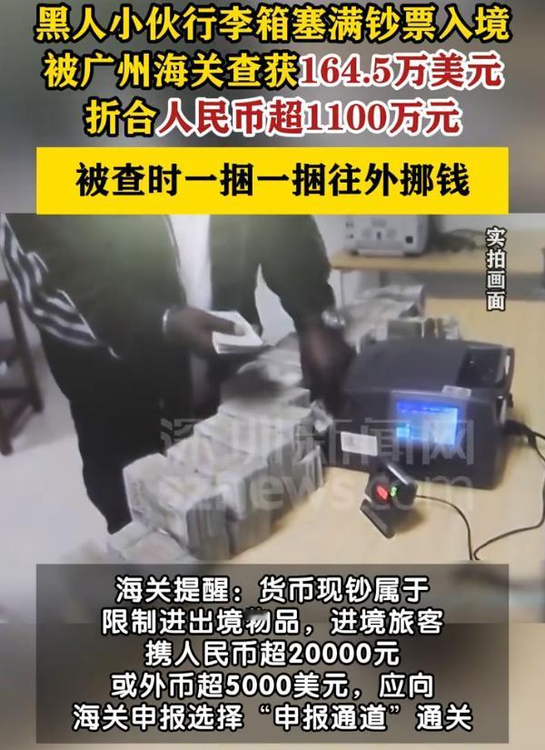 有钱任性?广东广州,一位黑人游客在机场入境,结果在过安检时直接被工作人员拦住,理由是行李箱有异常,打开一看,里面竟然是164.5万美元,折合人民币超1100万元,关键是他还没有申报 当时负责安检的老安检员,盯着X光屏幕看了半天,瞬间就愣了神,屏幕上没有显示常见的衣服、化妆品之类的物品,取而代之的是密密麻麻的块状阴影,整整齐齐地码在一起,就像军训时排列整齐的方阵,老安检员心里一紧,凭借多年的工作经验,他一眼就判断出,这玩意儿十有八九是现金,而且数量绝对不少。 工作人员当即要求黑人游客打开行李箱接受检查,当行李箱的拉链被拉开的瞬间,周围的人都下意识地屏住了呼吸,眼神全都被里面的东西吸引了。 只见箱子里的现金用透明胶带缠得严严实实,一摞接一摞全都是美元,那种标志性的“美金绿”在机场的灯光下泛着光,看着格外扎眼,光是看着就知道这笔钱的数额不一般。 安检工作人员不敢怠慢,当场开始清点这些现金,一遍又一遍足足清点了半个小时,最终得出的数字让人震惊,一共有164.5万美元,按照当时的汇率换算下来,折合人民币超过1100万元。 这么一大笔现金,竟然就这么随意地用胶带缠着,塞进普通的行李箱里,没有任何特殊的保护,也没有保镖陪同,看得人直呼不可思议。 全程下来,这位黑人游客表现得十分配合,没有丝毫慌张,面对工作人员的询问也很坦然,但最关键的问题来了,在入境申报栏上,他一个字都没填,也就是说这么一大笔现金,他根本没有按照规定进行申报,这也是他被拦下的核心原因。 面对工作人员的质疑,他给出的解释听起来倒是挺无辜,说自己是第一次来中国,根本不知道携带大量现金需要申报,在自己的老家,带这么多现金出门是很平常的事情,而且他也没有注意到机场随处可见的申报提示牌,不是故意不申报的。 这话听起来像是“无知者无畏”,但规矩就是规矩,不是说不知道就可以不用遵守的,不管是中国人还是外国人,只要入境中国,就必须遵守中国的规定,其中就包括现金申报,携带外币超过5000美元,或者人民币超过2万元,就必须主动申报,这是明确的要求没有例外。 而且这也不是中国特有的规定,全世界都是这样,每个国家都有自己的现金入境申报标准,比如美国规定携带超过1万美元需要申报,德国是1万欧元,就连泰国,也规定了1.5万美元的申报红线,目的都是为了规范现金流动,防止违规行为。 可能有人会疑惑,为什么各国都要管这种“闲事”,其实道理很简单,现金的匿名性太强,很多不法分子都会利用现金进行洗钱、非法资金转移等违法活动,而申报制度并不是为了限制大家的自由,而是给每一笔大额现金留一个轨迹,不让它成为灰色交易的温床,维护正常的金融秩序。 这件事最荒诞的地方就在于,164.5万美元是5000美元申报红线的329倍,这么大一笔钱,就这么随意地放在普通行李箱里,连个保镖都没有,还不申报简直是把规矩当摆设,事情被曝光后,网友们都炸了锅,纷纷议论起来。 有人质疑这笔钱的来源,这么大一笔现金,来路真的经得起推敲吗,也有人分享自己的经历,说自己曾经带了6000美元入境,因为没申报被查,更别说这么大一笔钱了,还有人吐槽这就是典型的有钱任性,以为有钱就可以不遵守规矩,殊不知规矩面前人人平等。 目前这笔巨额现金已经被机场相关部门暂扣,具体的调查还在进行中,按照正常流程来说,罚款是肯定跑不掉的,除此之外部分现金还有可能被永久查扣,这位黑人游客的信用记录上,也会留下一个污点,可谓是得不偿失。 其实说到底,有钱并不是原罪,有钱可以过更好的生活,但更得守规矩,入境前花5分钟时间,按照规定申报现金,就能避免后续的所有麻烦,而因为侥幸心理,觉得自己不会被查到,最终可能损失千万,这笔账怎么算都不划算,毕竟侥幸心理的代价,往往比我们想象的要大得多。