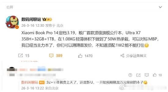 小米笔记本Pro 14冲击万元档小米全新高性能轻薄本小米笔记本Pro 14将于3月19日正式发布。这款新品在还未面世前,其预期的市场定位和极高的硬件成本就已经引发了行业内的广泛热议。有博主透露,小米笔记本Pro 14从立项开始就是按照万元级标准打造的。特别是32GB内存与1TB固态硬盘的组合,由于全球供应链波动,目前的采购成本非常高,顶配版最终售价可能在12000元上下。截至2026年1月,全球存储芯片的核心产品DRAM内存和NAND闪存价格,均创下了近十年来的最高纪录。受此影响,PC巨头联想已经率先对旗下部分产品进行了调价。在这种大环境下,小米高端笔记本步入万元时代也在意料之中。高昂的售价背后,是小米在机身材质和工艺上进行的各种激进尝试。为了撑起万元级的定位,这款笔记本在机身材质上极其考究。它采用了触感亲肤的丝绒镁合金机身,键盘支撑板则使用了坚固的钛合金。配合高强度碳纤维底盖,在大幅度减重的同时,依然保持了极高的机身刚性。散热系统也经过了重新设计,石墨烯铝合金散热鳍片的引入,确保了轻薄机身下依然能有高效的热量导出。这种对材料的极致追求,不仅提升了耐用性,更让整机的工业质感达到了新的高度。在核心硬件配置上,小米笔记本Pro 14搭载了最新的第三代英特尔酷睿Ultra处理器。强大的运算能力配合精密的设计,让这款轻薄本在处理高强度工作任务时依然能够保持冷静且高效。续航表现更是该机的一大杀手锏。它内置了72Wh的大容量电池,能量密度高达800Wh/L。由于内部空间的极致优化,这块电池在有限的体积内提供了更持久的电力支撑。根据官方数据,小米笔记本Pro 14的续航时间能够达到惊人的19.8小时。这一成绩已经远超苹果MacBook Pro的M5版本,成为目前移动办公领域中续航表现最顶尖的机型之一。这种全方位的材料革新与性能堆叠,标志着小米正在向超高端笔记本市场发起强力冲击,新品会在3月19日亮相。