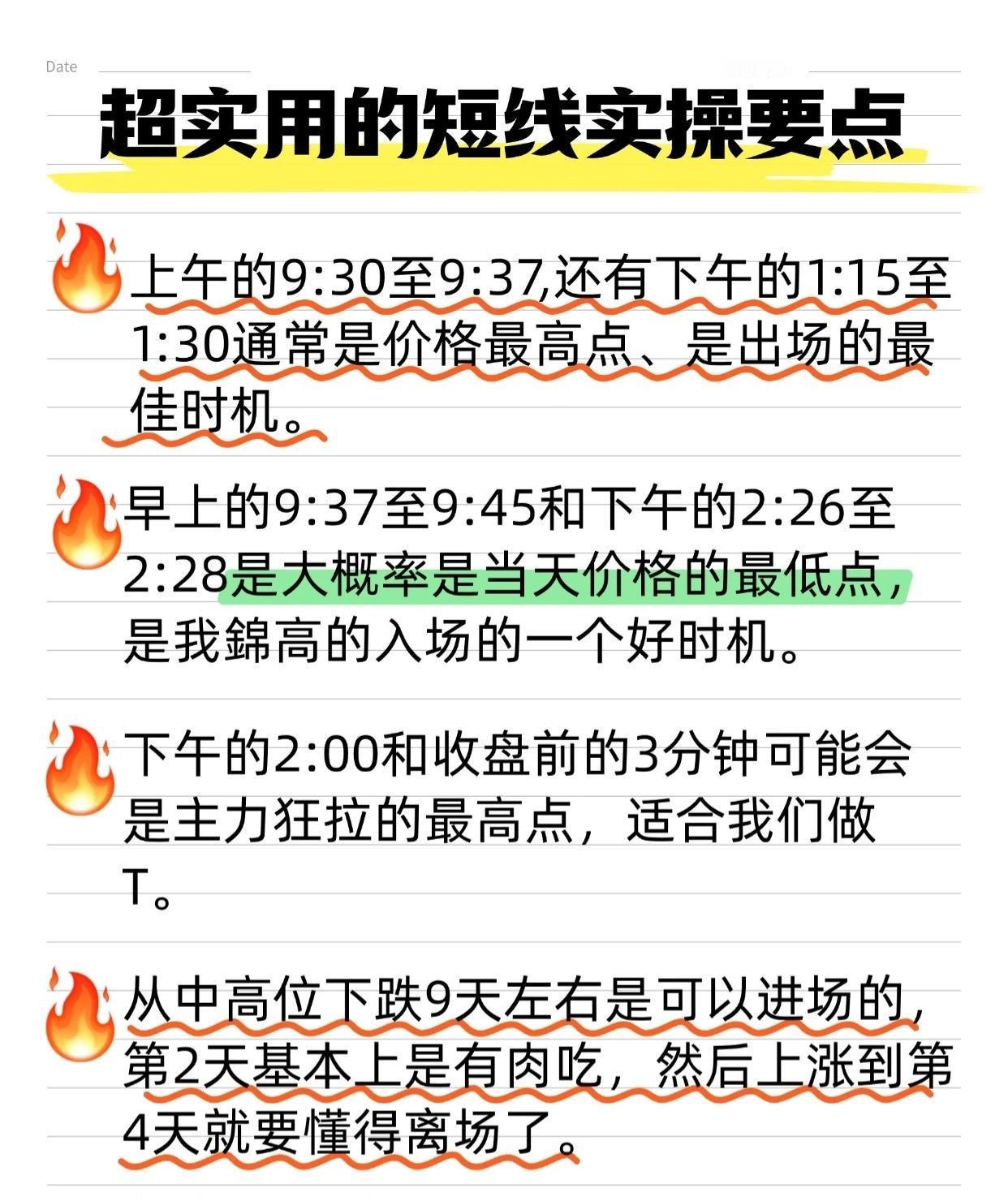 以下内容是散户养家的9条铁律和超实用的短线实操要点,核心是指导散户从趋势、量能、均线、题材、仓位及分时操作等方面把握股市机会、规避风险,以下是详细总结: 一、散户养家的9条铁律(选股+趋势+时机) 1. 量能与主力:放量才有主力参与,缩量多是散户行情;跟主力(“混主力”)才有收益,纯散户行情无波澜、无机会。 2. 趋势选择:只做上升趋势(顺水行舟),不碰下跌趋势(逆水挣扎,下降通道难挣钱)。 3. 均线形态:均线多头排列(多方力量强,如“大军压境”),大胆进场做多,大概率有收获。 4. 底部信号:底部放量涨停=大机会(像“沉睡的狮子苏醒”,后续或有大行情)。 5. 高位信号:高位放量滞涨=离场观望(像“气球吹到极限”,随时可能破,别贪心)。 6. 尾盘拉升:尾盘突然拉升≠好事(主力或为次日出货“耍心眼”,别轻易追高)。 7. 早盘急跌:早盘急速下跌别恐慌(可能是主力“洗盘”,只要趋势在,有机会反弹)。 8. 题材优先:题材是“第一生产力”,有热门题材的股票像“站在风口的猪”,更容易上涨。 9. 仓位控制:控制仓位是关键(“别把鸡蛋放一个篮子”),时刻留后路。 二、超实用的短线实操要点(分时+周期操作) 1. 出场时机:上午9:30-9:37、下午13:15-13:30,通常是当日价格最高点,适合出场。 2. 入场时机:早上9:37-9:45、下午14:26-14:28,大概率是当日价格最低点,适合入场。 3. 做T时机:下午14:00和收盘前3分钟,可能是主力狂拉的最高点,适合做T(高抛)。 4. 周期操作:从中高位下跌约9天可进场,第2天通常有收益,上涨至第4天需离场。 核心逻辑 通过量能、趋势、均线、题材判断股票“潜力”与“风险”,结合分时时间点(高低点)和短周期(9天/4天)操作,同时强调仓位控制和主力行为识别(洗盘、出货、心眼),帮助散户在股市中“趋利避害”、稳定盈利。 (注:股市无绝对规律,以上要点需结合市场环境、个股基本面灵活调整,请勿机械照搬。)
