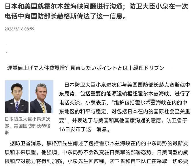 高市早苗难办了!日本不表态,美国国防部长赫格塞斯直接一通电话打到了日本,对日本施压!3月16日,根据产经新闻报道,日媒称,日本和美国就霍尔木兹海峡问题进行沟通。赫格塞斯阐述了包括霍尔木兹海峡在内的中东局势的最新发展和未来展望。并称中东局势不会改变驻日美军的部署态势,日美同盟的威慑和应对能力将得到加强。 赫格塞斯于电话中宣称:“即便中东局势乱象丛生,驻日美军的部署亦会按部就班”,同时信誓旦旦地保证,“日美同盟的威慑力必将与日俱增”。 这背后暗藏美国的算计,霍尔木兹海峡堪称全球20%石油的“海上命脉”,其在美国“印太战略”与中东布局中起着关键的联动作用,是美国精心谋划的重要一环。 美国巴不得日本不仅在军事上配合,外交上也明着支持对伊朗强硬,搞个“美日联合威慑”,把伊朗压得死死的。 高市早苗这会儿头都大了,日本国内老百姓压根儿不想掺和中东冲突,一来,日本80%的原油进口靠中东,霍尔木兹海峡一堵,日本经济直接“断气”。 其二,受日本宪法第九条掣肘,军事行动多有受限,若过度配合美国,国内和平主义势力定会群情激愤、强烈反对,届时恐引发轩然大波。 更令人头疼的是,日本于中美之间施展平衡之术,在中东问题上,它全然无意选边站队,小心翼翼,唯恐得罪任何一方。 这通电话尽显日本在美日同盟中的尴尬处境,美国妄图以“同盟管理”将日本拖入中东泥潭,而日本却不得不小心翼翼地在“同盟义务”与“国家利益”之间艰难平衡,如履薄冰。 别看日本近期大力鼓吹“自主防卫”,积极研发远程导弹、强化西南诸岛防御部署,然而在中东事务上,其依旧难以摆脱对美国的依赖,仍需依仗美国的支持。 美日同盟正由“美国主导”向“相互依存”转变,在半导体、稀土等关键领域,日本对美国技术依赖渐弱,而美国在亚太的军事部署,却仍高度仰仗日本基地。 这种互相“拿捏”的关系,让日本在霍尔木兹海峡问题上的表态更有分量,它不光关乎中东安全,更可能改写美日同盟的未来。 高市早苗接这通电话,本质是美日同盟的“压力测试”,日本的外交困境,就是小国在大国博弈里的生存智慧,既不能全倒向一边,又得在关键问题上亮立场。 真正的战略自主,绝非简单的“选边站”,它需凭借多元外交、经济合作与安全对话,构建一个有章可循、秩序井然的国际格局,如此方为正道。 当日本在美日同盟里多争点话语权,当美国明白“同盟管理”得顾着伙伴利益,当全球能源安全从“单边依赖”转向“多元共治”。 霍尔木兹海峡才不会成地缘冲突的“火药桶”,反而能成合作共赢的“新纽带”,这通电话,说不定就是美日同盟“重新定义”的起点,不是光施压妥协,而是规矩重构里的动态平衡。