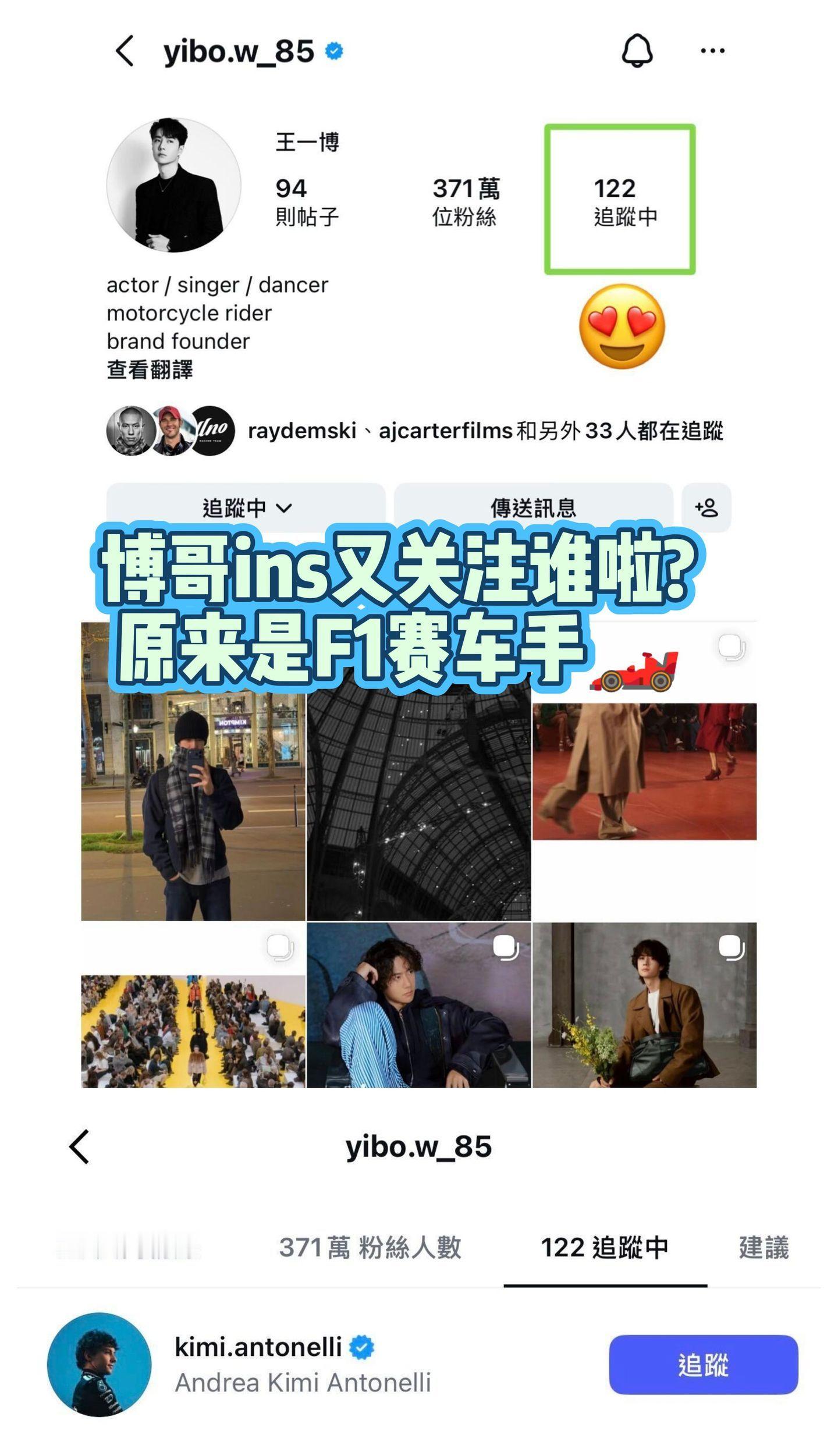 王一博ins关注F1赛车手,慕强博博,感觉又会成为新的好友圈