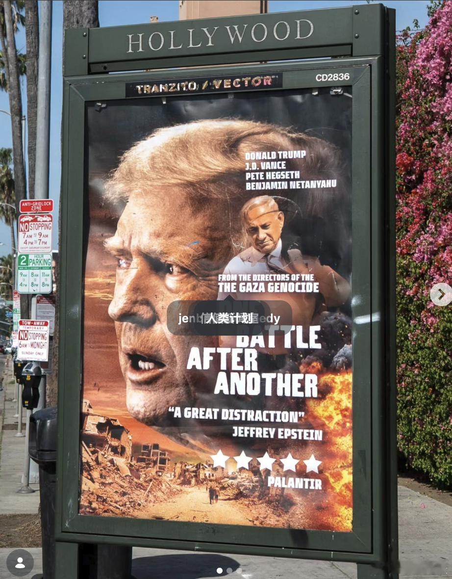 (每日野兽)在奥斯卡颁奖典礼开始前几个小时,洛杉矶日落大道上出现了嘲讽美国总统唐纳德·特朗普并谴责美以对伊战争的电影海报。