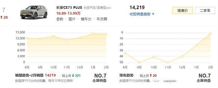 月初,长安汽车公布2月份销量,逆势上涨……,我有点不信。 现在分车型销量,CS75PLUS月销排名,提升了20个名次,排到第7位,月销14219辆。星越L,CR-V等老对手,都甩在身后了。 说明,大家对这款车,还是非常认可的。春节,高速路上,能看到从第一代到第四代的CS75,都在路上跑。是传承,也是质量可靠的体现。