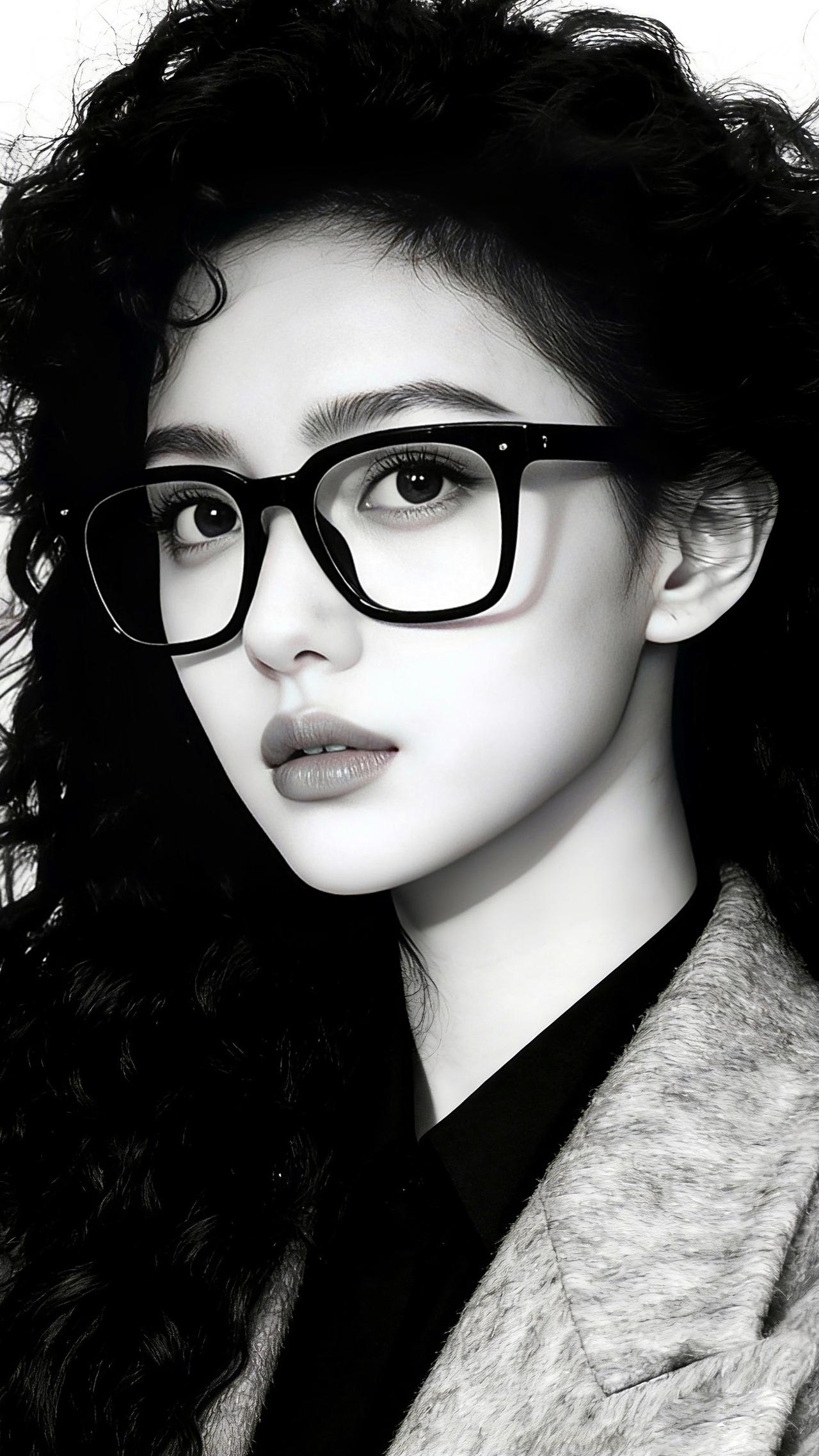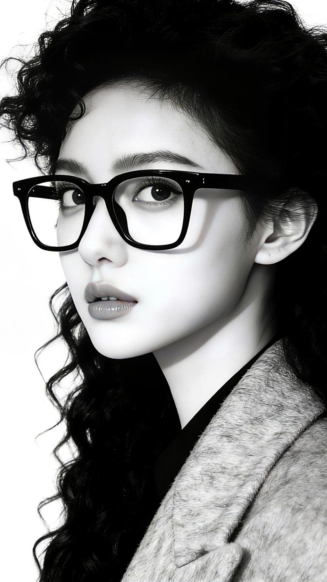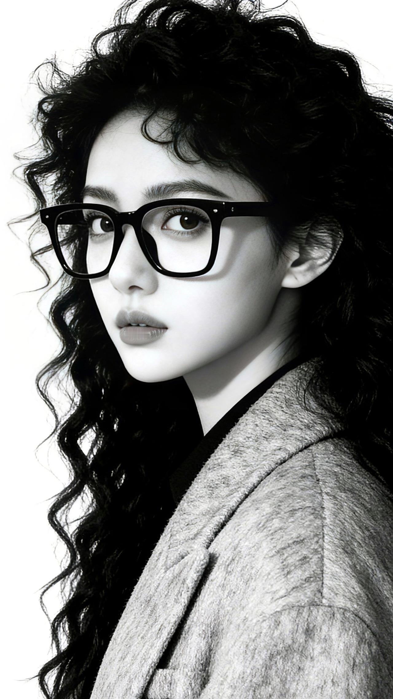 九帧同绘知性卷发仙。黑框眼镜添书卷气,卷发如瀑流光垂肩,灰呢外套衬玉骨。纯白背景