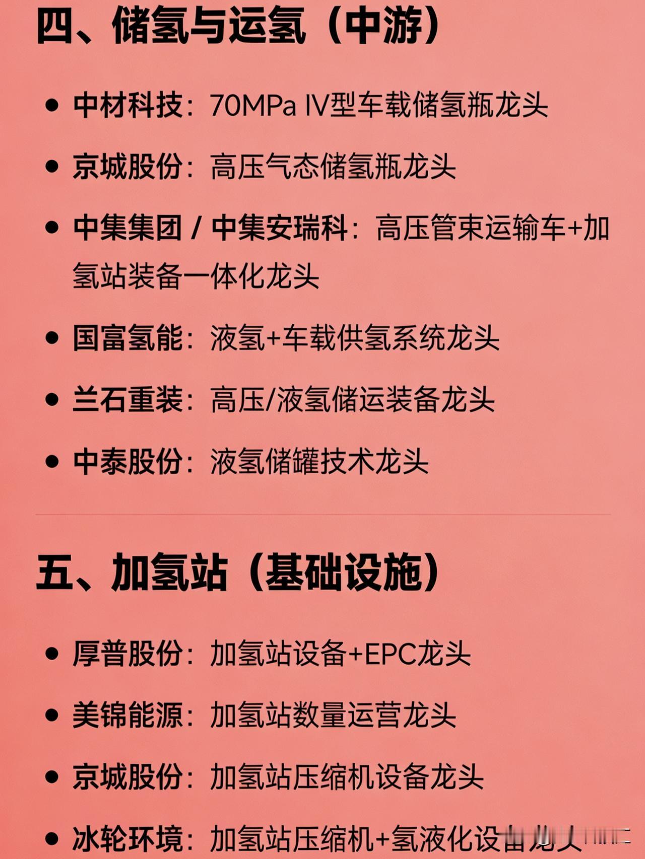 最新的氢能源概念核心龙头企业分类汇总 一、燃料电池系统(应用端核心) 亿华通:燃料电池系统龙头 潍柴动力:氢燃料电池重卡系统龙头 重塑能源:商用车燃料电池系统领先企业 雄韬股份:电堆与膜电极技术布局龙头 二、整车与应用 福田汽车:氢能重卡/客车量产龙头 中国重汽:氢能源重卡整车集成龙头 美锦能源:燃料电池整车(飞驰科技)控股方,全链条协同 三、制氢(上游) 电解槽设备: 阳光电源:碱性+PEM电解槽双路线龙头 隆基绿能:ALK电解槽产能全球领先 双良节能:电解槽制造成本控制龙头 华电重工:央企绿氢EPC+电解槽自研龙头 东方电气:碱性+PEM电解槽全技术路线龙头 石化机械:中石化系电解槽装备龙头 绿氢运营: 宝丰能源:绿氢规模化应用龙头 中国石化:“油转氢”全产业链龙头 吉电股份:绿色氨醇项目运营龙头 四、储氢与运氢(中游) 中材科技:70MPa IV型车载储氢瓶龙头 京城股份:高压气态储氢瓶龙头 中集集团 / 中集安瑞科:高压管束运输车+加氢站装备一体化龙头 国富氢能:液氢+车载供氢系统龙头 兰石重装:高压/液氢储运装备龙头 中泰股份:液氢储罐技术龙头 五、加氢站(基础设施) 厚普股份:加氢站设备+EPC龙头 美锦能源:加氢站数量运营龙头 京城股份:加氢站压缩机设备龙头 冰轮环境:加氢站压缩机+氢液化设备龙头 六、核心材料与零部件 贵研铂业:燃料电池催化剂龙头 雪人股份:燃料电池空压机龙头 昇辉科技:制氢设备+参股膜电极/电堆企业,打通材料闭环 七、全产业链布局 美锦能源:唯一覆盖“制-储-运-加-燃料电池-整车”全链条龙头 中国石化:国家队全环节协同龙头