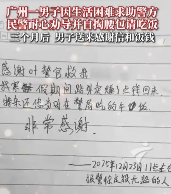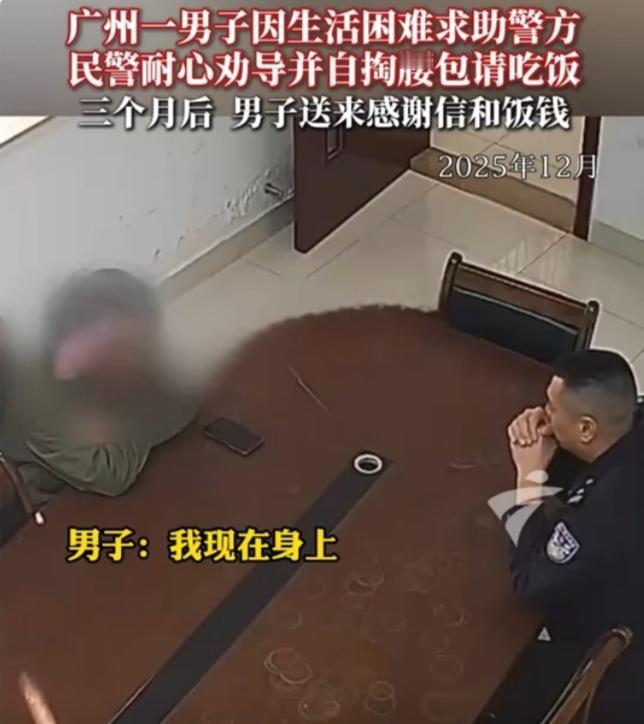 一顿派出所的饭,暖了一座城:你落魄时被温柔以待,翻身时不忘感恩 男子走投无路向广州警方求助,警察开导后还请他吃了一顿饭,男子3个月后专程到派出所还钱。 谁都有过兜里掏不出30块、站在街头连饭都吃不上的绝境。那天他刚遭遇车祸,身无分文,走投无路才走进派出所,低着头,话都说不出口。换作别人,可能敷衍两句就打发走,可广州这位民警没有。他没有摆架子,没有冷言冷语,只是轻声安慰:“你只是一时绕不过来,别急,我请你吃饭。” 一碗热饭、几句掏心窝的开导,在旁人眼里不值一提,却成了压垮绝望的最后一根稻草。男子当场红了眼,那顿饭,吃的不是温饱,是被尊重、被看见、被拉一把的底气。他没说什么豪言壮语,只把这份暖,死死记在心里。 三个月后,他穿着干净衣服,揣着跑外卖赚来的钱,专程回到派出所,一定要还上那顿饭钱。他说:“没有那顿饭,我可能真的撑不下去。”民警笑着摆手,他却执意要给。这一来一回,不是钱的事,是人心换人心,是善良有回响。 我们总说世道冷漠,可总有人在你最难时,递上一碗热饭;总有人在你低头时,轻轻扶你一把。这世上最打动人的,从来不是惊天动地的大事,而是落魄时不被嫌弃,低谷时被温柔接住,翻身时不忘感恩。 广州这座城,因为这一顿饭、这两个人,突然更暖了。你有没有被陌生人温柔治愈的瞬间?评论区说说,让我们相信,善良永远不会被辜负。 民警传递的温暖 人间温柔暖