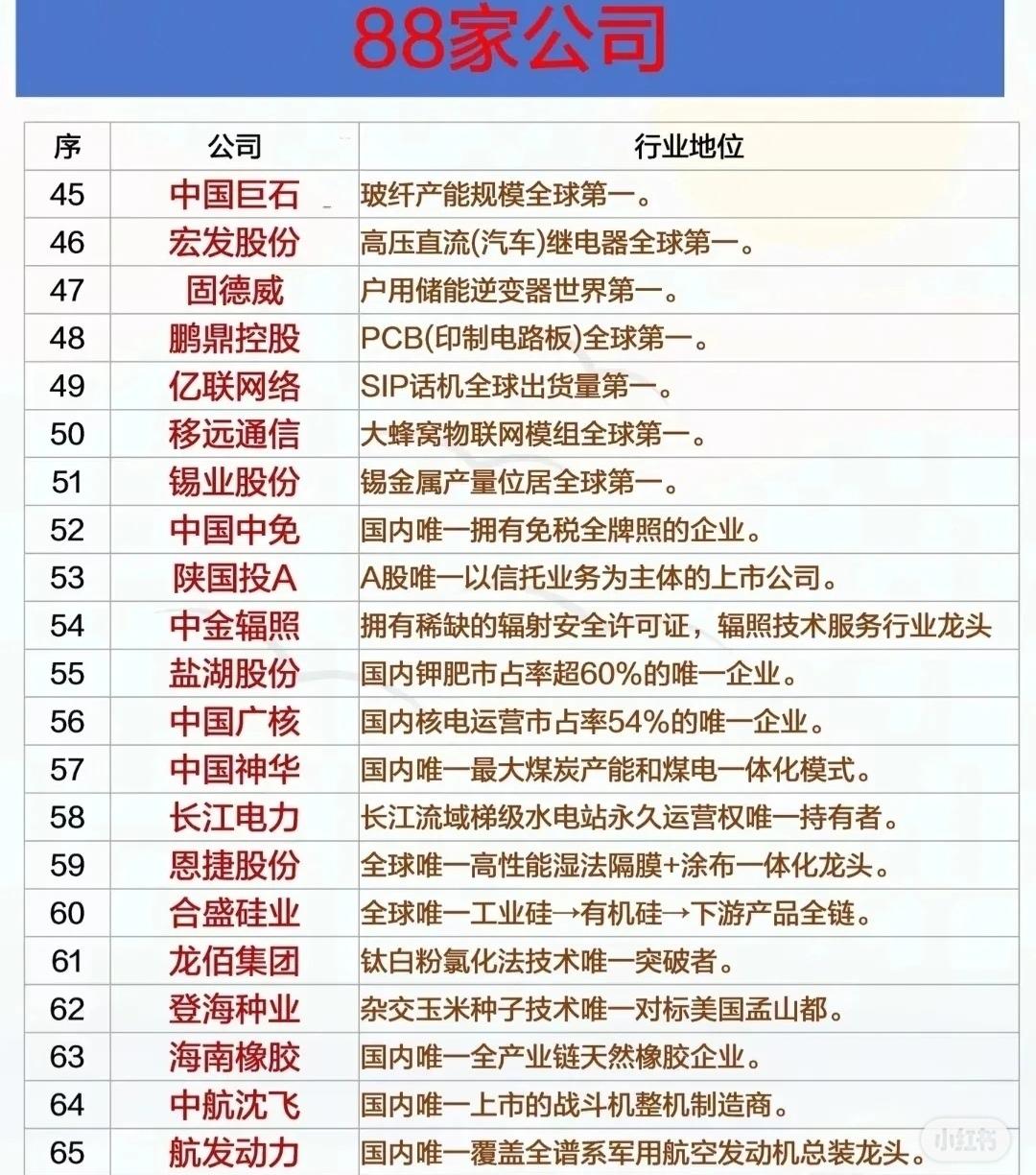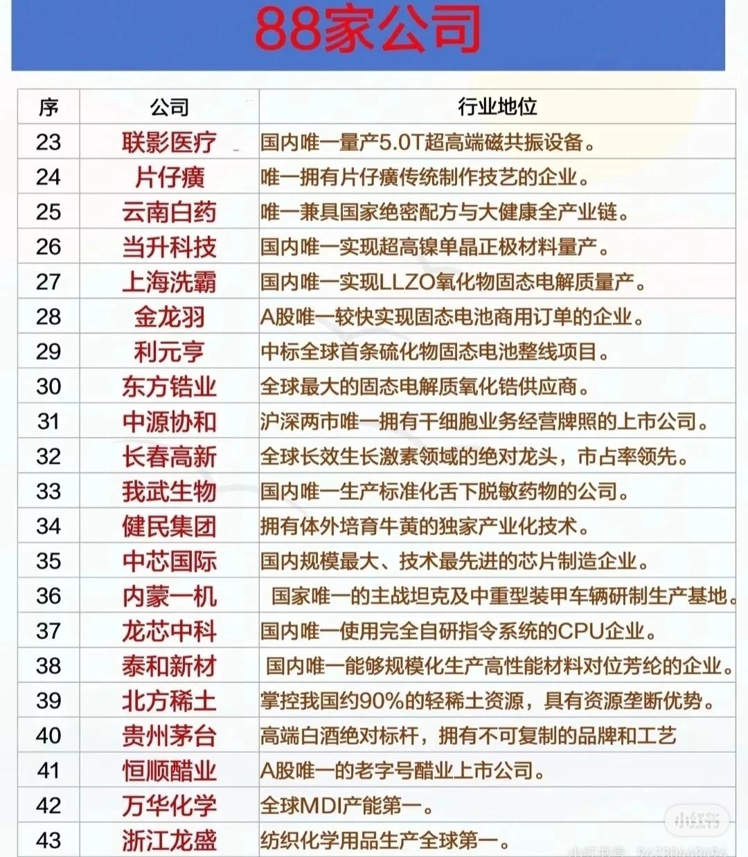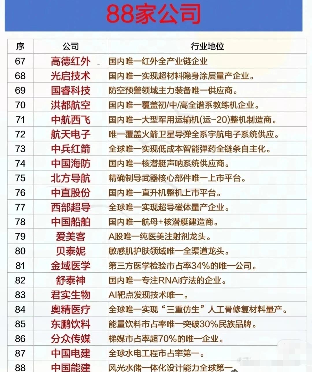 88家中国公司: 一、半导体与人工智能 - 寒武纪:云端AI芯片唯一自主架构,算力全球前三。 - 中科曙光:中国超算行业龙头,液冷数据中心领导者。 - 金山办公:国产办公软件市占率第一的唯一企业。 - 澜起科技:DDR5芯片全球市占率46%的唯一中国企业。 - 中微公司:国内唯一5nm刻蚀设备制造商。 - 科大讯飞:中文语音技术全球领先的唯一企业。 - 华大九天:国产EDA工具市占率超50%的唯一企业。 - 景嘉微:国产GPU芯片设计龙头和唯一量产企业。 - 龙芯中科:国内唯一使用完全自研指令系统的CPU企业。 - 中芯国际:国内规模最大、技术最先进的芯片制造企业。 - 中微半导:国内唯一量产28nm及以下芯片全流程湿法设备。 - 矽电股份:半导体探针台国内市占率超60%的唯一企业。 - 至纯科技:国内唯一供28nm及以下芯片全流程湿法设备。 二、高端制造与新材料 - 润泽科技:国内唯一实现整体纯液冷智算中心商业交付。 - 华海清科:国内唯一量产12英寸CMP抛光设备的企业。 - 新莱应材:国内唯一量产半导体级真空阀门/管路系统。 - 秦川机床:全球唯一定制Figure机器人三合一驱动模组。 - 东方锆业:全球最大的固态电解质氧化锆供应商。 - 泰和新材:国内唯一能够规模化生产高性能材料对位芳纶的企业。 - 北方稀土:掌控我国约90%的轻稀土资源,具有资源垄断优势。 - 恩捷股份:全球唯一高性能湿法隔膜+涂布一体化龙头。 - 合盛硅业:全球唯一工业硅→有机硅→下游产品全链。 - 龙佰集团:钛白粉氯化法技术唯一突破者。 - 西部超导:全球唯一实现超导磁体量产企业。 - 高德红外:国内唯一红外全产业链企业。 - 光启技术:国内唯一实现超材料隐身涂层量产企业。 三、医疗健康与生物科技 - 恒瑞医药:国内唯一拥有19款1类创新药上市。 - 药明康德:全球唯一端到端CRDMO平台。 - 联影医疗:国内唯一量产5.0T超高端磁共振设备。 - 片仔癀:唯一拥有片仔癀传统制作技艺的企业。 - 云南白药:唯一兼具国家绝密配方与大健康全产业链。 - 我武生物:国内唯一生产标准化舌下脱敏药物的公司。 - 健民集团:拥有体外培育牛黄的独特产业化技术。 - 中源协和:沪深两市唯一拥有干细胞业务经营牌照的上市公司。 - 长春高新:全球长效生长激素领域的绝对龙头,市占率领先。 - 爱美客:A股唯一纯医美注射剂龙头。 - 贝泰妮:敏感肌护肤领域唯一全渠道龙头。 - 金域医学:第三方医学检验市占率34%的唯一公司。 - 舒泰神:国内唯一专注RNAi疗法的企业。 - 君实生物:AI靶点发现技术唯一。 - 奥精医疗:全球唯一实现“三重仿生”人工骨修复材料量产。 四、新能源与储能 - 当升科技:国内唯一实现超高镍单晶正极材料量产。 - 上海洗霸:国内唯一实现LLZO氧化物固态电解质量产。 - 金龙羽:A股唯一较快实现固态电池商用订单的企业。 - 利元亨:中标全球首条硫化物固态电池整线项目。 - 固德威:户用储能逆变器世界第一。 - 中国电建:全球水电工程市占率第一。 - 中国能建:风光水储一体化设计能力全球第一。 五、军工与航天航空 - 国盾量子:航母编队量子密钥分发系统唯一供应商。 - 内蒙一机:国家唯一的主战坦克及中重型装甲车辆研制生产基地。 - 中航沈飞:国内唯一上市的战斗机整机制造商。 - 航发动力:国内唯一覆盖全谱系军用航空发动机总装龙头。 - 洪都航空:国内唯一覆盖初/中/高全谱系教练机企业。 - 中航西飞:国内唯一大型军用运输机(运-20)整机制造商。 - 中国海防:国内唯一核潜艇声呐系统供应商。 - 北方导航:精确制导武器核心部件唯一上市平台。 - 中直股份:国内唯一直升机整机上市平台。 - 中国船舶:国内唯一航母+核潜艇建造商。 - 航天电子:唯一覆盖火箭卫星导弹全系宇航电子系统供应。 - 中兵红箭:全球唯一实现低成本智能弹药全链条自主化。 - 国睿科技:防空预警领域主力装备唯一供应商。 六、消费与品牌 - 贵州茅台:高端白酒绝对标杆,拥有不可复制的品牌和工艺。 - 恒顺醋业:A股唯一的老字号醋业上市公司。 - 东鹏饮料:能量饮料市占率唯一突破30%民族品牌。 - 分众传媒:梯媒市占率超70%的唯一企业。 - 万华化学:全球MDI产能第一。 - 浙江龙盛:纺织化学用品生产全球第一。 - 中国巨石:玻纤产能规模全球第一。 - 宏发股份:高压直流(汽车)继电器全球第一。 - 鹏鼎控股:PCB(印制电路板)全球第一。 - 亿联网络:SIP话机全球出货量第一。 - 移远通信:大蜂窝物联网模组全球第一。 - 锡业股份:锡金属产量位居全球第一。 - 中国中免:国内唯一拥有免税全牌照的企业。