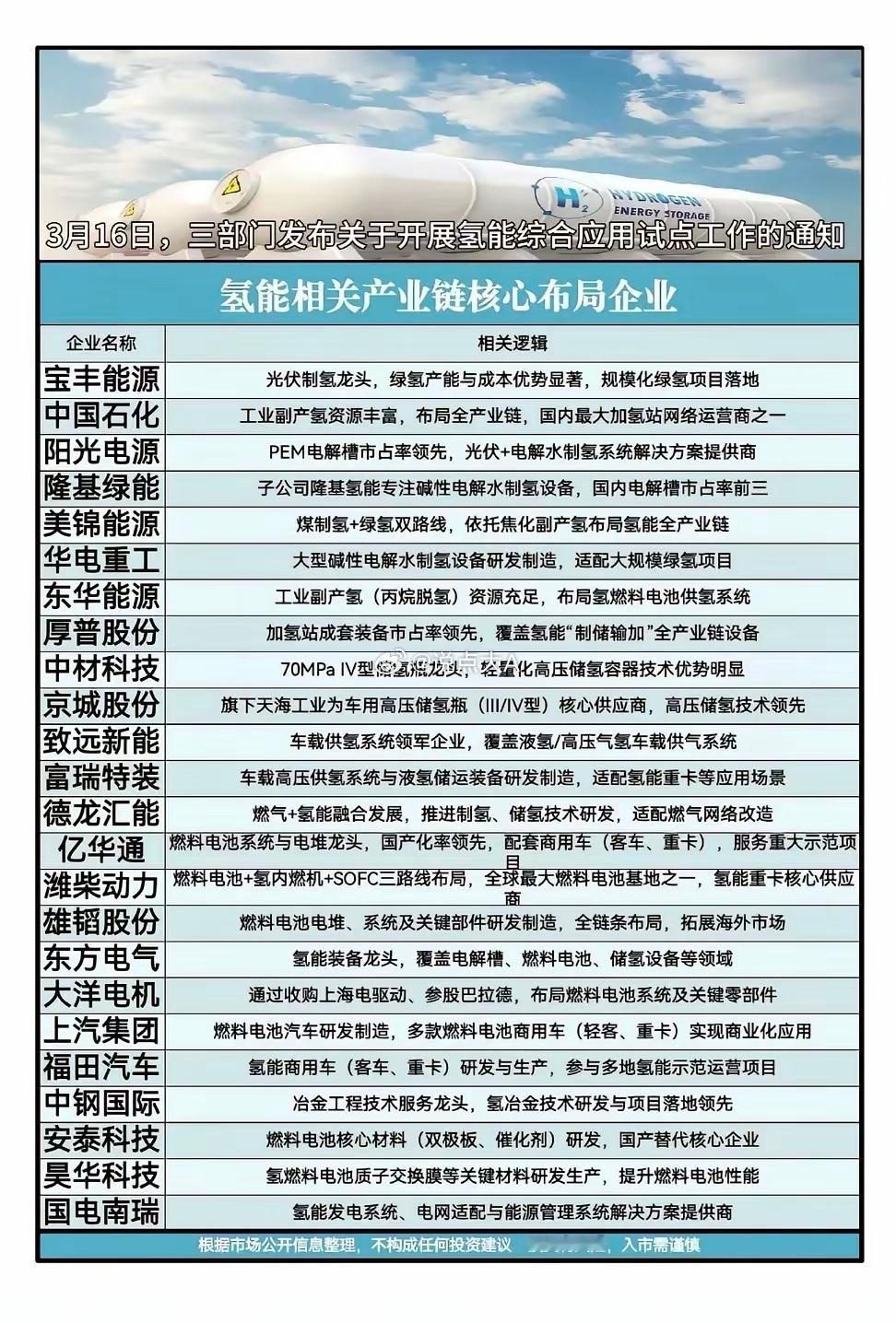 政策利好,氢能与非化石能源赛道迎黄金布局期!3月16日三部门氢能试点通知落地,叠加“十五五”非化石能源倍增行动,能源革命浪潮正加速袭来。从绿氢生产、储运装备到燃料电池应用,从可控核聚变、风光水到氢能全产业链,核心上市公司图谱清晰浮现。美锦能源、京城股份等氢龙头蓄势待发,厚普股份、亿华通等装备与系统企业各领风骚,非化石能源赛道的长期价值正在被重估。把握能源转型主线,挖掘清洁低碳时代的核心成长机遇。⚠️ 风险提示:市场有风险,投资需谨慎,本文不构成任何投资建议。
