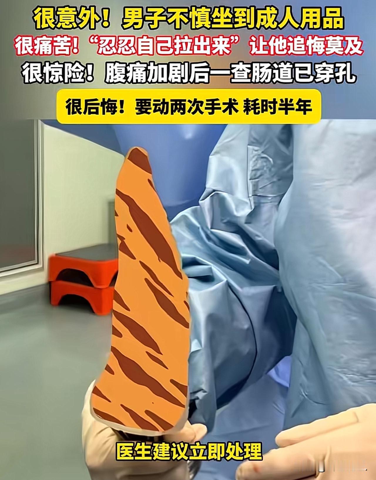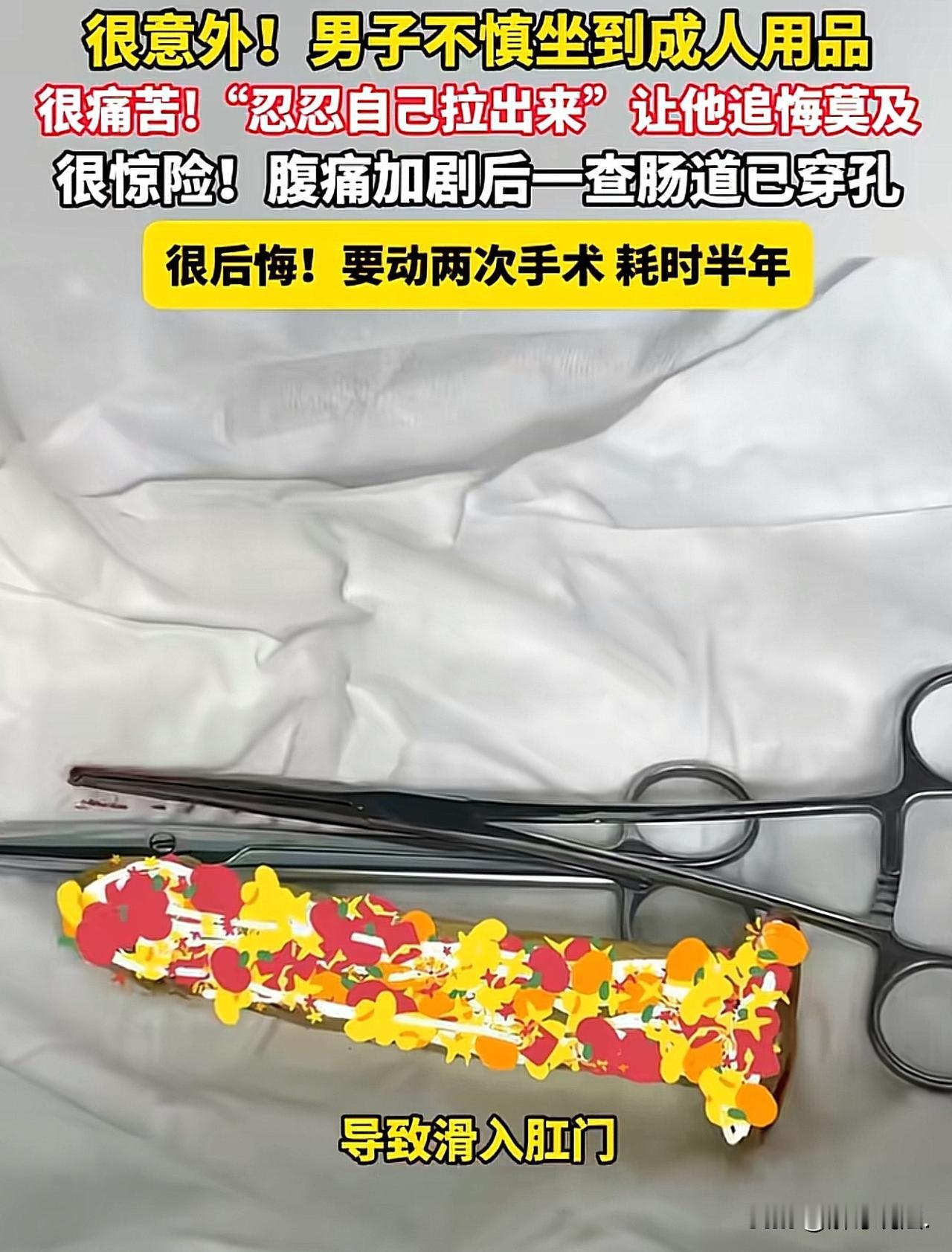 “笑不活了!”广东深圳,男子不小心,一屁股坐在了成人用品上,说来也巧,正好怼进了肛门里,男子疼得嗷嗷直叫,赶紧去医院就诊,医生告诉他要进行处理,男子一听要花钱,有点心疼,想想还是算了吧,说不定回家拉几天就出来了。可谁知,越挺越大发,3日后,竟导致肠道穿孔。医生告诉他要做两次手术才能取出,还要挂个粪袋。男子肠子都悔青了!网友闹调侃:还好没坐啤酒筐上,要不啤酒就少一瓶了! 男子第二次被家人送到医院时,整个人已经疼得直不起腰,脸色惨白,还发着高烧。 医生做完检查,脸色当场就沉了下来,严肃地告诉他,异物在体内卡得太久,已经把直肠戳破,引发了严重感染,再晚来一步可能危及生命。 当下必须立刻手术,而且因为肠道破损严重,只能先做造口手术,肚子上要开个口,临时挂着粪袋生活,等三到六个月后,还得再做一次回纳手术,把肠道接回去。好好一个人,要遭两遍罪,花双倍的钱,男子懵了,悔得肠子都青了。 可这一切,全是他自己“作”出来的。 一日,他在家寂寞难耐,无意间看到角落里放着的成人用品,一时好奇手痒,就拿起来随便摆弄。 本来安安稳稳站着就没事,可他偏偏没个正形,一边玩一边乱动,结果脚下一滑,重心一歪,整个人结结实实、重重地坐了下去。 这一坐,直接把他疼得嗷嗷叫,屁股像被尖锐东西狠狠扎透一样,剧痛瞬间传遍全身。 他伸手一摸,当场吓傻,那个东西竟然直接滑进了肛门里,只露出一小截在外面,想拔都不敢用力。 男子又疼又慌,冷汗哗哗往下流,腿都软了,不敢耽误,赶紧穿上衣服,一路煎熬着赶到医院。 可到了医院,一听医生说需要手术、还要花一笔钱,他立马心疼起来,觉得太贵太冤枉。 他自作聪明,觉得不就是个异物吗,吃点泻药多拉几次,肯定能自己排出来,何必花那钱做手术。医生拼命劝他,说异物形状特殊,自行处理非常危险,可他一句也听不进去,执意离开了医院。 回到家,他直奔药店,一口气买了好几盒泻药,回家就猛吃起来,吃完就守在厕所里死磕,一蹲就是好几个小时,拉得腿软脚麻、肚子空空,可那异物纹丝不动。 接下来三天,他更是脑洞大开,又是自己灌肠,又是拼命挤压肚子,各种土办法用了个遍,结果东西没排出来,身体先垮了。 肚子越来越疼,高烧一直不退,人虚弱得连站都站不稳,家人一看情况不对,强行把他架去医院。 这一查,才出现了开头那吓人的一幕。躺在手术台上,男子一句话都说不出来,只剩满心的后悔。 本来花点钱、及时处理就能解决的小事,因为贪小便宜、自作聪明,最后差点把命搭进去,又遭罪又花钱,还留下一堆麻烦。 《民法典》第1004条规定:自然人享有健康权,自然人的身心健康受法律保护,任何组织或者个人不得侵害他人的健康权。 本案中,男子因自身疏忽与固执,导致直肠破裂、严重感染,身体器官与生理机能受损,直接侵害了自身的健康权。 健康权是公民最基本的权利,不仅要防范他人侵害,更要对自己负责。 盲目自救、延误治疗,会造成不可逆的身体伤害。这也提醒大家,身体出现危险状况时,要及时就医、科学处置,守住自己的健康底线,避免因一时糊涂酿成大祸。 这件事也给所有人提了个醒:身体出了问题,千万别硬扛、别瞎折腾,更别为了省钱耽误治疗,不然最后吃亏的,只能是自己。 此事曝光后,网友纷纷调侃: 不小心还坐的这么准吗?自己正好没穿裤子,正好就坐了上去,正好坐进去了,正好还出不来了,明天敢快去买彩票吧,也许正好买个百万富翁,也算补偿吧! 这有点过分了,人家就是怕人知道。医院还叫上记者了。