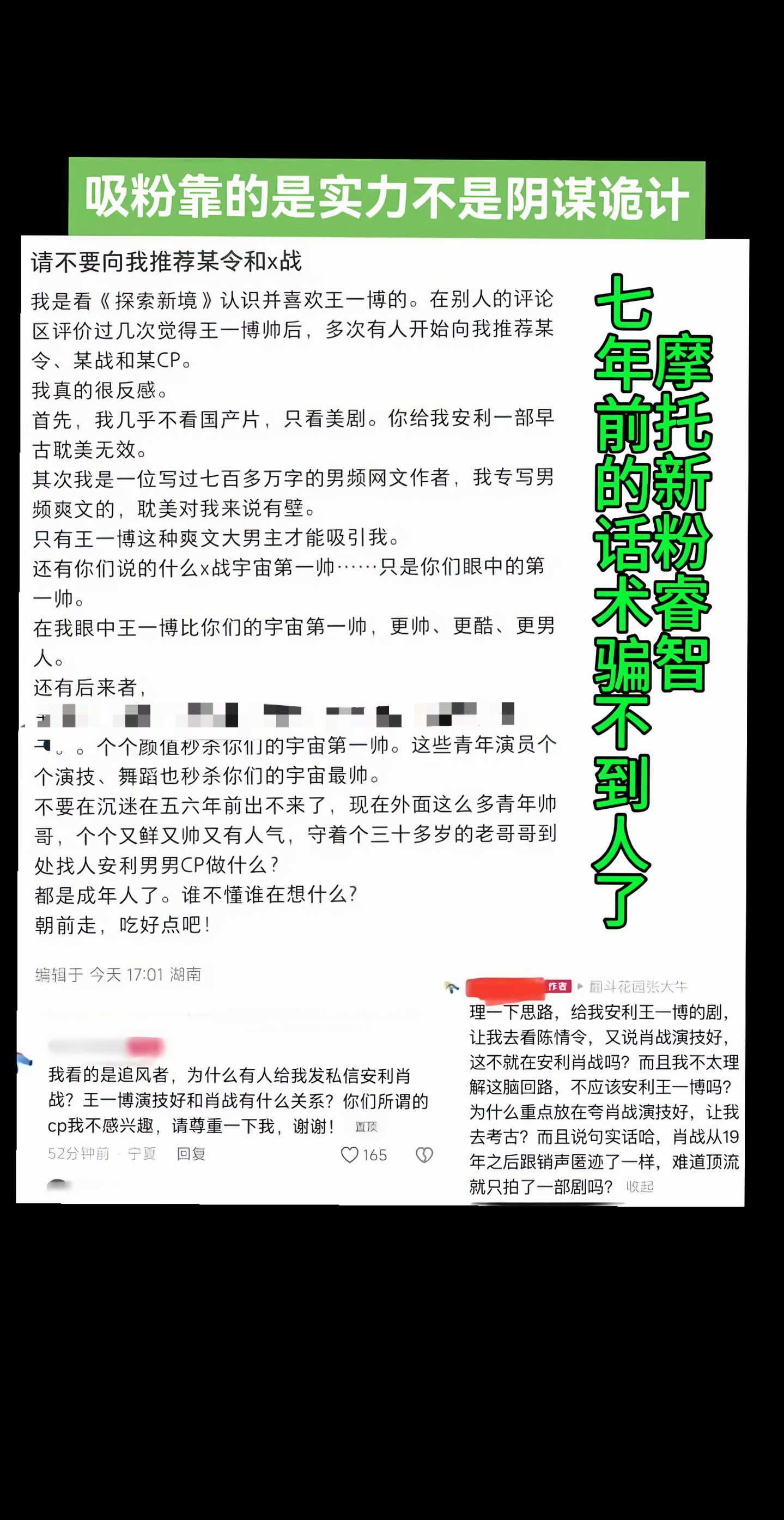 自从全平台造💊埋线无果后又走回了老套路,给人粉丝私信,不过幸好新粉路好路人老摩托姐姐信任度很高也有自己的判断力。不过还是注意一下,毕竟连我这种yxh都被她们私信发汇总说让我看看 最近卖票卖的好把她们急哭了