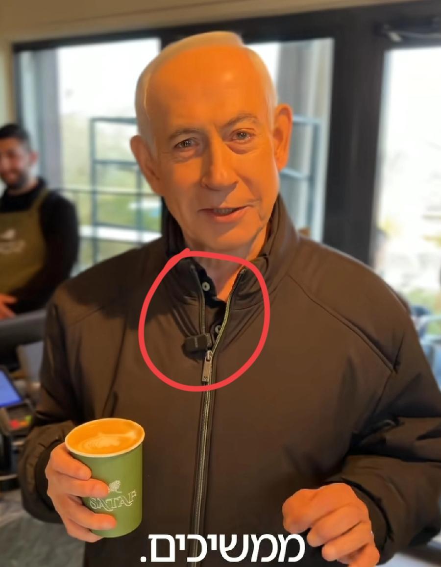 内塔尼亚胡,喝咖啡与爬山观光,两张照片对比,内塔每天睡觉不脱衣服,穿着外套睡觉吗?隔天外出不换衣服,外套衬衣同一套就算了,拉链位置、衬衣领口皱的形状、胸口迷你话筒位置,都一模一样一丝丝没动!太巧了吧?!打仗血雨腥风,还有闲心到店喝咖啡?爬山春游?内塔真可以!