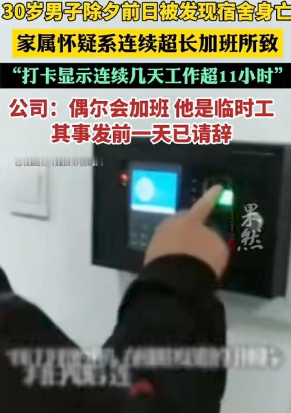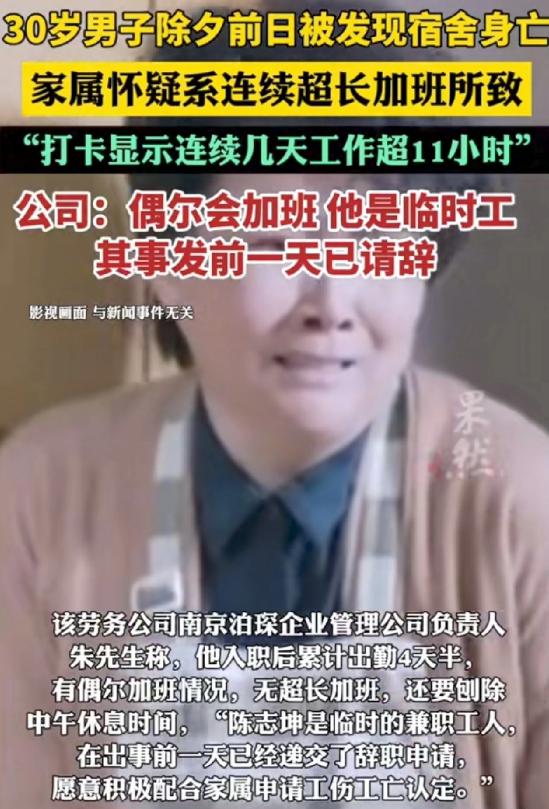 江苏南京,30岁男子外出打工时,竟在宿舍突然去世,家属悲痛之余,在男子手机上发现了他的打卡记录,显示他连续四天工作都超过11小时。男子家属认为,是如此高强度的连续加班,导致他身体扛不住,才引发疾病走了的,所以,家属要求公司赔偿,万万没想到,公司竟表示∶他是临聘人员,且事发前一天已请辞,网友∶哪有这么巧的事? 江苏南京,一位还没满31岁的男子,在外打工时突然没了性命,事发地点就在公司安排的员工宿舍里,家属赶到南京时,只剩下无尽的悲痛,可谁也没想到,翻遍男子手机后,一段打卡记录,让这场意外变得格外蹊跷。 这位男子叫陈志坤,老家在湖北十堰,父母都是普通农村人,没什么文化,平时只能靠打电话叮嘱儿子注意身体。 他早年就一直在外奔波打工,干过各种零活,今年2月初,他才入职南京一家企业管理公司,之后被派遣到另一家企业做货物分拣的工作,本来想着春节前多挣点钱,回家和父母好好过个年,没成想,这一去就再也回不去了。 事发那天是腊月二十八,离除夕就剩两天,家家户户都在忙着备年货、盼亲人回家,可陈志坤的室友,却在清晨发现他怎么叫都叫不醒,赶紧报了警。 警方赶到后,经过调查排除了刑事案件的可能,也就是说,陈志坤不是被人伤害的,可好好的一个年轻人,怎么会在宿舍突然离世? 悲痛之余,家属翻了翻陈志坤的手机,在相册里找到了他拍的打卡照片,这一看,所有人的心都沉了下去。 打卡记录清清楚楚显示,他2月6号入职后,2月11号早上7点21分上班、晚上7点07分下班,2月12号早上7点09分上班、晚上7点08分下班,就算刨去中午吃饭休息的时间,这两天的工作时长也都超过了11小时。 加上另外几天的打卡记录,连续高强度工作的痕迹一目了然,家属心里很明白,陈志坤干的是货物分拣的体力活,不是坐办公室的轻松工作,连续这么长时间高强度加班,身体肯定扛不住。 他们怀疑,就是这样没日没夜的加班,才诱发了疾病,让他丢了性命,于是,家属找到公司,提出了赔偿的要求,可公司的回应,却让他们彻底寒了心。 公司负责人说,陈志坤只是临时的兼职工人,不是正式员工,而且在事发前一天,他已经递交了辞职申请,出事的时候既不是工作时间,也不在工作地点,和公司没有关系。 除此之外,公司还说,陈志坤入职后总共就出勤4天半,不存在超长加班的情况,那些打卡记录里的时长,要刨除中午休息时间,只是偶尔加个班而已,还表示愿意配合家属申请工伤工亡认定,却只愿意给2万块钱的人道主义赔偿。 这话一出,不仅家属不能接受,网友们也炸了锅,纷纷吐槽“哪有这么巧的事”,说白了,就算是临时工,只要是在公司安排下工作,加班了就该有合理的保障,更何况是连续高强度加班。 而且刚递交辞职申请就出事,时间点太巧合,很难不让人多想,现在家属的处境也很艰难,他们手里没有完整的打卡记录,也没有劳动合同,人社部门让他们申请工伤认定,可连基本的资料都凑不齐。 其实大家心里都清楚,陈志坤大概率就是因为长期加班、身体透支才出的事,一个30岁的年轻人,本该有大好年华,却因为打工挣钱,把命搭了进去。 目前这件事还没有最终的结果,希望公司能拿出足够的诚意,提供完整的相关资料,配合调查,给家属一个公道,也给所有在外打拼的打工人一个交代。 毕竟,打工人出门挣钱不容易,不能让他们流汗又流泪,更不能让他们的付出,最后连一个合理的说法都得不到。