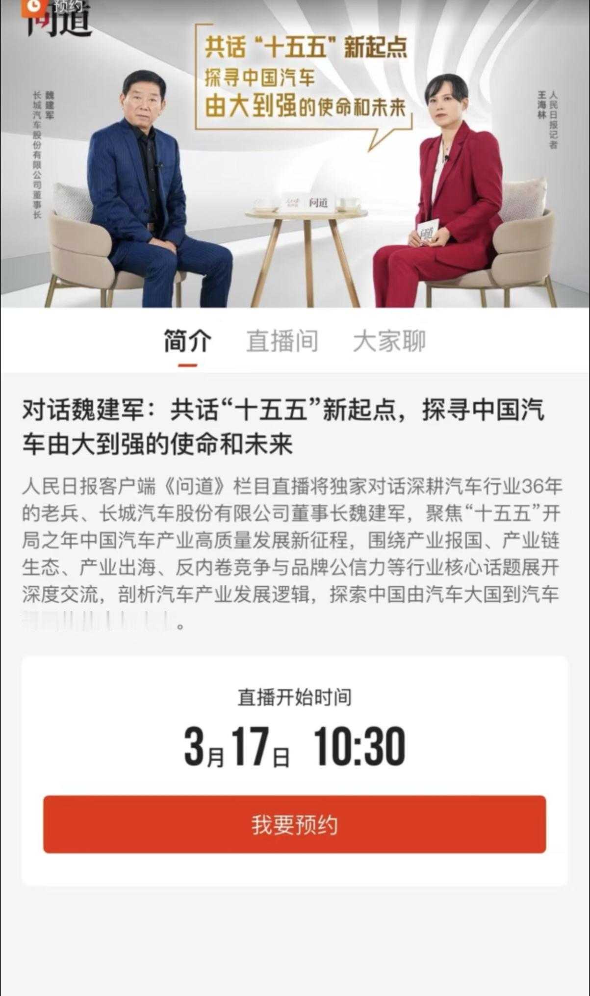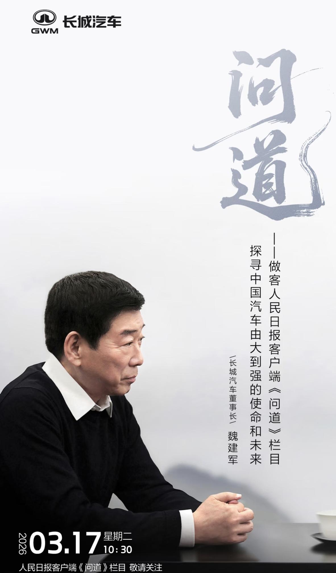 大网红魏建军又上人民日报了,实力雄厚呀! 魏建军再次登上《人民日报》,这一次是在2026年3月17日受邀参与“问道”栏目专访,正值“十五五”规划(2026-2030年)开局之际,对话主题为“共话‘十五五’新起点,探寻中国汽车由大到强的使命和未来”。从公开记录看,2025年至今他已多次获国家级媒体关注,仅2025年下半年就两次登上《人民日报》重要版面,是自主车企领袖中曝光度与话语权较高的代表。 此次专访将围绕“十五五”期间中国汽车产业的核心命题展开:一是如何从规模优势转向技术与品牌优势,破解“大而不强”的困境;二是探讨全球化布局的新路径,尤其是在海外市场的本土化运营与文化融合;三是思考智能电动时代的产业生态构建,以及如何在碳中和目标下实现绿色转型。邀请魏建军而非其他企业家,核心在于他掌舵的长城汽车是中国汽车“由大到强”的典型样本。 魏建军的核心优势体现在三方面:一是长期主义技术深耕,累计投入超百亿构建自研体系,专利数量连续三年居自主车企前列,在混动、智能底盘等领域形成壁垒;二是全球化实践领先,长城皮卡连续26年国内销量第一,海外市场覆盖170余个国家,是“生态出海”的标杆;三是战略定力突出,在价格战中坚持价值竞争,推动行业回归技术与品质本位,这种实业精神与国家汽车强国战略高度契合,使其成为探讨产业未来的理想对话者。 魏建军对话马上开始敬请期待!