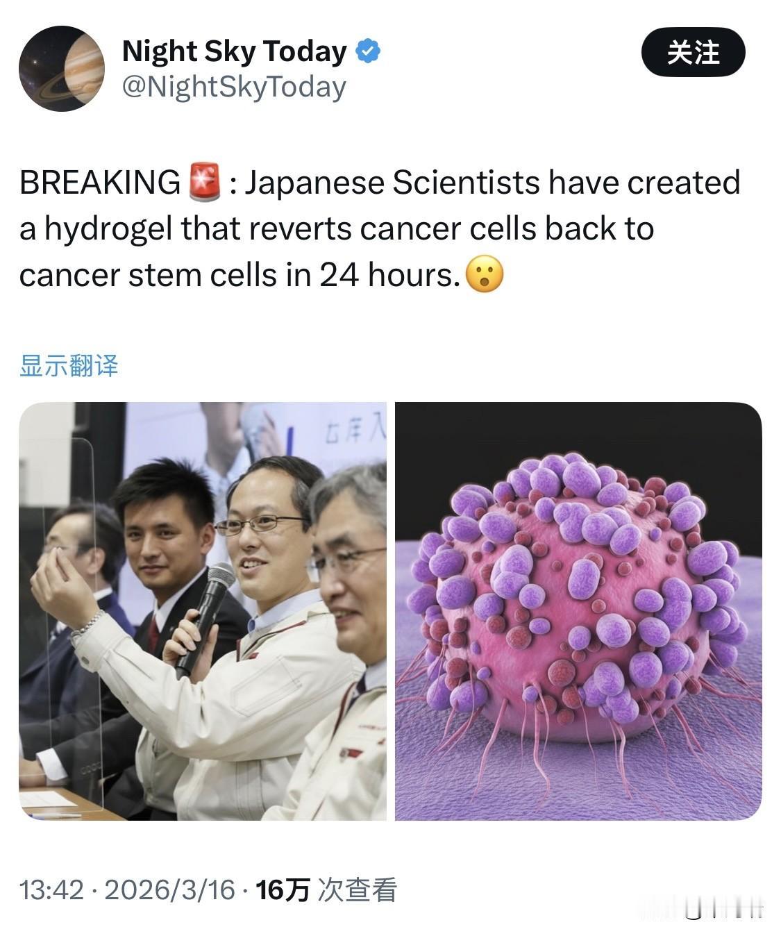突发新闻:日本科学家研制出一种水凝胶,可在24小时内将癌细胞逆转为癌干细胞。