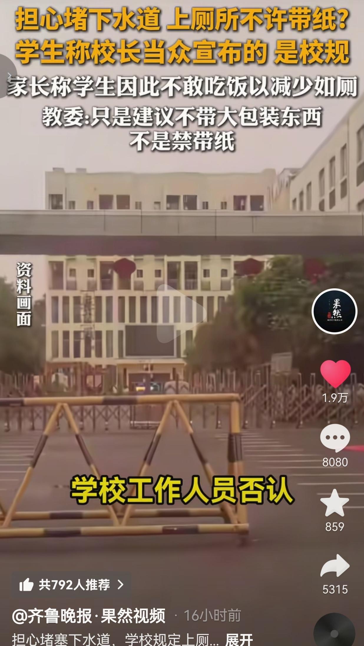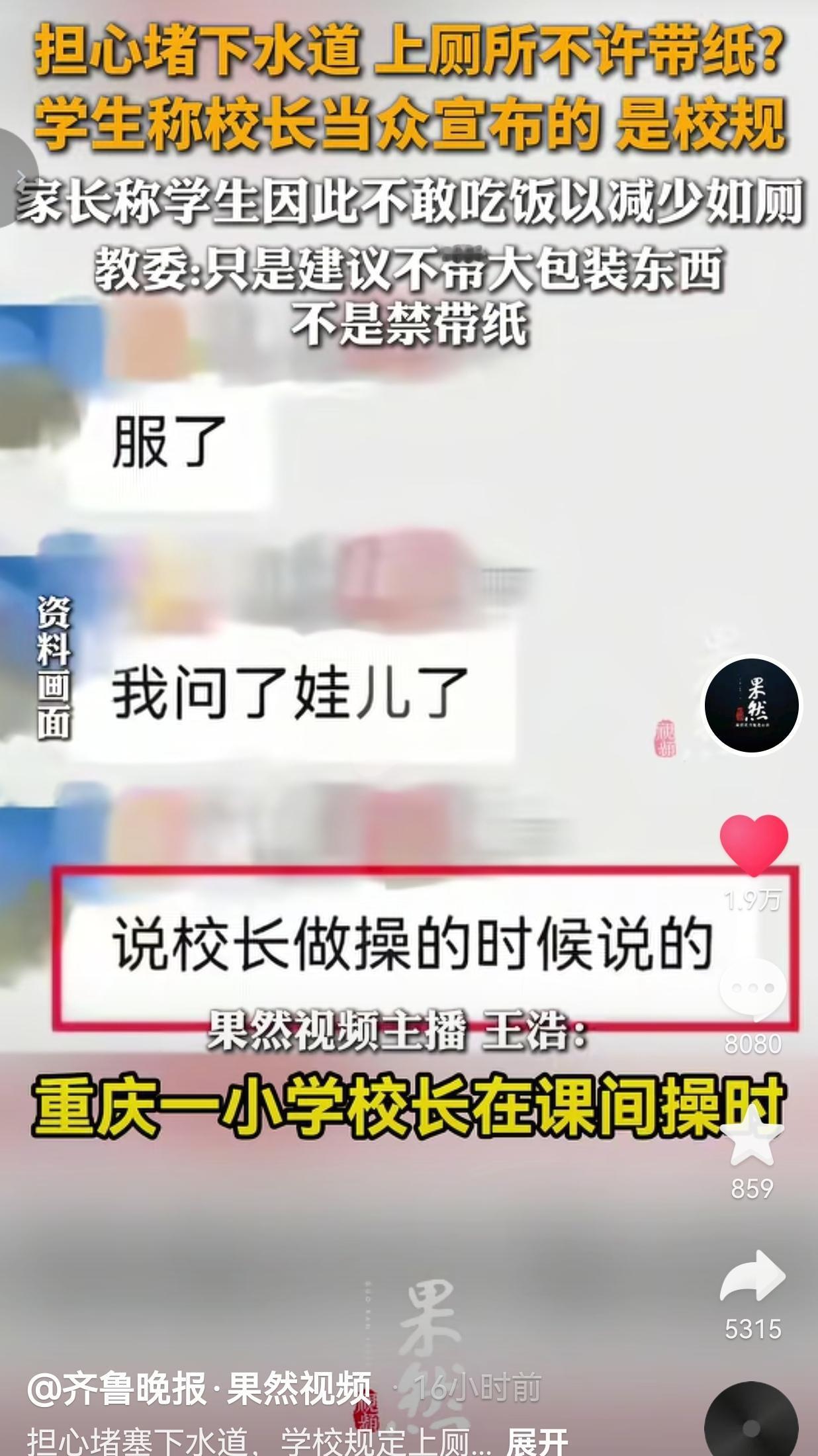 之前闹得全网炸的重庆小学“禁带厕纸”风波,终于有了反转——学校说没这规定,教委也澄清只是建议不带大包装,现在孩子能光明正大带纸,厕所也放了垃圾桶,不用再饿肚子、藏纸巾了! 事情是这样的,课间操上,校长当众宣布“上厕所不许带纸,怕堵下水道”,这话传进孩子耳朵里,直接成了必须遵守的“铁规”! 于是全校孩子陷入了绝境:有人把纸巾死死攥在衣袖、裤兜里,藏得严严实实,就怕被老师翻出来挨批评。有人干脆一口饭都不敢吃,饭盒端回家还整整齐齐,问半天才说“吃了要上厕所,没纸太丢人”;高年级女生更难熬,生理期连最基本的卫生需求都没法保障,只能缩手缩脚硬扛,连走路都不敢大动作。 家长急得跳脚,找学校求证,结果画风突变:学校工作人员否认有“禁带纸”规定,区教委也澄清“只是建议不带塑料瓶、大包装物品,不是禁带纸”!可孩子被吓的这几天、饿的这几顿饭、受的这份委屈,谁来负责? 网友看到后评论说:“谢天谢地能带纸了!但我家娃这几天都不敢喝水,怕上厕所,这种心理阴影得多久才能消?学校一句‘没这规定’就完事了?孩子的害怕不是假的!” 也有的网友说:“教育不是拍脑袋定规矩,更不是事后甩锅。哪怕只是建议,也不该让孩子以‘不敢吃饭、藏纸巾’的方式去执行!” 还有的网友说:“现在能带纸了是好事,但希望学校能给孩子一个正式的道歉,这不是小事,是对孩子尊严的尊重!” 我的心里话:教育的温度,从来不是“纠正错误”,而是“不制造错误” 说实话,看到反转,我不是解气,是更心寒。 下水道堵了,是后勤的问题,是维护的问题,从来都不是孩子的问题。校长一句“怕堵”就拍脑袋宣布“禁带纸”,本质就是怕麻烦、怕担责,不想花精力修管道、做维护,就把所有难题甩给孩子,用最粗暴的方式解决问题。 更让人无奈的是,事后学校否认、教委澄清,看似是“澄清误会”,可孩子心里的恐惧已经刻下了:他们学会了不敢吃饭、不敢光明正大带纸,学会了迎合大人的“规定”而委屈自己。 教育本该有温度,该是人性化管理,是站在孩子的角度想问题:孩子的生理需求、尊严需求,比“不堵下水道”更重要。能给孩子提供足够的纸巾、做好管道维护,才是真正的育人,而不是拍脑袋定规、事后甩锅。 最后想说:校规可以没有,但教育的底线不能丢 这件事的反转,看似是皆大欢喜,但给所有教育者敲了一记警钟:制定校规、发布要求,从来都不是一句话的事。它关联着孩子的成长、尊严和心理,不能凭一时想法就拍脑袋决定,更不能用“建议”“规定”的名义,去牺牲孩子的正常生活。 我们要的从来不是“现在能带纸了”的补救,而是以后再也不会有孩子为了“怕违规”而饿肚子、藏纸巾、硬扛生理不适;要的不是事后的澄清,是事前的尊重和考量。 教育的温度,藏在每一次对孩子需求的回应里,藏在每一次不随意的决定里,而不是事后的弥补里。 教育可以有反转,但孩子的成长没有重来;别让一时的懒政,凉了孩子最纯粹的信任! 对此,你怎么看?