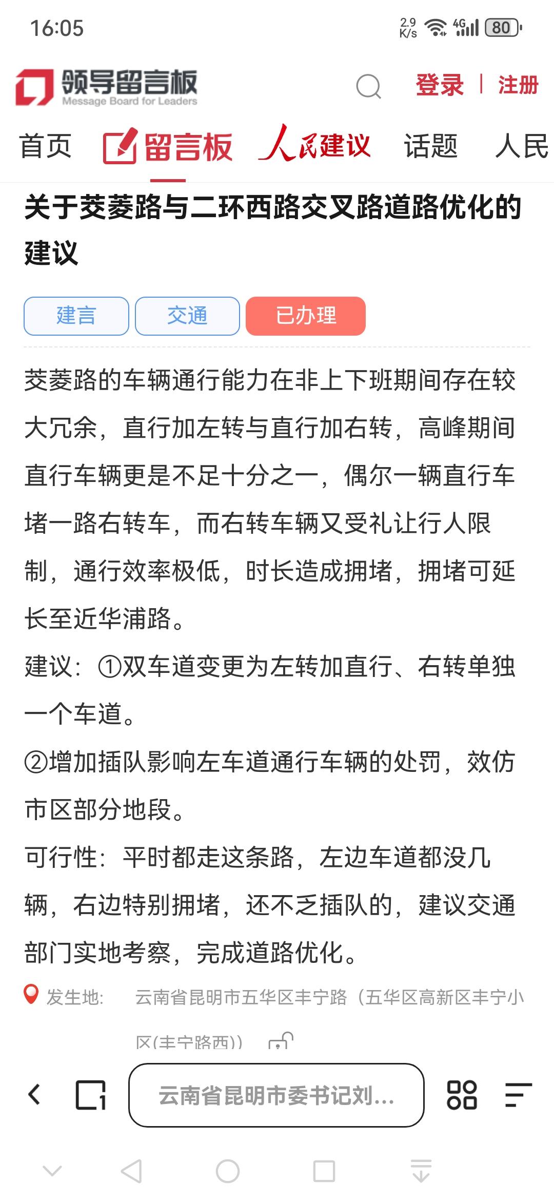 昆明网民给书记留言建议优化茭菱路与二环西路交叉口交通秩序 近日网民通过人民网领