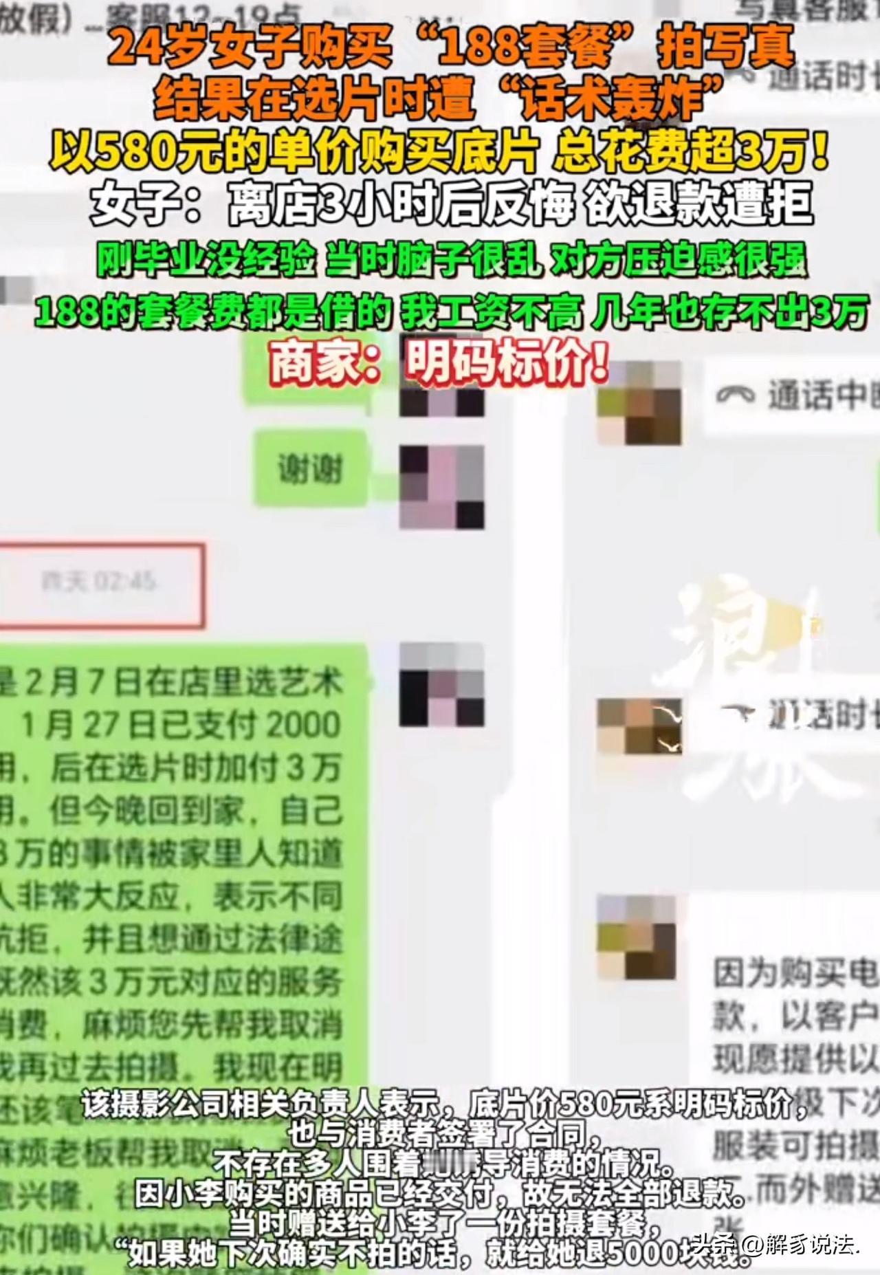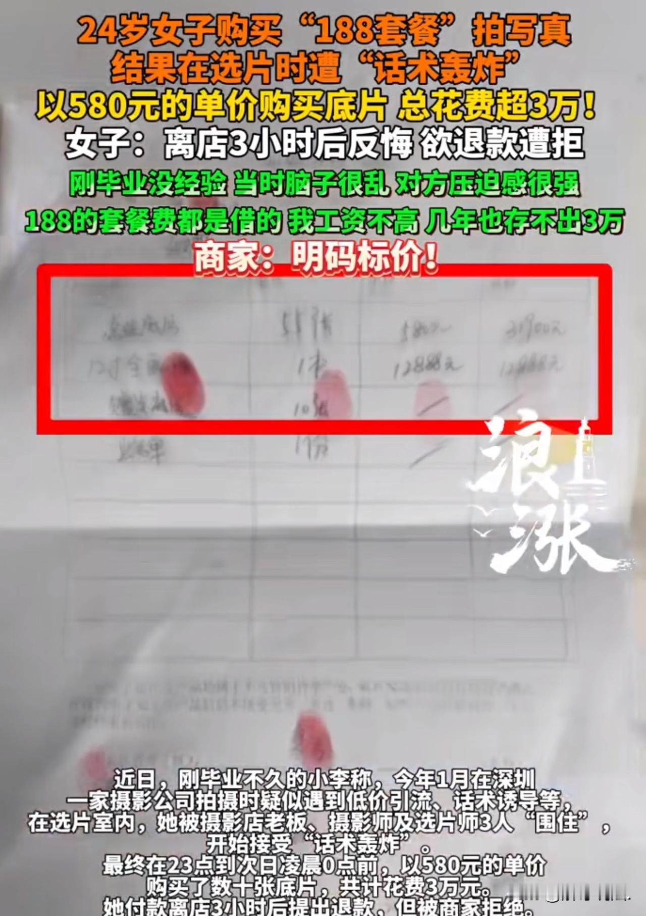 “套路太深!”深圳,24岁女子在一家影楼花2000元拍摄写真,谁知,在选片的时候,特意将其和朋友分开。期间,老板、摄影师、选片师三个人围着她,轮番轰炸,向她推销底片。女子头脑一人,就刷了信用卡,支付了3万元,购买55张底片。女子离开影楼3小时,就后悔了,要求商家退款,商家称,底片已经交付,没法退款。并一口咬定,已经明码标价。女子一气之下,向相关部门投诉。结果,相关部门经过核查后,不予立案。 24岁的小李在深圳一家摄影店拍写真,原本只想拍个便宜套餐,最后稀里糊涂花了3万块。 她回到家后,越琢磨越不对劲,觉得自己当了冤大头。 她赶紧找商家要退款,前后也就刚过期3个小时,可对方一口回绝,说底片已经交付,没法退,顶多给她换个方案,要么升级下次拍摄,要么多送几张底片,就是不肯退钱。 事情要从今年1月说起,小李在网上看到广告,188元就能拍两套写真,觉得很划算就咨询了店家,之后去了深圳Ingenuity摄影拍照。 到店之后,销售根本不怎么提这个低价套餐,反而说活动套餐衣服少、底片也少,一个劲劝她买更贵的“学生套餐”。 小李大学刚毕业,涉世未深,没顶住劝说,最后花2000块定下了第一份套餐,里面有17张精修底片,还有相册、摆台这些产品。 到了2月7号选片那天,小李和朋友到店,商家说写真内容私密,选片要专心,不让她带朋友进去。 小李本来想和朋友视频通话让朋友帮忙参考,也被选片师以店里规定为由制止了。 进了选片室,老板、摄影师、选片师三个人围着她,不停给她推销底片。 他们说这是总监团队拍的,一张底片原价580元,现在给她申请年底最大福利,今天定最划算。 还一直说删了可惜、每张都好看,以后再拍就没这个价了。 小李又没顶住三人轮番轰炸,脑子一片空白,心里特别有压迫感,根本没法好好思考。 就这样,从晚上11点多到快凌晨,小李分三笔转了账,15000、10000、5000,加起来整整3万块,买了几十张精修底片和一份赠送的拍摄服务。 商家给她开了业务单,写着总监底片55张,单价580元,还有一个12寸的相框,总价刚好3万,单子上还写着底片和产品一旦交付就不退不换。 小李也在拍摄合同和消费确认的地方签了字,当时整个人都是懵的,根本没仔细想合不合理。 回到家后的小李越想越不对劲,认为这个价格太离谱了,自己一开始2000元套餐算下来,一张底片才一百多块,市场上精修底片大多也就80到150元,580元一张远远超出正常价格。 小李非常后悔,自己工资不高,每个月交完房租就剩两千多块,根本扛不住这么大一笔开销。 一开始的套餐钱还是跟别人借的,后面付的三万块更是刷了信用卡。 于是,她找到商家要求退款,结果被拒,出现了文章开头那一幕。 她不甘心,被拒后,小李找到媒体帮忙讨要说法,可商家一口咬定自己是明码标价。 总监团队就是580元一张,普通团队200元一张,都在市场监管局备过案,还强调说她反复确认过价格和合同,不存在诱导消费的情况,店里有监控可以证明。 无奈之下,小李向相关部门投诉举报,可等到的结果让她很失望。 相关部门回复说:调解的时候商家不同意退款,双方达不成一致,只能终止调解,建议她去仲裁或者打官司。 至于举报的内容,经过核查,不符合立案条件,决定不予立案。 商家一口咬定自己明码标价,那是不是就不构成欺诈了呢? 《明码标价和禁止价格欺诈规定》第19条规定:经营者不得实施下列价格欺诈行为:(二)以低价诱骗消费者或者其他经营者,以高价进行结算;(六)不标示或者显著弱化标示对消费者或者其他经营者不利的价格条件,诱骗消费者与其进行交易。 商家以188元低价广告引流,到店后弱化低价套餐、主推高价;选片时多人围堵施压、以“删了可惜”诱导,使小李在违背真实意愿下高价消费。 即便标注580元/张,但其以低价诱骗、利用信息不对称与心理压迫促成交易,明码标价只是形式合规,不能掩盖实质的诱导与欺诈。 价格欺诈核心看是否用虚假/误导手段诱骗交易,而非仅看是否标价。 另外,小李已是成年人,具备完全民事行为能力,在签字付款前理应看清合同、理性判断。 面对推销时没有守住底线,量力而行,也应该冲动买单。