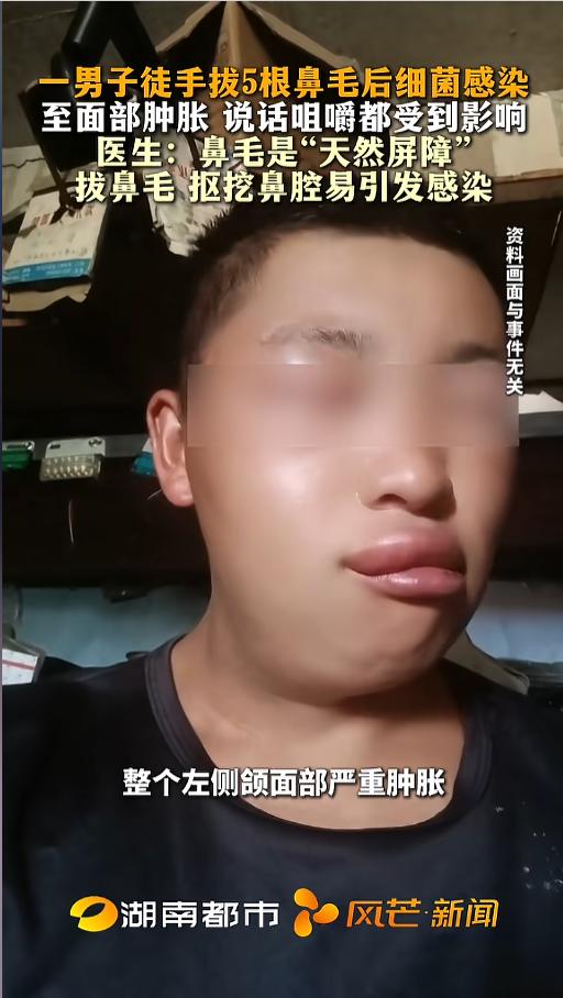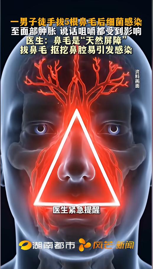 “千万别直接拔!”近日,湖北武汉,一男子嫌自己的鼻毛影响形象,就徒手拔了5根,没想到第二天脸就肿了,而且自己说话咀嚼都受到了影响,赶紧去医院做了检查。医生说是拔鼻毛导致的细菌感染。网友:面部危险三角区不要随便去动! 据媒体3月11日报道,陈先生今年刚28岁,事发前几日,他正准备和朋友聚餐,感觉自己的鼻毛影响了形象,就随手拔了5根。没想到,就是这随手的一个举动,把自己送进了医院。 到了第二天,陈先生发现自己的脸肿了,自己连说话吃饭都受到了影响。没多久,肿胀的地方发生了扩散,吓得他赶紧去了医院。 医生检查发现,陈先生这是细菌导致的感染,就是拔鼻毛时导致了轻微创口,让细菌钻了进去。 医生也告诫他,想要修理鼻毛,可以用消毒后的剪刀,千万不能直接拔,剪的时候也不要太深,免得影响鼻毛的屏障作用。 人的口角两侧到鼻根,这个三角形区域被称为面部危险三角区,这部分的血管十分丰富,甚至连接着颅内。很多血管都没有瓣膜,细菌很容易侵入。 因此,这个位置出现问题,自己一定不要私自处理,免得引起感染。痘痘、痤疮、鼻毛,看起来无关紧要的东西,在这个区域都充满了危险,大家一定要多加注意! 信息来源:《一男子徒手拔5根鼻毛后细菌感染至面部肿胀 说话咀嚼都受到影响医生:鼻毛是“天然屏障”拔鼻毛 抠挖鼻腔易引发感染》风芒新闻