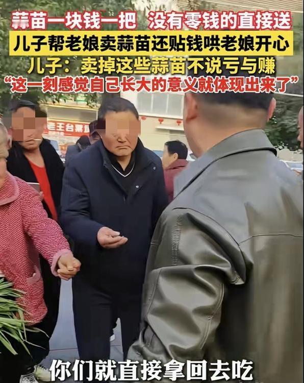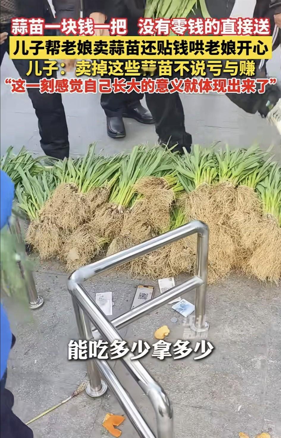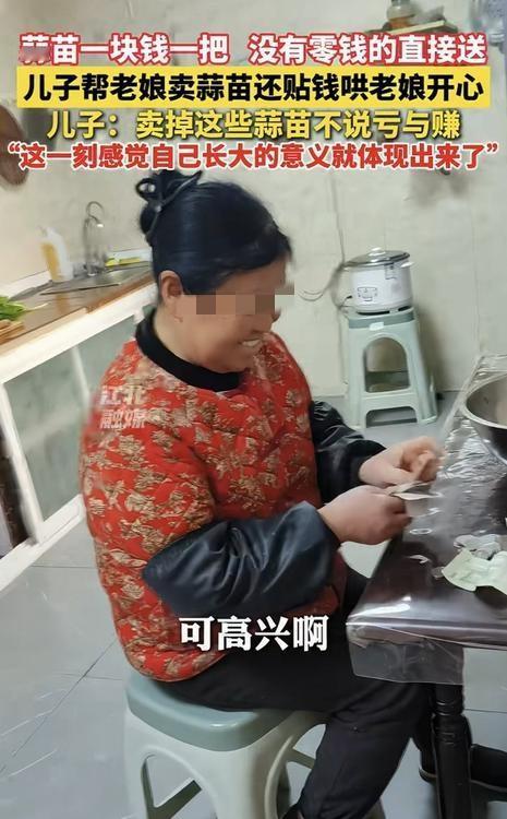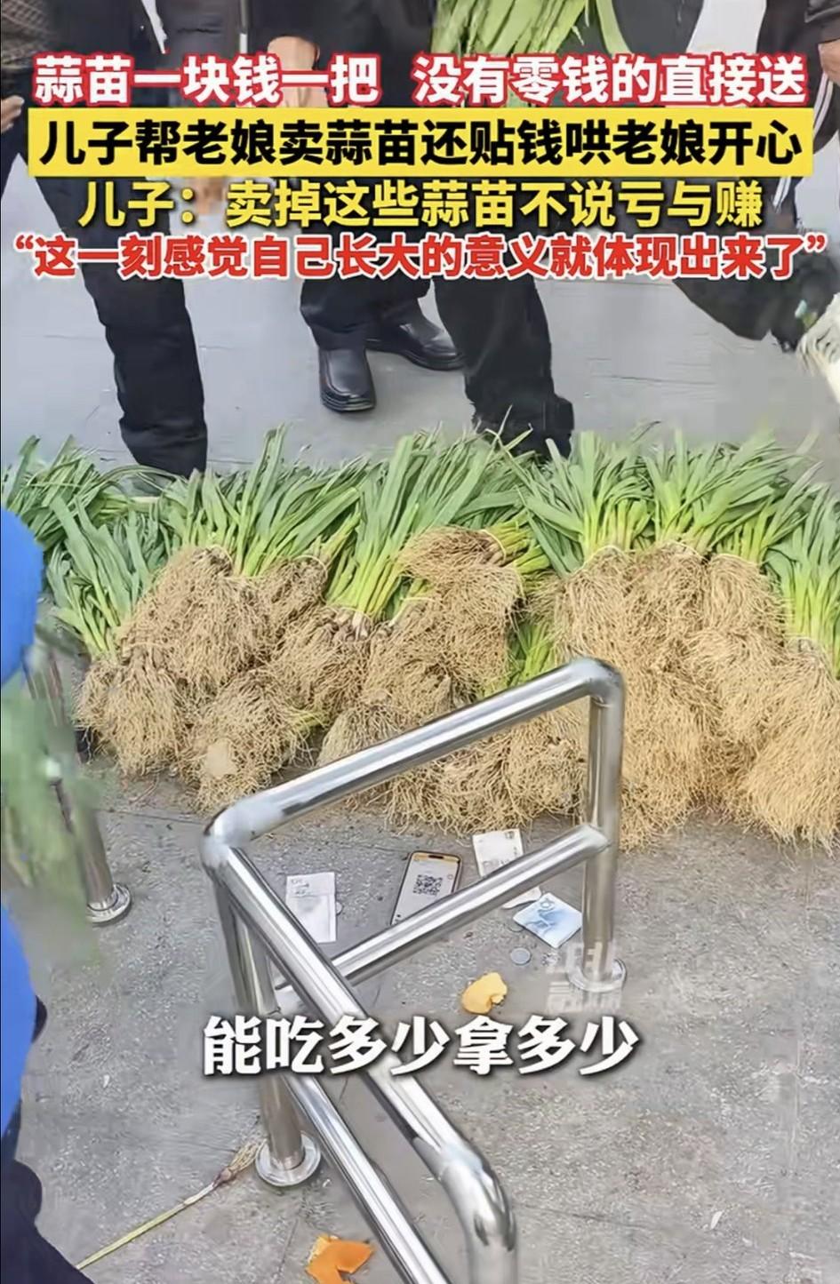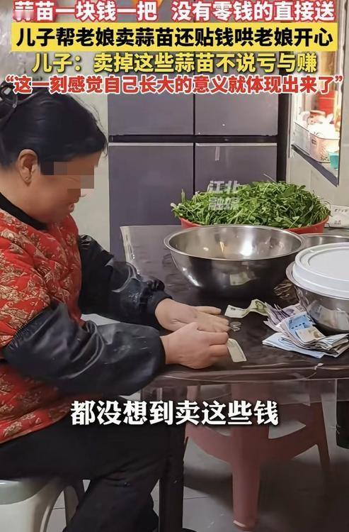 贴心了。安徽蚌埠,一男子发视频分享,家中65岁的母亲种了一亩多地的蒜苗,但成熟后卖又卖不掉,村里也没人收,母亲身体又不好,就让男子想办法把蒜苗处理掉。男子二话没说就答应了母亲,并以自己的方式帮母亲卖蒜苗,最后愣是自己贴钱哄母亲开心。 原来,男子得知母亲的卖不掉蒜苗的烦恼后,便自己开车回去把蒜苗拉到街上来,还以“一块钱一把,没有零钱的直接送,能吃多少拿多少”的方式开始叫卖。 还别说这办法是真好,这路过的人一听男子的售卖方式,也是纷纷上前“抢购”,一会的时间就把后备箱所有的蒜苗卖完了。 而蒜苗实际卖了107块钱,之后男子自己又贴了两百块钱,凑起三百多块钱交给母亲。而母亲看到蒜苗卖了这么多钱,也是开心得不得了。 对此男子也表示,自己贴钱就是为了让母亲开心的,是亏是赚无所谓,只要看到母亲开心就值了。而这一刻,男子也感觉自己长大的意义就这么体现出来了。 对此有网友就表示:我老婆家老外婆90多岁了,叫她别种地了,结果她还是闲不住要种,种出一些糯玉米又卖不掉,也来不及吃。于是我也是拉到单位分给同事,然后有的同事执意付钱,大多数同事没付钱,我再贴补一点交给外婆。结果外婆高兴得不得了,第二年还种了更多玉米[捂脸] 还有网友表示:小小蒜苗,大大孝心!儿子愿意贴钱,愿意陪伴,才是最珍贵的回报。所以赚钱是其次,让妈妈开心,被需要,才是长大最温柔的模样!为男子点赞! 不得不说,蒜苗有价,而爱母亲的孝心却是无价,男子的做法也太贴心了吧!为了母亲开心,他愿意卖蒜苗,愿意自己贴钱,200元事虽小,但这份孝顺的意义却很大! 正如网友所说,孝顺的儿子哄母亲开心,就是儿子最大的愿望。其实长大的意义就是成为家人的依靠,有此好大儿,母亲一定很幸福!向男子的这份孝心点赞学习!