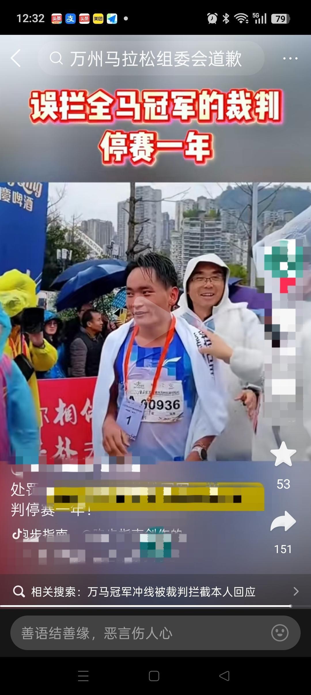 离了大谱,哈哈!全马冠军居然被一把推了出去,又返回重新冲线。据说就是这货干的。而且他事后居然还笑了[捂脸][捂脸] 作为裁判,连全马和半马的选手都分不出来。幸亏这男的领先很多,如果只是领先十几米,那到时候怎么办? 组委会也给出了解释,说当时下雨,裁判又戴着眼镜,视线模糊没看清。同时对裁判进行了停赛一年的处罚。 这个处罚显然有点轻了! 按照常理,如果当时不能分辨是半马和全马的选手,也该先让运动员冲线,事后再来检查成绩是否有效。 这也不是第一次裁判拦运动员冲线了,难道裁判都这么业余?