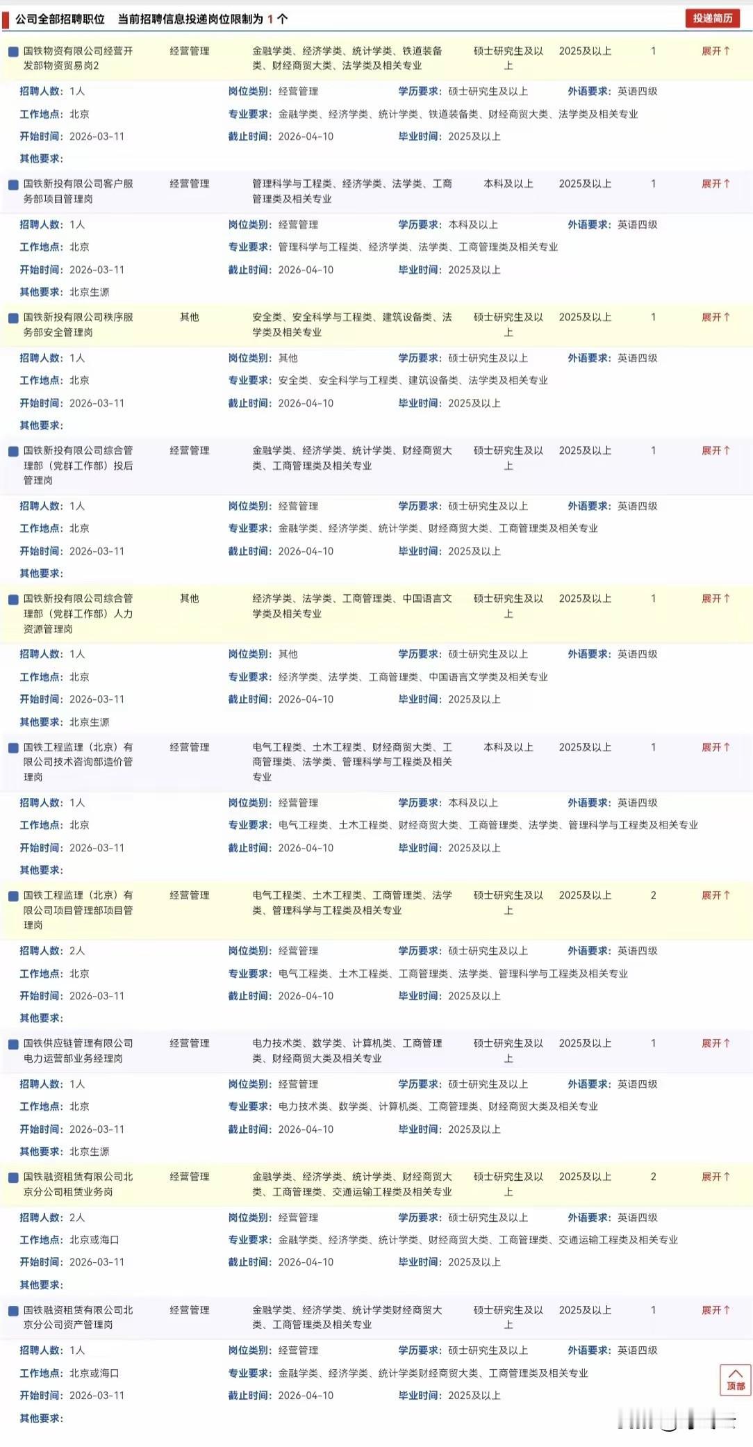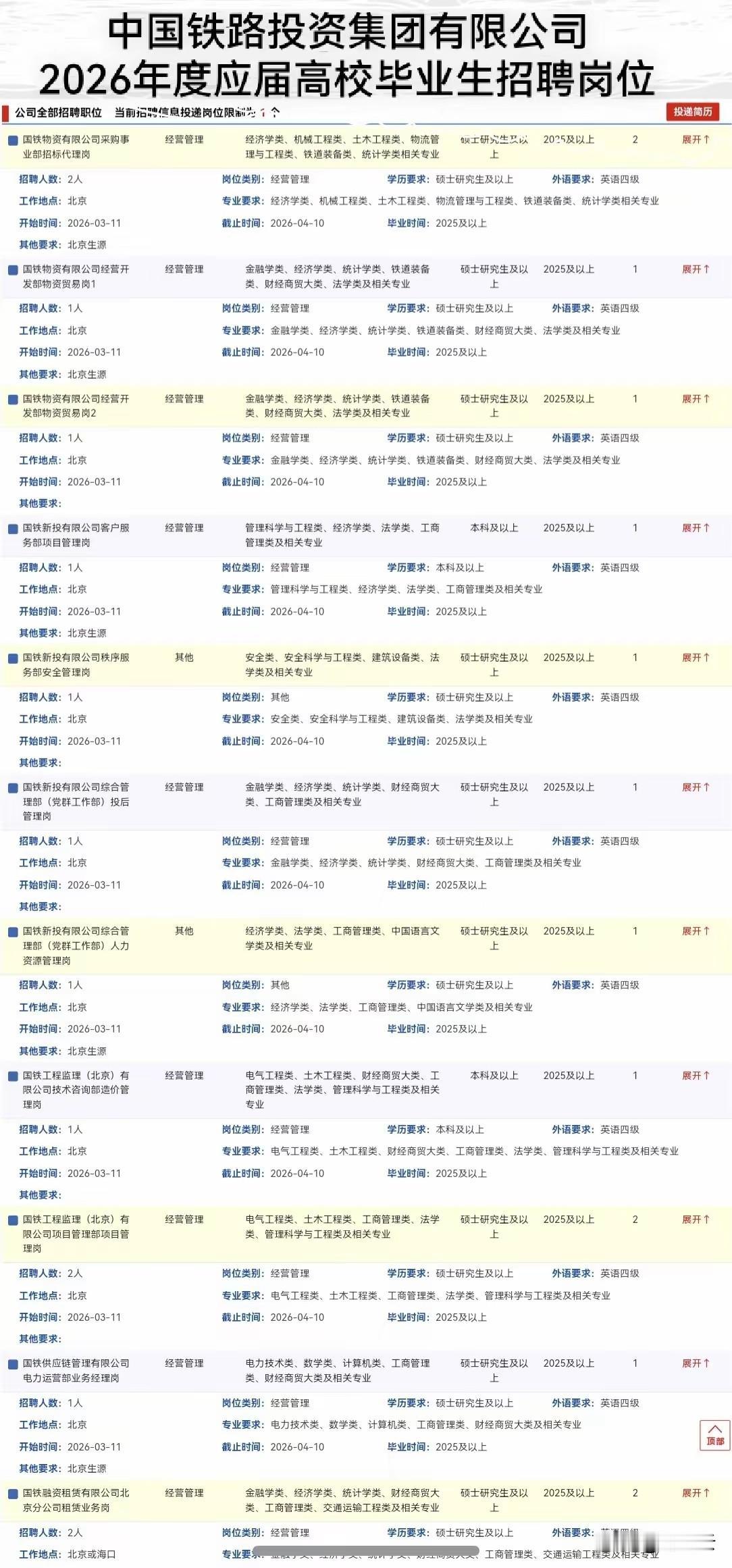 3页铁饭碗来了!快来报名!🚄 2026国铁求职攻略:央企铁饭碗,上车要趁早!中国铁路投资集团2026届春招已开闸放水,这波“铁饭碗”福利直接拉满!北京户口+稳定编制+行业顶流buff叠满,堪称应届生求职天花板,错过这波真要拍断大腿![点亮平安灯][点亮平安灯][福][福] 🎯 岗位拆解:精准卡位不踩坑 - 学历门槛:硕士研究生是主力,仅2个岗位开放本科通道,专科宝子们可以转战其他铁路子公司啦~ - 专业适配:经管、财会、计算机、工科四大赛道齐开,金融/统计/法学/土木等专业都能找到对口坑位,堪称“专业包容度天花板”。 - 地域buff:多数岗位要求北京生源,北京土著闭眼冲;非京籍同学可重点关注国铁融资租赁的海口岗位,曲线救国也很香! 💡 求职Tips:抢岗速通指南 - 投递限制:每人仅能投递1个岗位,必须“精准锁岗”,别瞎海投浪费机会! - 时间节点:网申3月11日启动,4月10日截止,倒计时已开启,手慢无! - 加分项:英语四级是硬门槛,有北京生源身份直接赢在起跑线,实习经历往铁路/金融/科技领域靠,offer概率直接翻倍!这波国铁春招是应届生进央企的黄金窗口期,宝子们赶紧码住冲!🚀 国企为什么喜欢招应届生? 欢迎关注@叮咚云 就业择业指导,帮你快速拿到央国企offer!将优先为粉丝职业规划指导,为你定制最适合的就业择业方案!欢迎留言交流讨论。[来看我][来看我] 免责声明:图片来自网络,仅供参考