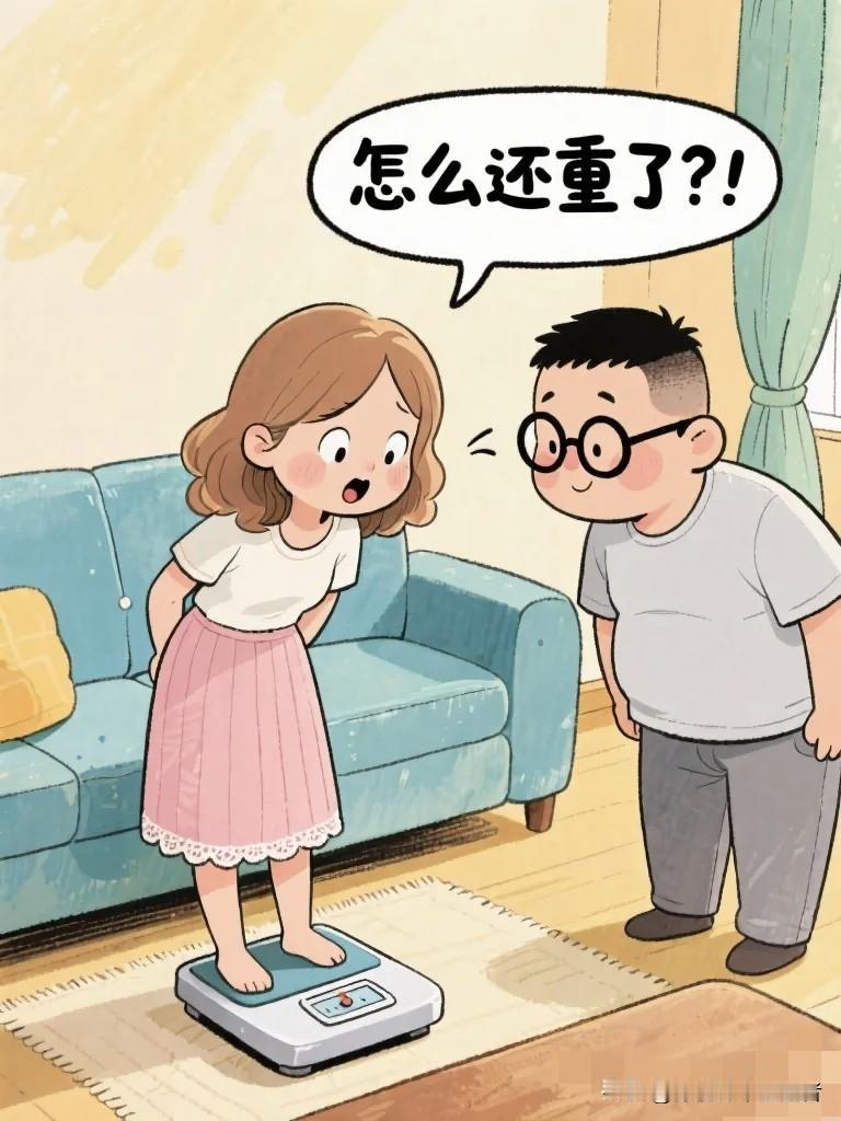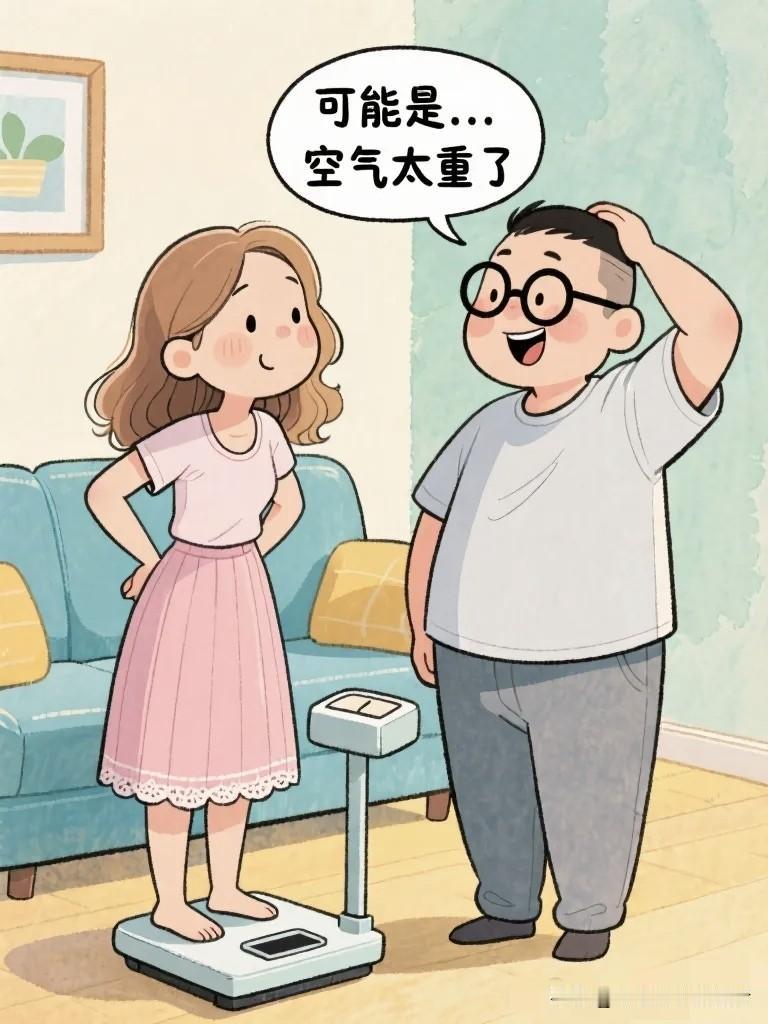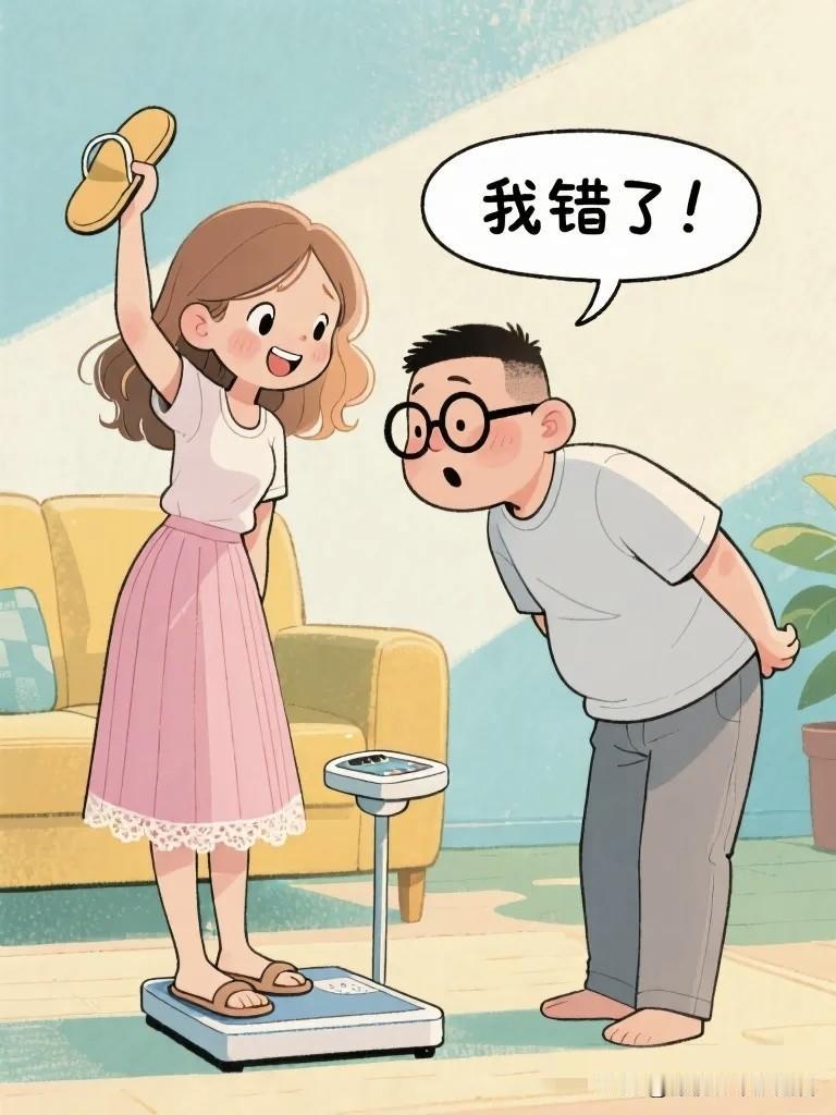 幽默漫画图搞笑漫画:妻子上秤前各种操作,丈夫在旁边看。妻子:"衣服太重。"丈夫: