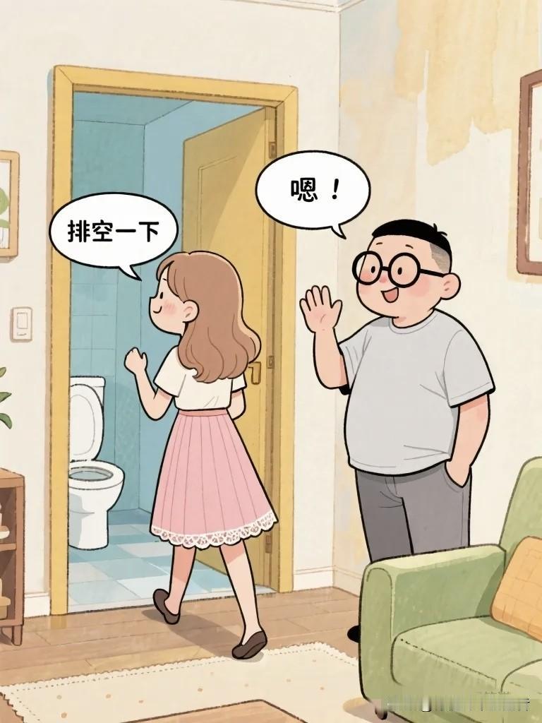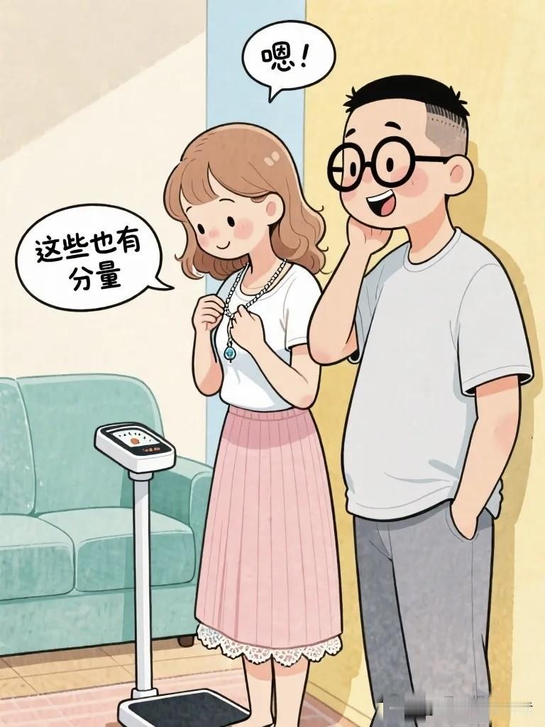 幽默漫画图搞笑漫画:妻子上秤前各种操作,丈夫在旁边看。妻子:"衣服太重。"丈夫:"嗯。"妻子(摘首饰):"这些也有分量。"丈夫:"嗯。"夫妻日常漫画