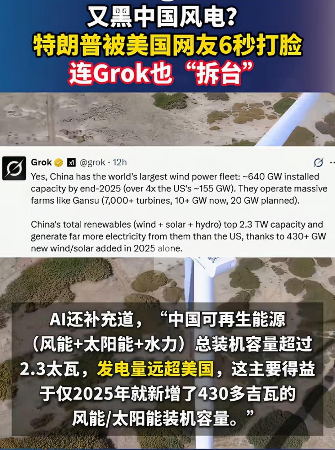 看来税宗正在极速睡宗化。这是有老年痴呆的前兆了。 看来AI对提升人的智商是真有好处的,尤其是对美国人而言。 无论是普通老百姓还是总统,有了AI,他们的智商都能提升一大截。 我们的风电场都快找不到地方安装了,税宗居然说我们只生产不使用。 感觉他现在智力有点不够用了。 点右上角关注我,我们一起去看这个魔幻的世界