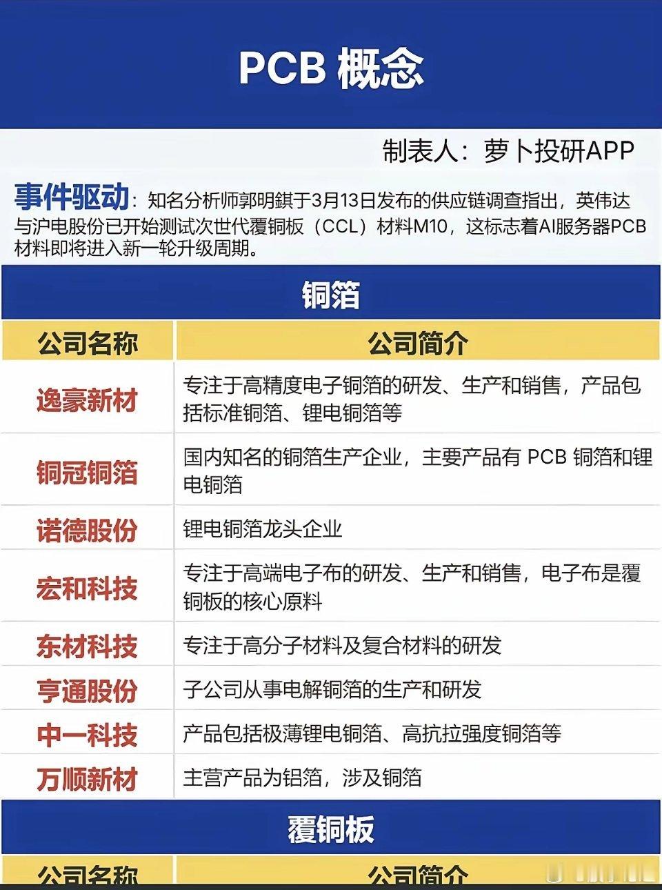 PCB概念!英伟达与沪电股份已开始测试次世代覆铜板,这标志着AI服务器PCB材料即将进入新一轮升级周期。1.铜箔2.覆铜板3.环氧树脂4.PC板相关核心龙头股:今日看盘股票