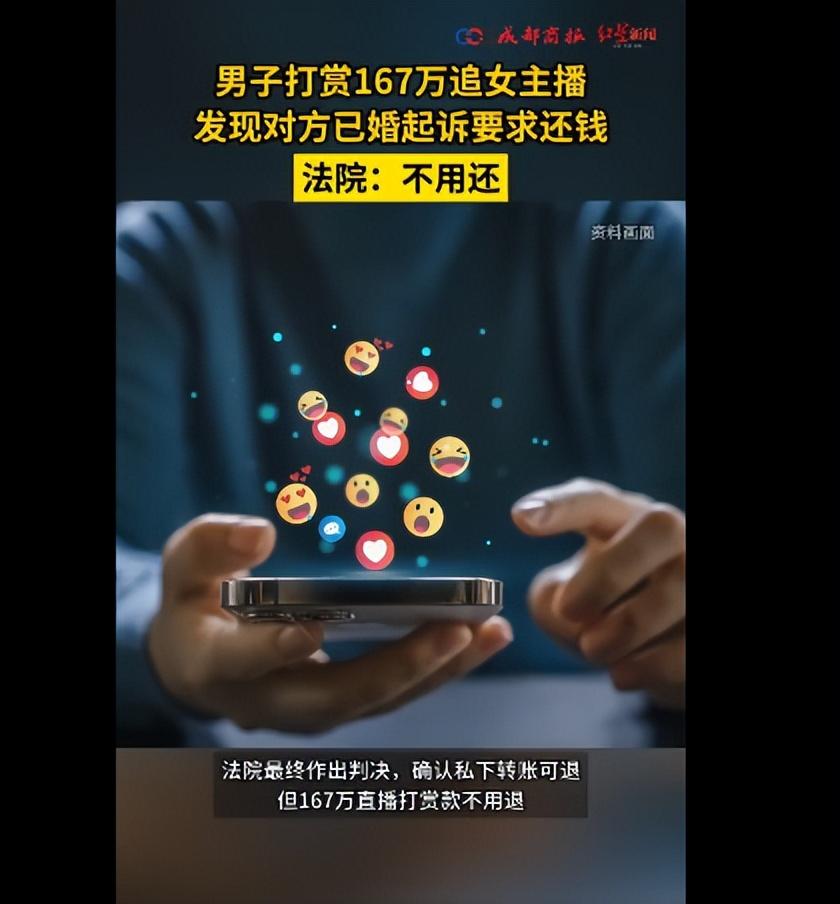 为爱疯狂!成都一男子半年疯狂打赏167万追女主播,并私下转账11万余元,发现对方已婚后起诉还钱,法院:返还私下转账,无需返还打赏款! 大哥奔着双向奔赴的恋爱去的,结果到最后才发现,自己掏心掏肺、砸锅卖铁讨好的这个女主播,早就结婚了! 成都的瞿先生,上班不算太忙,闲下来的时候就喜欢刷视频解闷。 陈女士长得清秀,说话又软又温柔,直播间里不吵不闹,就是跟粉丝聊聊天、唱唱歌,互动起来特别亲切,没有一点架子。 瞿先生当时就觉得,这个女主播跟别的不一样,不浮夸、不套路,越看越对眼。 刚开始的时候,瞿先生也没太上头,就是偶尔进直播间蹲一会儿,随手刷个小心心、小啤酒,都是几块钱、几十块钱的小礼物,跟陈女士聊上几句家常,问问她吃饭了没、今天累不累。 可加了微信,两人的聊天就更频繁了。 瞿先生是真的动了真情,他觉得自己终于遇到了对的人,每天一有空就给陈女士发消息,嘘寒问暖,生怕她受一点委屈。 一开始,他只是在直播间偶尔刷个大额礼物,比如几千块钱的跑车、火箭,每次刷完,陈女士都会在直播间里笑着感谢他,说“谢谢瞿哥,瞿哥最棒了”,还会专门给他点首歌、跟他多聊几句。 就这几句感谢、一个微笑,就让瞿先生心花怒放,觉得自己的钱花得值。 后来,瞿先生的积蓄很快就花光了,但他根本停不下来,为了给陈女士打赏,他开始四处借贷,前后向好几个网贷平台、还有身边的朋友借了126万多块钱。 有时候,陈女士也会在微信上劝他几句,说“瞿哥,你别再借钱了,这样太辛苦了,我不需要这么多礼物的”,可瞿先生却满不在乎。 他没想过,欠了这么多钱,到底该咋还。 上班一个月挣一万块,不吃不喝也得十几年才能攒够这么多钱,这数字,对于咱们普通上班族来说,简直就是天文数字,想想都觉得吓人。 一开始,瞿先生说“这钱你拿着,给阿姨买点好吃的,就当我请阿姨吃饭了”,陈女士也没推辞,很爽快地就收下了。 后来,陈女士偶尔会跟瞿先生说自己手头紧,比如“最近房租该交了,还差一点”“家里有点事,需要点钱应急”,瞿先生二话不说,就直接转账过去。 他觉得,自己既然真心喜欢陈女士,为她花钱就是应该的,只想着能靠这份真心打动她,让她早点答应跟自己在一起。 两人熟悉了之后,也私下见过几次面,每次见面,陈女士都打扮得漂漂亮亮的,说话温柔、举止体贴,吃饭的时候会主动给瞿先生夹菜,过马路的时候会挽着他的胳膊。 谁能想到,他竟然看到陈女士和一个陌生男子手牵手走出来,两人有说有笑,举止十分亲密,那个男子还时不时地摸陈女士的头、揽她的肩膀,看起来特别恩爱。 瞿先生当时就懵了,赶紧躲在一边,看着两人上了一辆车,心里五味杂陈,既疑惑又生气。 后来,他通过多方打听才知道,那个陌生男子,竟然是陈女士的丈夫,而且两人早在2019年就已经登记结婚了。 自己掏心掏肺、砸锅卖铁去讨好的人,竟然早就有了家庭,而自己,却还在傻傻地花钱追求,甚至借钱给她打赏、转账。 瞿先生在起诉状里说,陈女士故意隐瞒自己已婚的事实,以恋爱为诱饵,诱导自己在直播间打赏、私下转账。 陈女士表示,自己对其他粉丝也会用类似的互动方式,比如粉丝发“老婆”“想你”的表情包,她也会回抱抱和“我也想你”的消息,有时候还会给粉丝邮寄一些小礼物,比如钥匙扣、明信片之类的。 这只是行业内常见的维系粉丝的方式,并不是针对瞿先生的特殊对待,更不是以恋爱为诱饵诱导打赏。 法院认为,瞿先生的私下转账,是有明确目的性的,他之所以给陈女士转钱,是为了和陈女士建立恋爱关系,属于一种附条件的赠与。 最终,判处陈女士将私下转账的钱返还,而直播间的钱无需返还。 主播的温柔、热情,大多是职业行为,是为了维系粉丝、获取打赏,说白了就是工作,千万别当真,更不要一时冲动,疯狂打赏、借贷打赏。 毕竟,一旦打赏出去,再想追回来,就没那么容易了。 到最后,很可能就是竹篮打水一场空,还得背负巨额债务,得不偿失。 对于这件事,您有什么想说的吗?欢迎评论区留言讨论。 信息来源:广西法治日报 2026-3-16