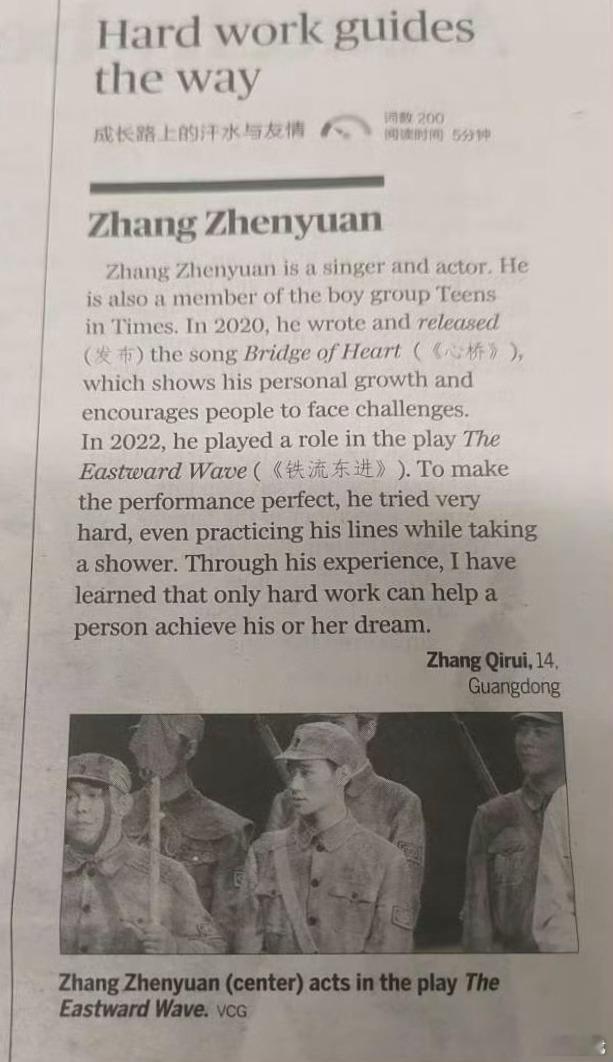 张真源登英语21世纪报官方认证的优质偶像!张真源登上八年级21世纪英语报,从原创词曲的《心桥》到国家话剧院的《铁流东进》,才华与实力并存,沉稳努力不浮躁,成为无数青少年学习的好榜样