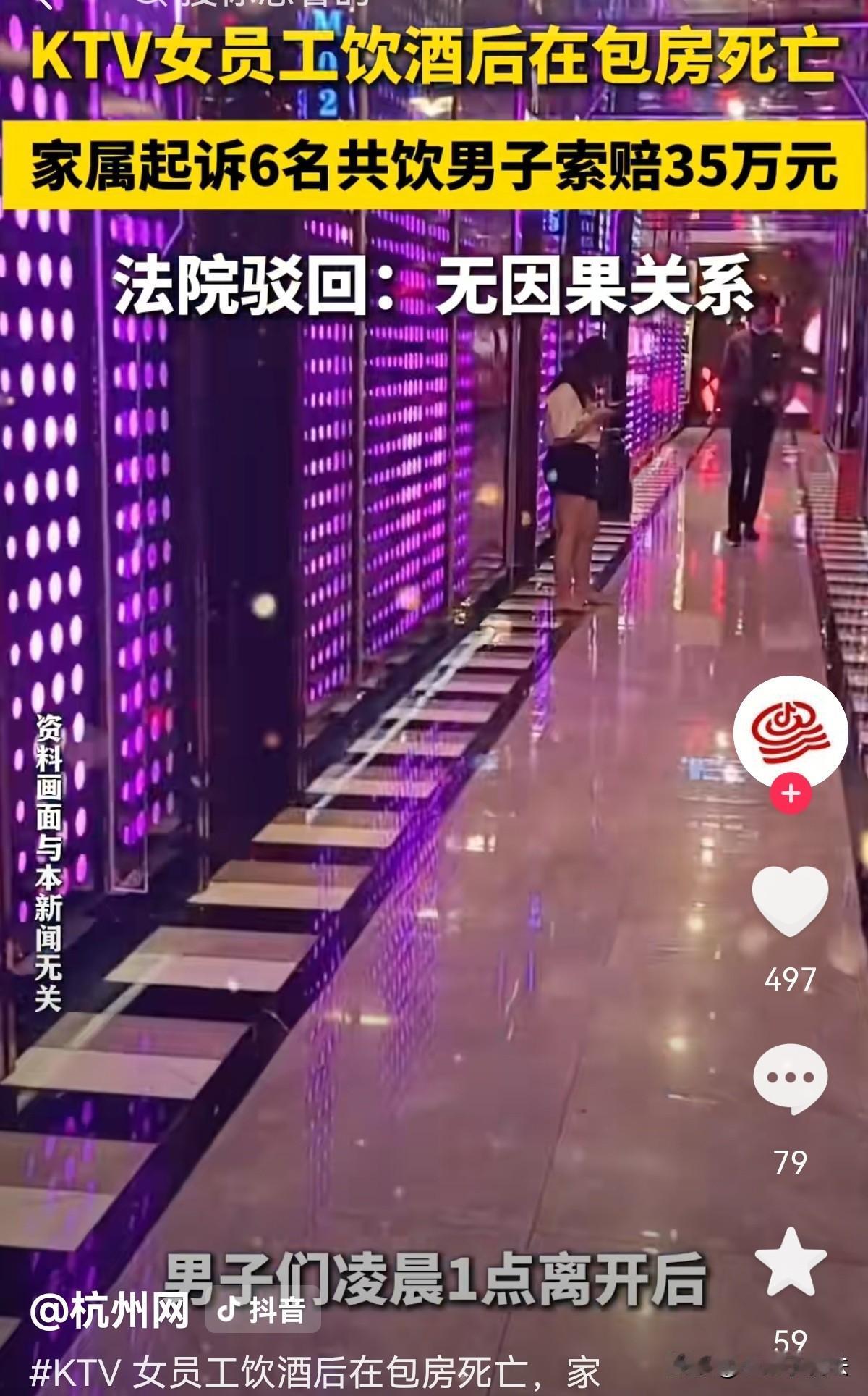 无妄之灾!佛山顺德,6名男子正在某KTV包厢里嗨皮,28岁女子推门进来,向他们推销酒水,几人只是礼貌性的迎合了下,然后继续唱歌,并未与她喝酒劝酒,完全没在意她的存在。凌晨1点6人离开,女子仍在包厢内。谁知十几个小时后,才发现女子已浑身拔凉,没了气息。其家属认为6名男子未尽照顾义务,起诉他们索要35万赔偿。法院判决亮了!网友:活着靠她赚钱,死了也得敲一笔?真是世态炎凉! 2024年3月18日的晚上,某KTV的V06包厢里传出阵阵歌声。 王某甲和他的五个哥们儿好不容易聚在一起,开了几瓶酒,正唱得起劲。 曾某挂上职业的微笑推开了V06的大门。作为KTV的酒水销售,她的生活就是在各个包厢之间穿梭。 她的任务是把酒卖出去,提成才是实打实的,所以她一直保持着微笑,拿出饱满的状态面对客人。 “几位大哥,玩得开心啊!”曾某熟练地打着招呼。 王某甲抬头看了一眼,礼貌地应和着。曾某顺势端起酒杯,礼貌性敬酒。 她心里盘算着:这几位客人看起来消费能力不错,如能再推销出几瓶高档洋酒,这个月的指标就稳了。 可王某甲等6人似乎对她的推销不感兴趣,只是敷衍和她喝了一杯后,就自顾自地唱歌,根本没与她有任何下文。 几轮推销下来,曾某发现对方没有消费意向,心里难免有些失落,但职业素养让她依然保持着客气。 曾某没有走,独自坐在了包厢的角落里,一边陪着笑脸聊上几句,一边观察着客人们的酒杯。 凌晨1点,王某甲看时间不早了,招呼哥们儿起身结账。临走时,他看曾某还在那里,神色正常,也没理她。 在他看来,推销员在包厢里歇脚是再正常不过的事,于是6个人推门而出,消失在走廊尽头。 凌晨2点半,2名负责清场的清洁工,李姐和何姐,推着保洁车走进了V06。 一开门,发现曾某独自蜷缩在昏暗的沙发角。她并未醉倒,而是在抽泣。 她们对视了一眼,心里却没起太大的波澜,在KTV干久了,这种场面见得太多了。 于是,两人默契地选择了沉默,低头收瓶子、擦桌子,全程没跟曾某说一句话。收拾完后,她们带上门悄悄离去。 直到当天下午5点,KTV准备迎接新一波客人时,工作人员才发现曾某依然躺在那个沙发上。 工作人员无论怎么推、怎么喊,她都没回应。这时曾某已无生命体征,一鲜活的生命枯萎了! 消息传到曾某家属耳中,简直如晴天霹雳。 他们怎么也无法接受,一个出门上班的好端端的人,怎么就死了? 悲痛转瞬化为愤怒,家属在了解情况后,将矛头直指当晚最后接触她的王某甲等6人。 “一个女孩子还在包厢,你们怎能不管不顾就走了?”家属心里认定,这6个人就是“共饮人”,没尽到照顾义务。 他们提出了35万元的巨额索赔,一纸诉状将六个大男人告上了法庭。 面对法官,王某甲6人觉得比窦娥还冤。 他们当庭申辩:我们是去消费的客人,她是卖酒的工作人员,我们没请她喝,也没劝她酒,更没灌她,纯粹是她为了推销自己敬的。我们走的时候她好好的,凭什么赖我们? 《民法典》第1198条:……娱乐场所等经营场所、公共场所的经营者、管理者或者群众性活动的组织者,未尽到安全保障义务,造成他人损害的,应当承担侵权责任。 法院审理认为,这6个人和曾某的关系,并不是普通的酒友,一个是消费者,一个是销售人员。 在这种职场推销的场景下,要求客人对推销员承担像对亲友那样的“照顾义务”,显然是不合逻辑的。 《民法典》第1165条第1款:行为人因过错侵害他人民事权益造成损害的,应当承担侵权责任。 证据显示,王某甲等并没主动邀请曾某喝酒,更没有拼酒、灌酒的恶意行为。 曾某敬酒、停留,均系主动推销职务行为,6人仅礼貌应酬。 那2位清洁工的证言证词:凌晨两点半,在王某甲等人离开一个半小时后,曾某在哭泣。 这说明当时她的生命体征是正常的,至少身体没有出现那种急需救助的突发状况。 既然几位被告离开时,曾某状态正常,他们就更没有理由预见到曾某会发生意外。 最终,法院给出了清清楚楚的判决:驳回曾某家属的全部诉求。 走出法院,王某甲6人长舒了一口气,这场飞来横祸总算告一段落。 法律从来不是“谁死谁有理”的保护伞,公平正义的底线,是不冤枉无辜者,也不纵容无根据的索赔。 对于每一个在外打拼的人来说,照顾好自己的身体,才是对家人最基本的责任。 对此您怎么看?