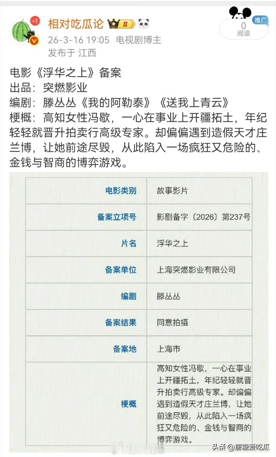 赵丽颖和于适 导演真的太有才了 于适体育大学毕业,赵丽颖高中毕业,硬生生走进了专业演员的行列。 赵丽颖已经休息大半年了,原来是准备了这么大一个惊喜大家,男主角也选得很好,一个女性市场有保障,一个路人缘好得要命,《浮华之上》又会是一部让人期待的电影。