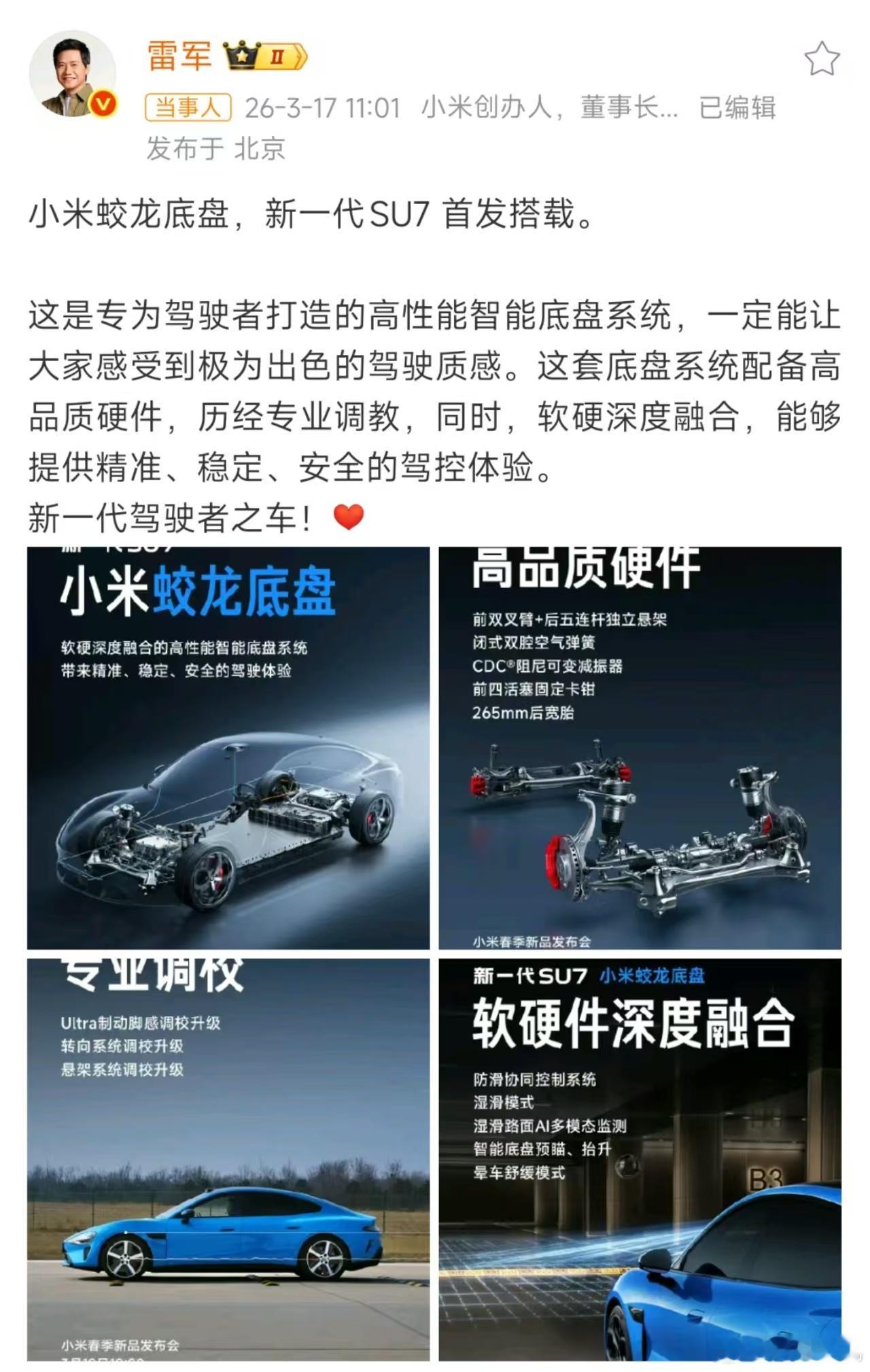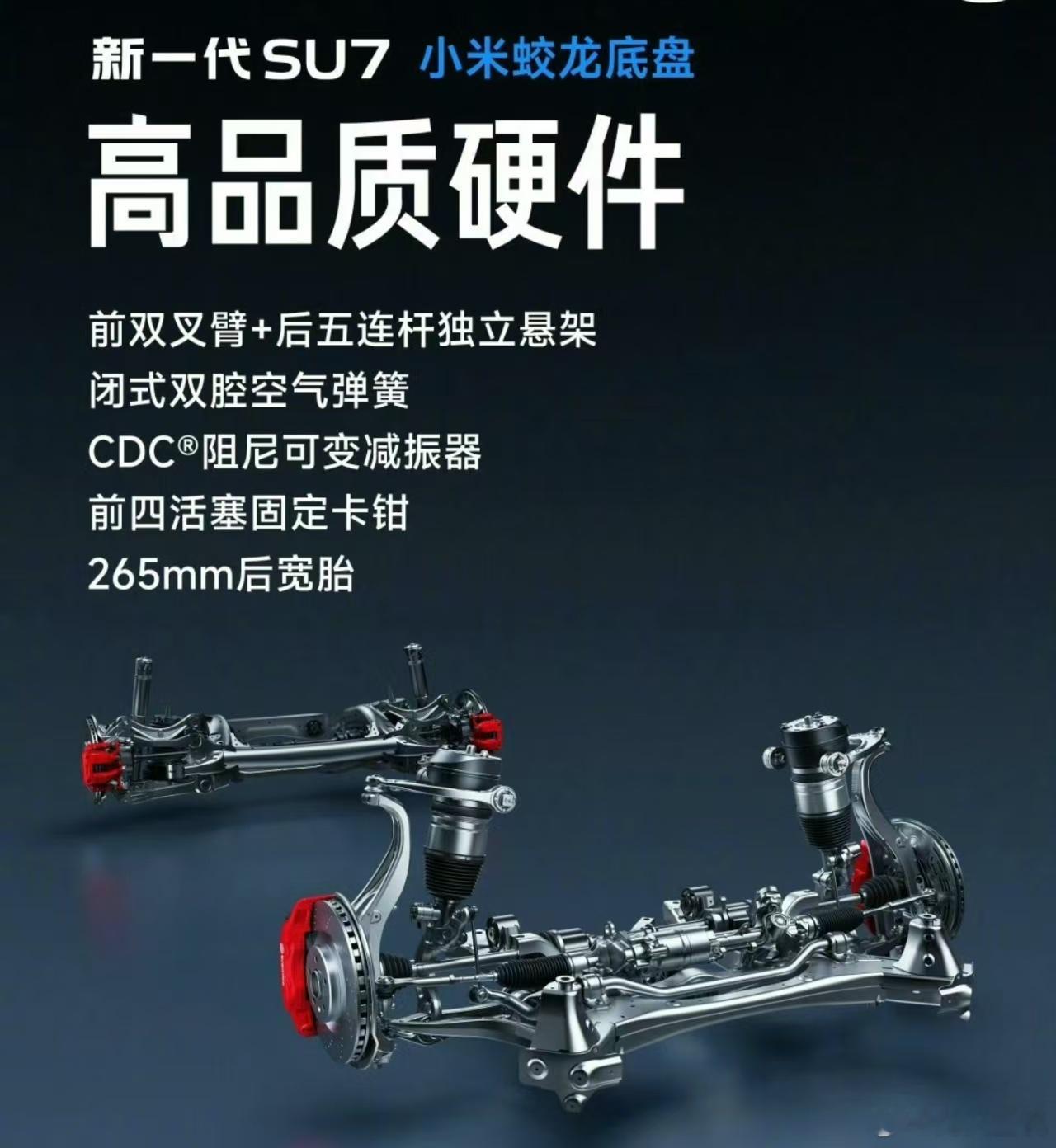每次小米一单独命名,就肯定有点东西。像这个小米新SU7全系首发搭载蛟龙底盘,这蛟龙的名字可算是个大名,叫蛟龙的哪一个不是响当当的,像蛟龙号这些。而且我看这些大V开过之后都说比上代SU7有提升,上代SU7的驾驶质感已经非常顶了,这还能升级。只能说打败小米SU7的只有下一代小米SU7。
