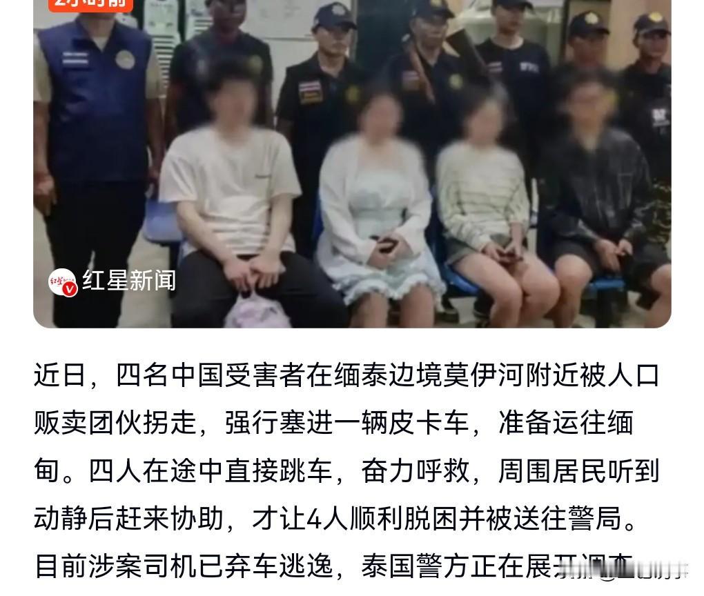 那真的是太惊险了。 差点就被卖到缅甸了,幸好一名男子非常的机智勇敢救了车上其他人。 近日,4名中国人跳车逃过被卖缅甸。 当时几人被强塞进一辆车中,准备运到缅甸。 一男子突然跳下车,然后打开车门,让其他的人也跳了下来。 司机吓得弃车逃跑了。 如果被骗到缅甸,那真的是暗无天日啊,轻则受伤,重则身亡。
