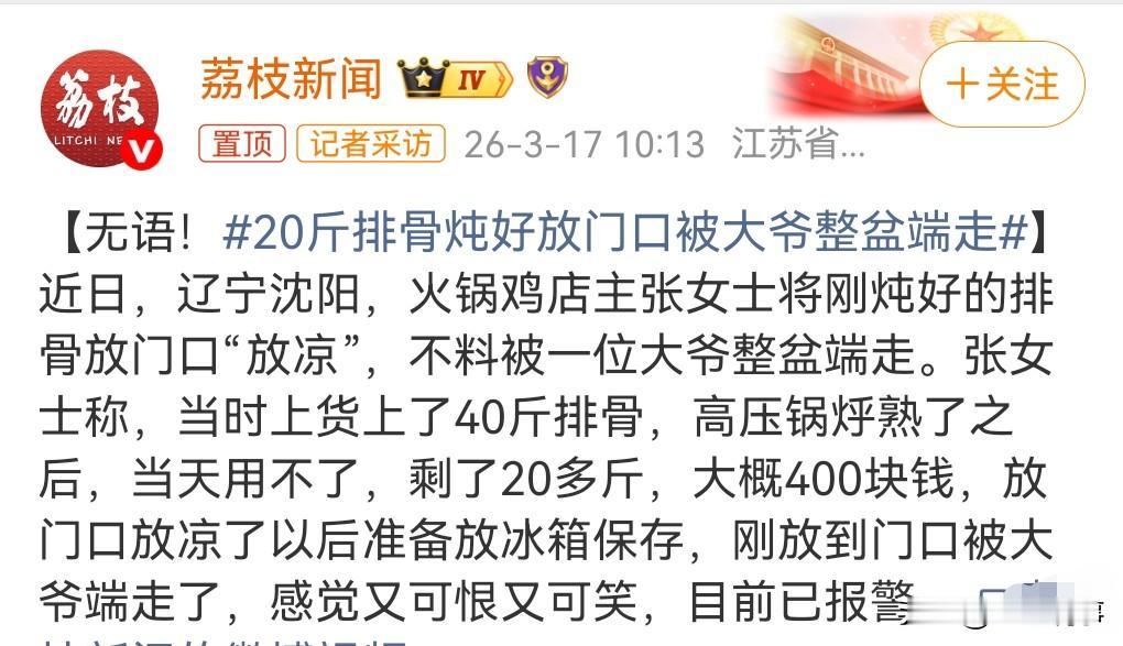 这真的是太丧心病狂了吧,这是一个顺手牵羊的老贼呀。 近日辽宁沈阳,一家门店把做好的排骨放在门口放凉。 没想到被一个老贼给盯上了。 竟然把这排骨给端走了。 价格400块钱。 一定要抓到这个老人,狠狠的罚款。