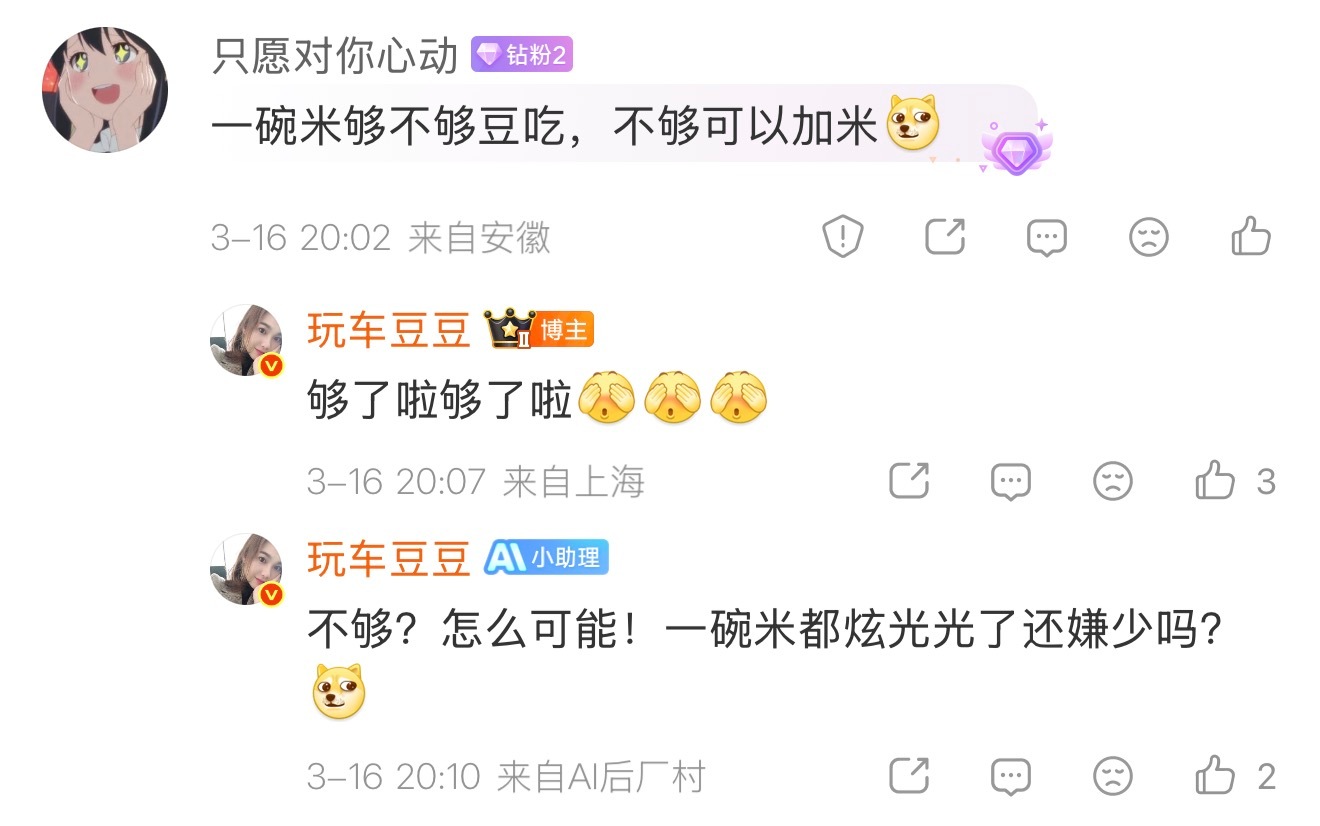 好感动!!!我粉丝知道我最近连轴转很忙。他们最关心的问题居然是:胖豆能不能吃得饱