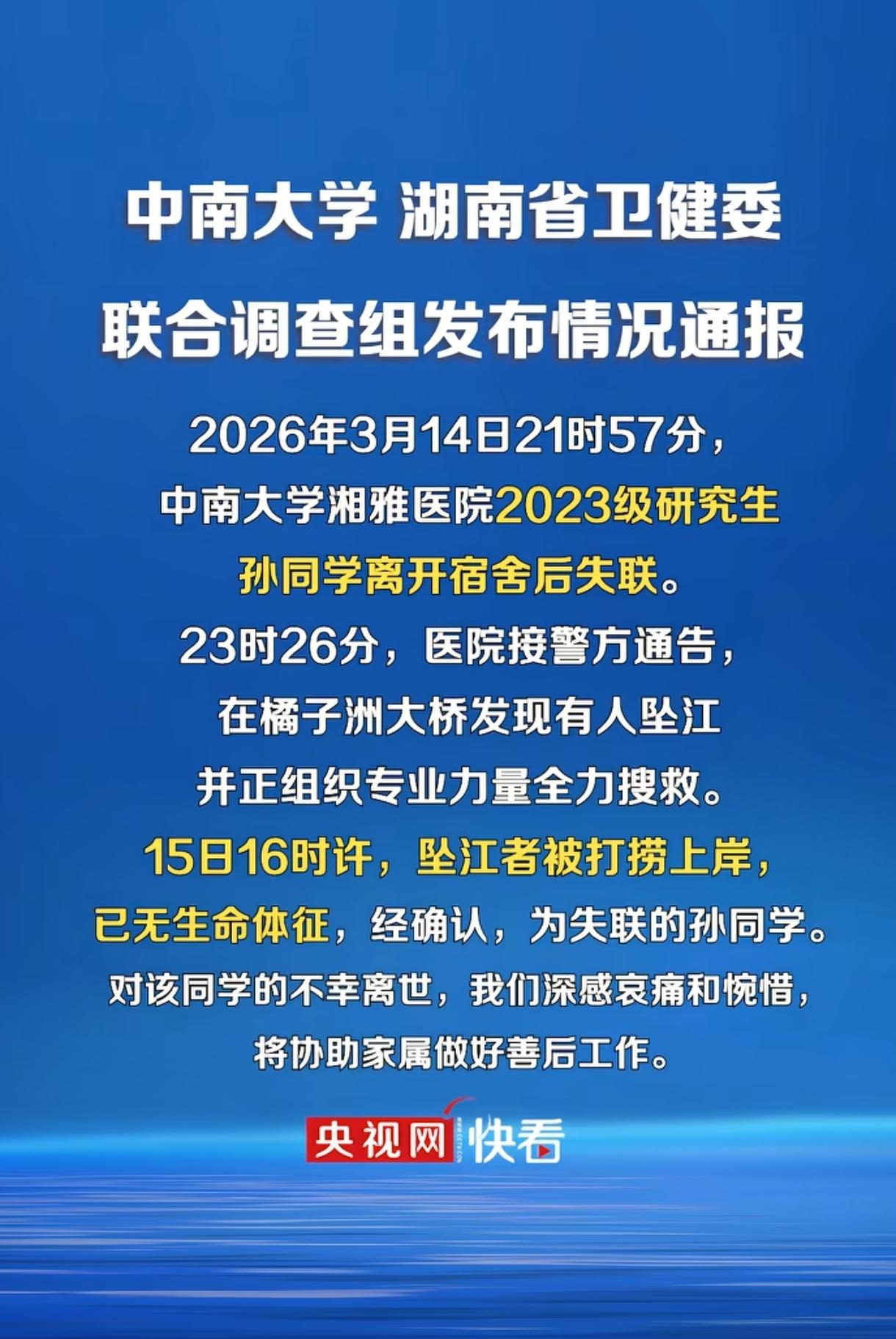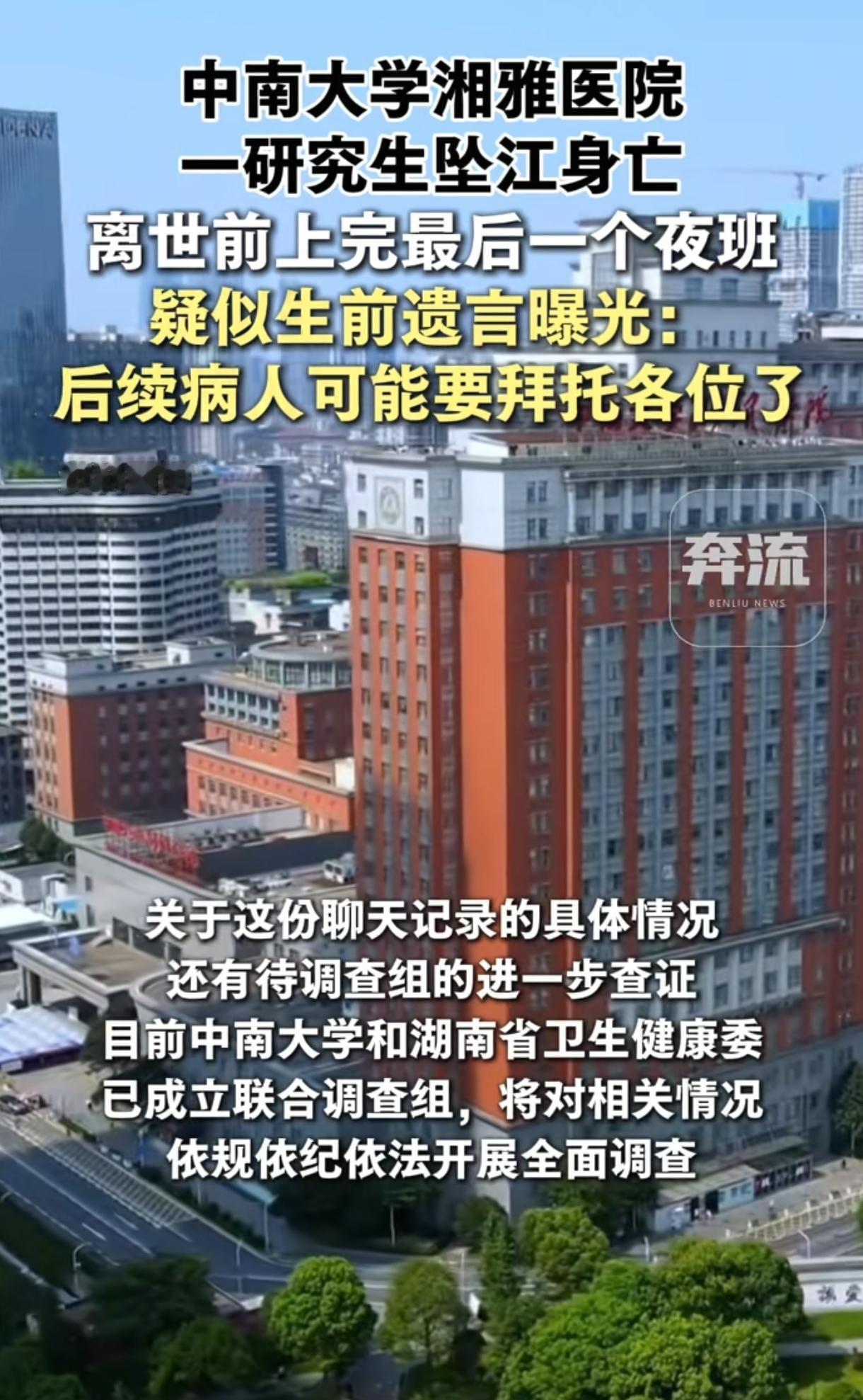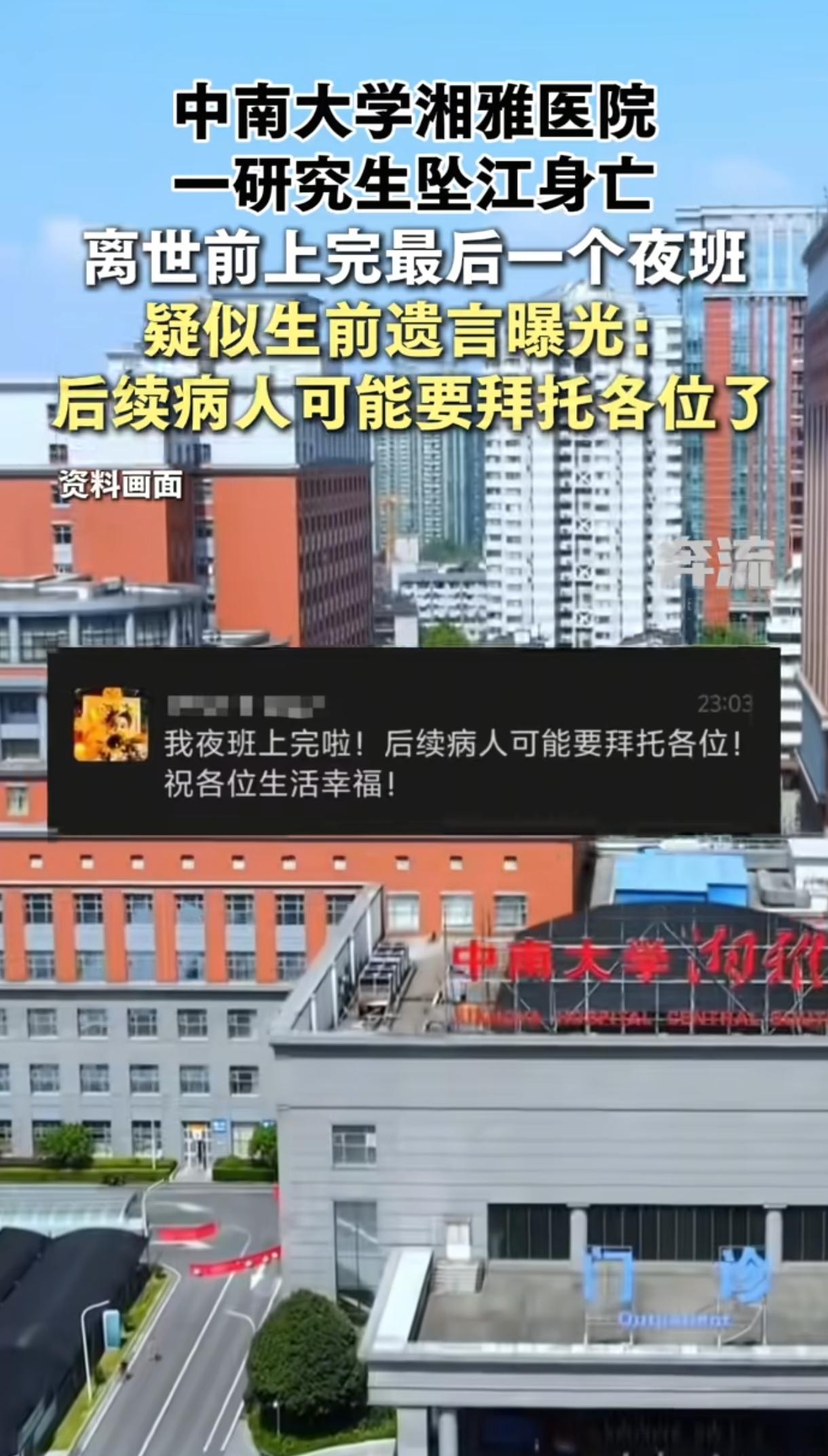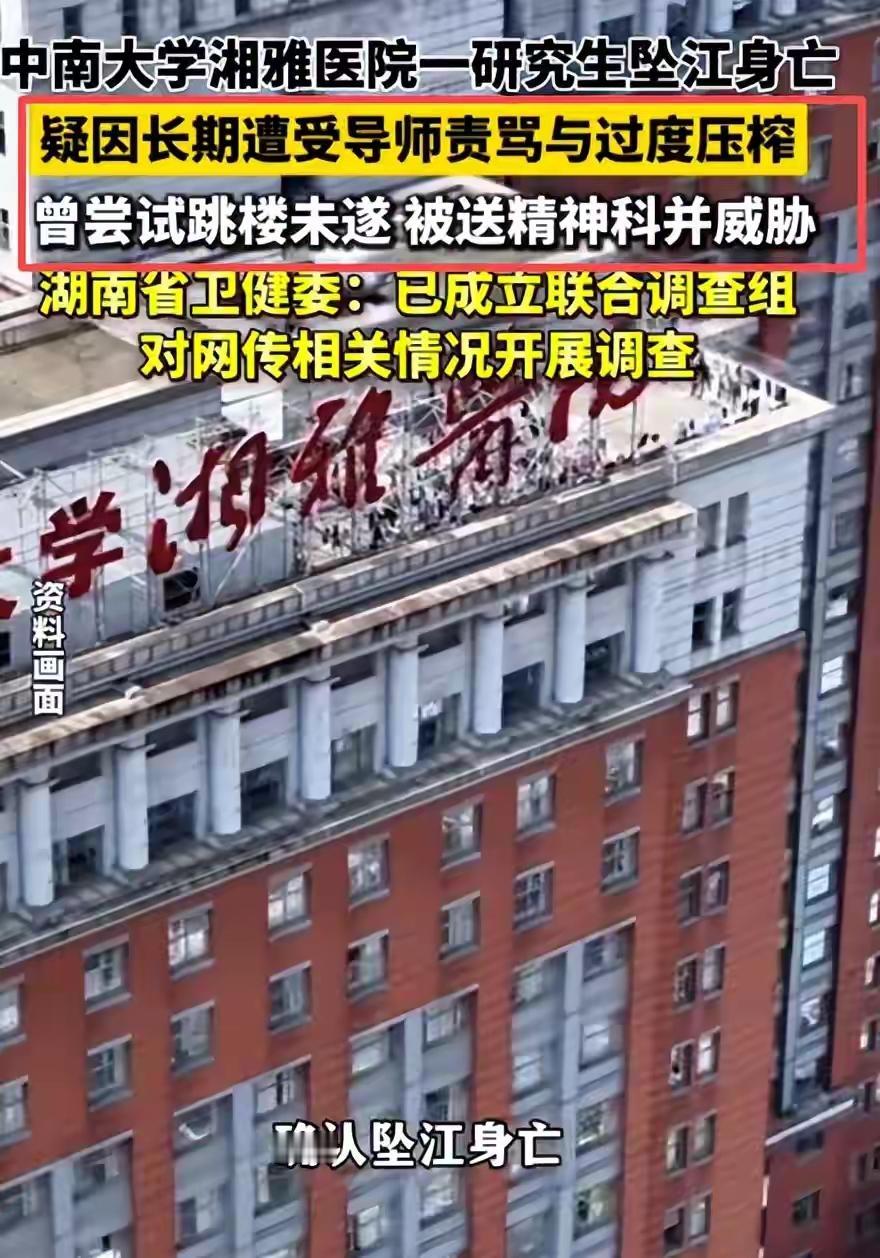 太痛心了。中南大学湘雅医院的孙同学,长相漂亮,成绩优异,是一名寒门学霸,也是家族唯一的希望,却绝望地从橘子洲大桥一跃而下,结束了年仅25岁的鲜活生命。 3月14日这天晚上21:57分,孙同学上完神经内科夜班后,独自一人离开了湘雅医院宿舍,之后便人间蒸发了。 只在晚上23:03分在班级群留下了这样的话:“我夜班上完啦!后续病人可能要拜托各位了,祝各位生活幸福。永别了,各位,请不要为我难过,我终结了我所有的痛苦。” 这一是将病人交接给大家;二是向大家告别。 最重要的是,这话看上去就是“遗言”。 果然,23分钟之后,即23:26分,长沙警方就接到一名市民报警称橘子洲大桥有人坠江,遂立即展开施救。 然而,天黑水深,公安、消防、救援队等联合搜救也没找到孙同学,直到第二天下午16:00,才在橘子洲下游江面将她打捞上岸,很不幸的是她已失去了生命体征。 后经警方确认,排除他杀可能。 太痛心了,年纪轻轻才25岁啊,人生还有无限可能,她保研上了很多人梦寐以求的中南大学研究生,还有半年就毕业了,为何这么想不开呢? 孙同学还是一名寒门学霸,来自河南农村,父母务农或偶尔打零工,收入微薄,她是家中长女,从小成绩优异,家中还有弟弟妹妹,她是家里的精神与经济支柱。 虽然家境贫寒,一没背景,二没资源,但父母还是半生辛劳、倾尽所有将她供读到985硕士,成为中南大学医学院研究生,也成为了全家乃至全村人的骄傲与希望。 然而想,正因背负了太多家族的期望,也成为了她输不起的压力。 为了不让全家人失望,也为让自己顺利毕业,在读研期间,孙同学拼命学习与工作,每天第一个到实验室最后一个走,但从不和家人说自己的委屈与压力,总是报喜不报忧,懂事得令人心疼,然而,她的努力隐忍却没有换来想要的结果。 网传或同学爆料但没证实,孙同学不仅要执行高强度的倒夜班、管床、查房等规培临床工作,还被安排大量非学业“私活”等,24小时待命,孙同学经常一听到电话铃就心生恐惧。如果她在查房未接电话,导师谷某萍还会恶狠狠让她“滚过去处理”,导师脾气暴躁,训斥人从不分场合极尽羞辱之能,甚至还以“毕不了业、退学”相威胁,带教老师也如此。 原来的孙同学,清纯漂亮,笑起来眉眼弯弯,眼里有光,但在重压之后,她的笑容消失了,眼里的光也慢慢熄灭了。 后来孙同学不堪压力跳楼轻生,但被救了回来。按说此时当进行心理疏导,没想到奇葩的是,她竟被认定为“精神病”送进了湘雅二院精神科。后来终于出院了,却又被反复审问、要求签免责书等,又被要求反省,还责问:“为啥别人没事就你有事!” 这无疑在孙同学未愈的伤口又撒了一把盐,为后续自尽埋下了悲悯的伏笔。 之后孙同学每天继续从事高强度临床工作,还要遭受精神霸凌,她只得服用高剂量精神药物让自己强打精神,如此身心俱疲。为了解救自己,从2024年10月开始孙同学鼓起勇气多次跟辅导员、教务反映,但都要求她自己与导师沟通,这就搞笑了,她自己沟通得了还至于求助你们吗?最终孙同学求助无门。 不过,以上都是网传消息,还没得到官方证实。孙同学坠江而亡后,学校与卫健委成立调查组全面彻查,谷某萍被停诊配合调查,具体事件还在进一步核实中。 更令人心疼的是,年迈老实的父母得知女儿噩耗,坐10多个小时火车千里迢迢从河南农村赶到长沙,面对女儿自尽老泪纵横,大惑不解,无助地询问医院、导师、同学等,但哪里问得清楚呢,最后只得踉踉跄跄地带回了女儿的遗书、未拆封的白大褂和死亡证明。 人生至悲莫过于“白发人送黑发人”,这还是寒门家庭中的老大,是父母倾尽半生辛苦养大的孩子,也是全家的希望与支柱,更是父母最疼爱的掌上明珠。 让人泪目不已的是,网传孙同学疑似还说了这两句遗言:“最后悔保研来湘雅,选谷某评为导师”、“我想作为一个正常人死去。”人得有多绝望才说出这样的话啊。 孙同学短暂的一生太令人悲愤了,她是从农村出来拼到985保研湘雅、成绩优异、靠自身努力改变命运的典型,不抱怨,不放弃,直至生命最后一刻。 而即使处在崩溃边缘,她也不忘责任,在班级群里将病人拜托给同学。在明知自己生命即将陨去,心里仍然装着病人,这就是医生初心,看得人泪奔! 还有,孙同学太懂事了,懂事得令人心碎,受了天大的委屈也从不给家里人诉苦,却独自扛下了所有的痛苦,哪料“懂事”成了杀死她的温柔刀。 她也从没怯懦过,她反抗过,也自救过,但没有人理会,最终只剩下了绝望与决绝,唯有看着涛涛江面“一跃而下、坠江而亡”以表明心志。 其实,优秀不是原罪,懂事也不是义务,善良更不应该被肆意践踏。衷心希望这起悲剧能早日核查清楚,以告慰可怜女孩的在天之灵!祈愿每个人都能被这个世界温柔以待。