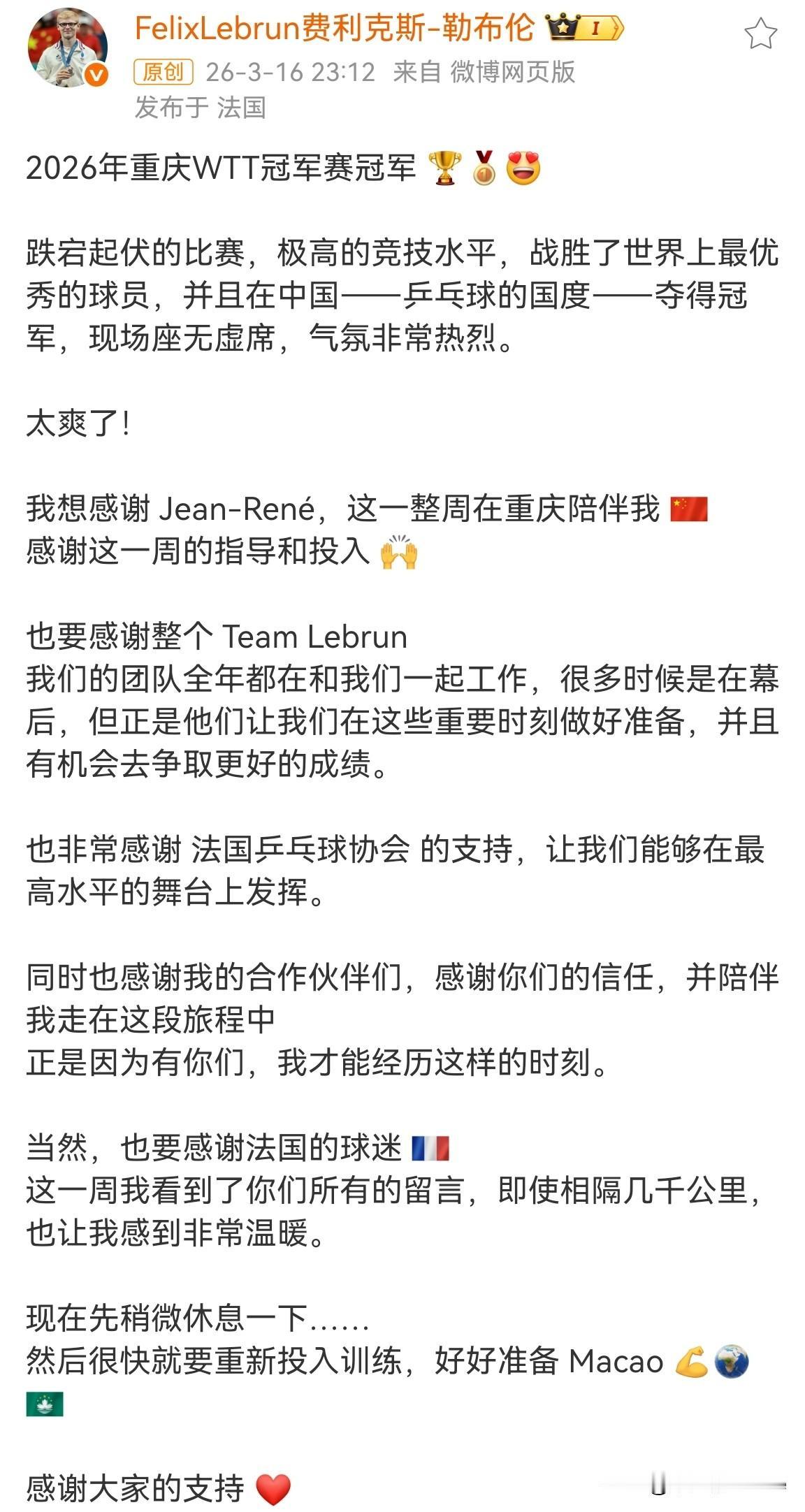 3月16日晚,小勒布伦发文总结WTT重庆冠军赛,恭喜他获得本站比赛冠军。 小勒布伦感谢了教练、团队、乒乓球协会、合作伙伴以及法国的球迷们,说话滴水不漏。 他晒出6张比赛照片,4张合照,2张个人照,图中背景是“重庆洪崖洞”。 小勒布伦表示他休息调整后,将继续备战WTT澳门冠军赛。 我蛮喜欢勒布伦兄弟俩的,他俩除了球技不错以外,两人在比赛期间的互动也特别搞笑。 樊振东已正式宣布签约德国杜塞尔多夫乒乓球俱乐部,国乒的梯队建设压力确实不小,大家怎么看?