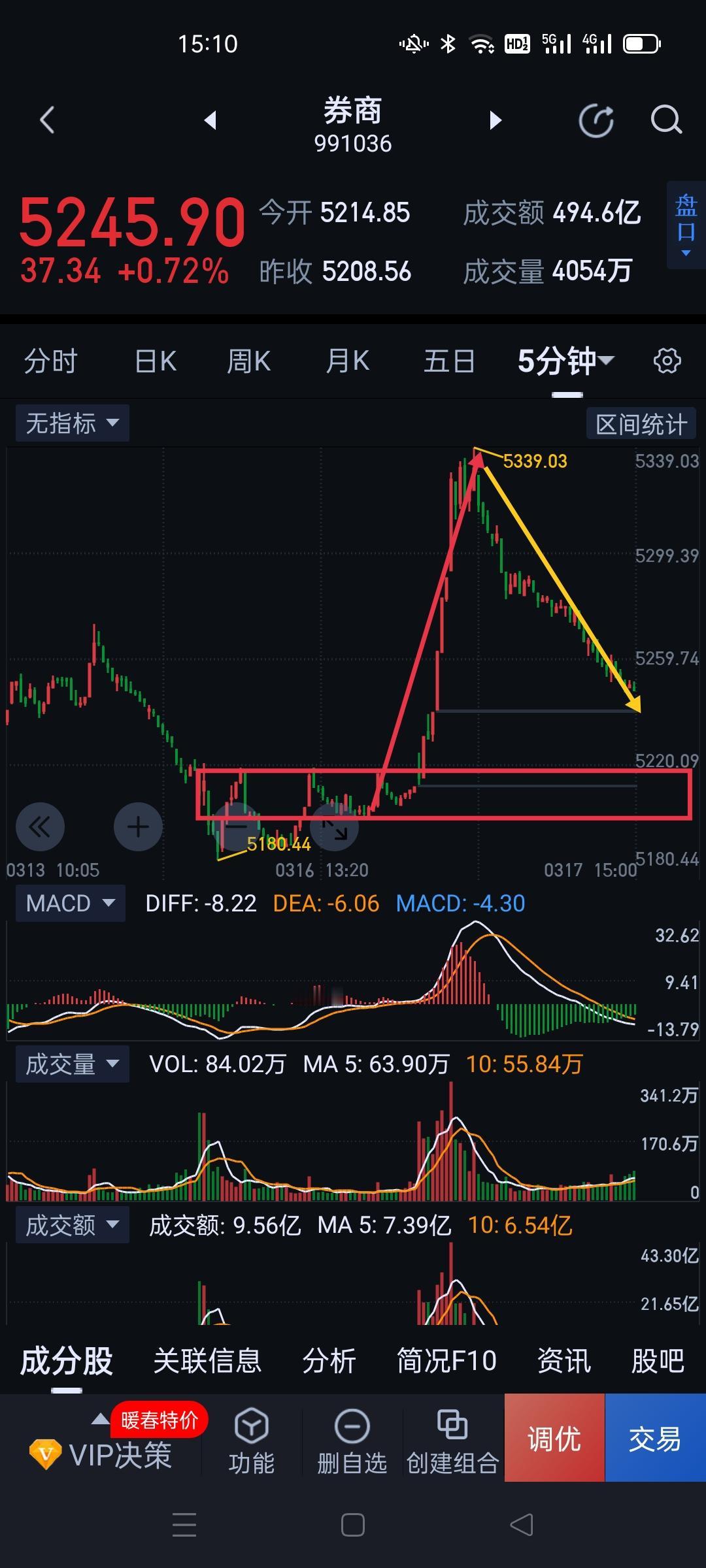 券商板块,今天的上涨暂当修复性弹。 券商今天的上涨并没有延续性。目前走势仍是围绕图(1)第二个中枢的震荡延伸。在没形成对该中枢有效突破前,形成阶段性反转的时机尚未成熟,后续还要观察5180的支撑效果,如本周能站稳5180,则为后期形成反转夯实基础。 细节上,上午上涨力度还是符合昨天预期的。但随后五分钟一笔下直至收盘仍未有结束迹象,且冲高回落幅度有些大,即使明天能形成图(2)的三买,也要防止向上会受到5339的压制,再次向下寻找支撑。券商明天关键点位5339。站上5339,回调过程可以找进场机会,5180暂可当做反转点。如不能站上5339,要防止回调继续考验图(2)中枢的支撑。(图中黄色线段为待确认走势)