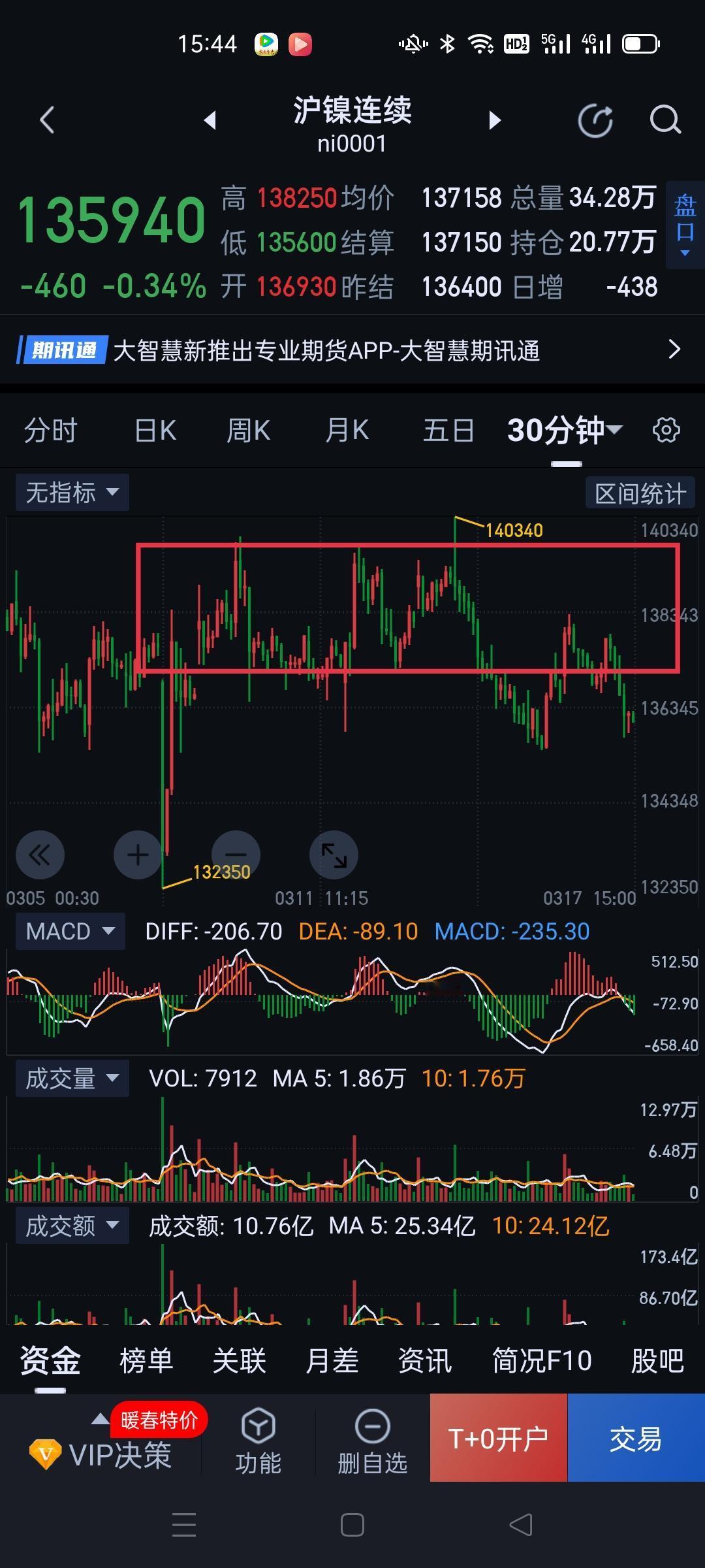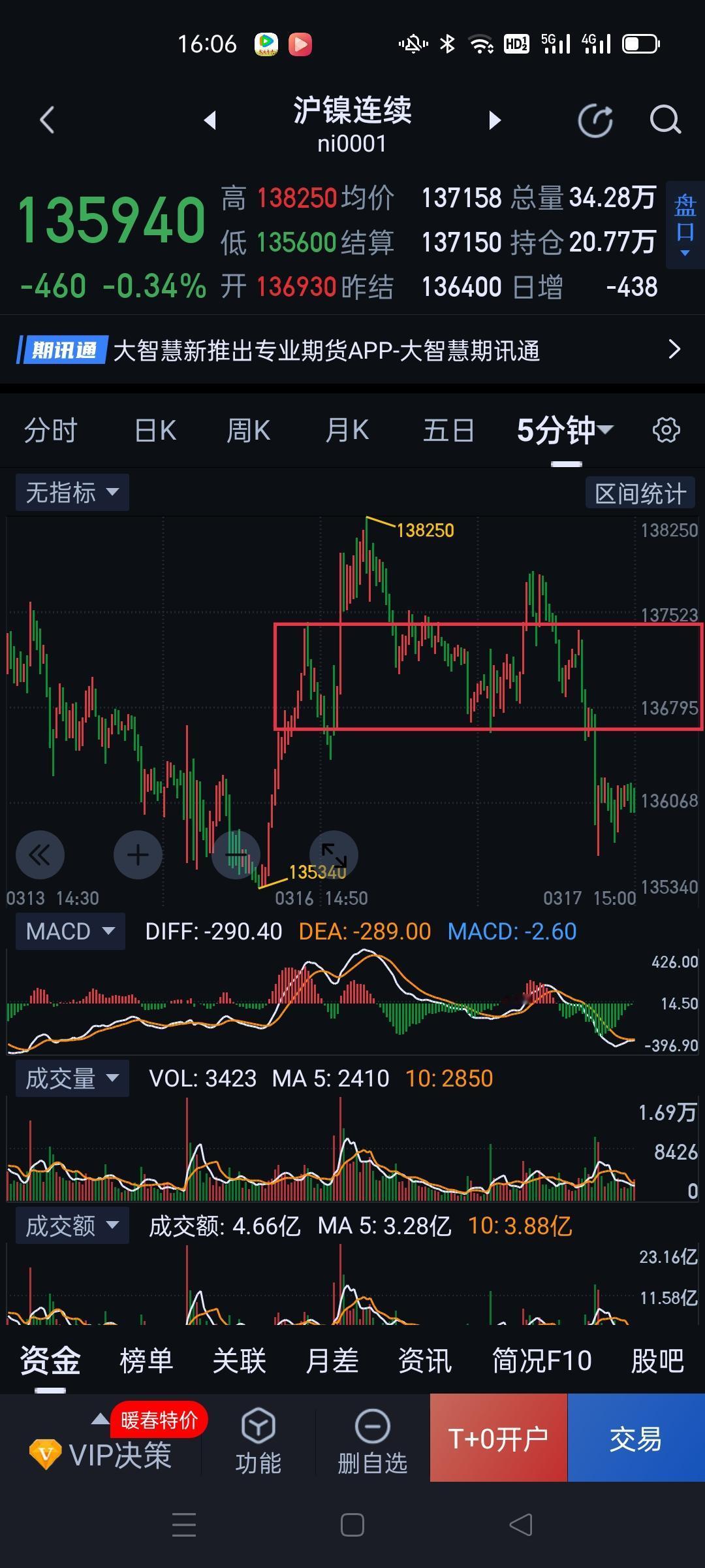 沪镍,日K线仍然维持揉搓的走势。 当前结构仍是围绕图(2)5分钟中枢的震荡延伸。现在多、空博弈迟迟未见结果,走势极其尴尬,上下两难。现阶段只适合观察,不宜上手操作。 夜盘,观察围绕图(3)中枢是继续震荡或是形成三卖。如果形成三卖,沪镍仍将向132350附近寻找支撑。如未形成三卖,暂时仍摆脱不了图(2)中枢的纠缠。