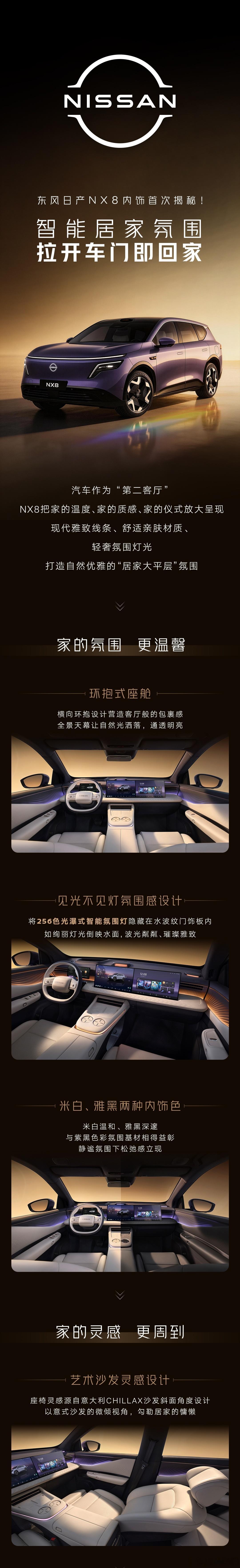 3月17日,东风日产官方今日公布了日产NX8的内饰官图,前排双联屏+独立仪表+AR-HUD,256色光瀑氛围灯,副驾零重力座椅。