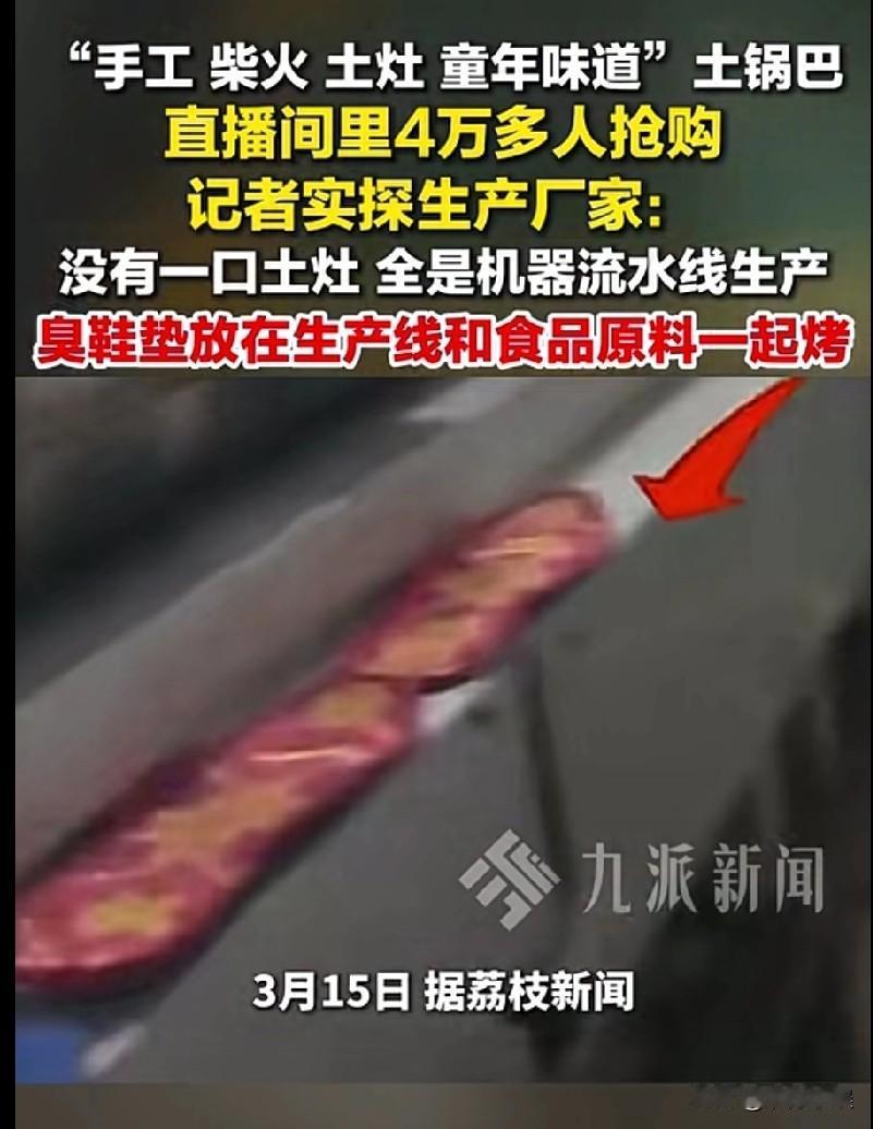 你知道吗,你吃的锅巴可能和臭鞋垫一起烤的! 记者暗访了某网红锅巴的生成厂家,现场令人作呕,发现了做好的锅巴露天摆放,生产车间污水横流,这锅巴号称是农家锅巴,在网上销售火爆,而且厂家还给多家锅巴代加工。 更令人炸裂的是,有工人直接把脏手套、臭鞋垫直接放在了流水线上,和锅巴一起烘烤。 这锅巴能吃吗,多恶心啊!看到这个新闻顿时觉得零食不香了,以后也不想吃零食了,说不上哪个就是卫生不合格的产品。再也不信网红卖的食品了!