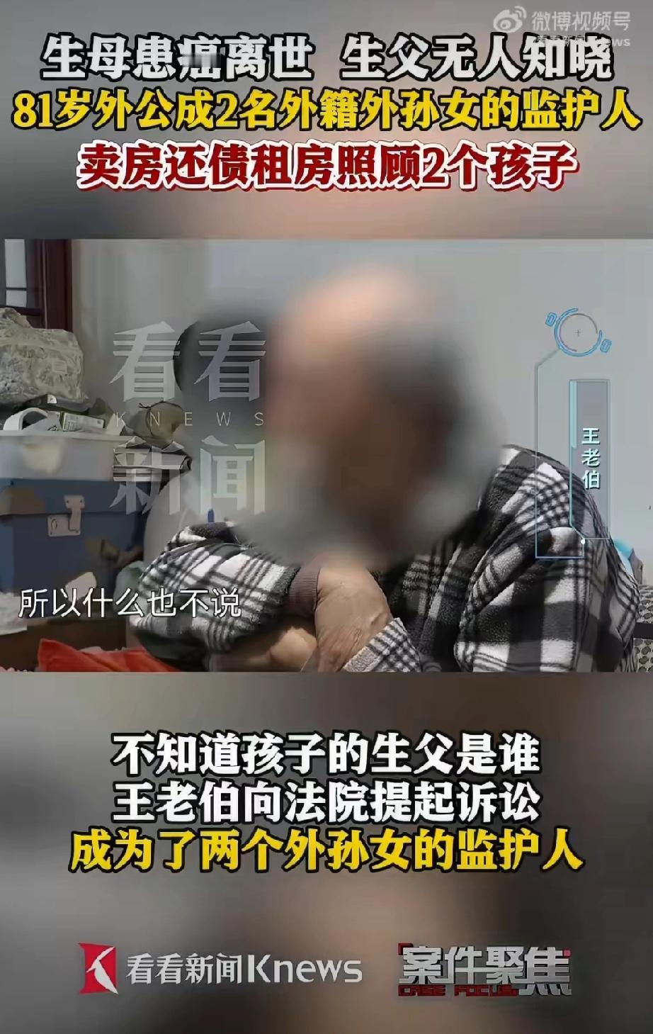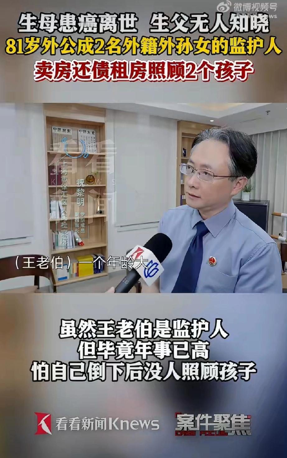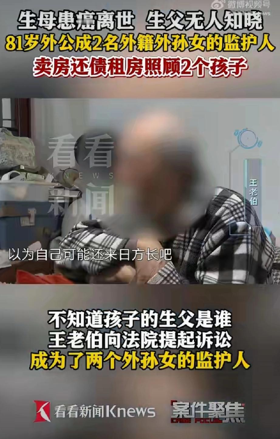 81岁老人为外籍外孙女寻意定监护人。这个新闻,去年就上过热搜,女儿跑到美国去生了两个孩子,不知道孩子的亲生父亲是谁,两个孩子美国籍,但是,在上海上学,因为女儿去世了,孩子护照过期了,如果没有监护人就要被驱逐出境了,81岁外公申请成了两个美国外孙女的监护人。 今年的新闻又补充了一些信息,女儿不但生了两个没爹的美国人,还欠了一屁股债,为了帮女儿还债,82岁老汉连房子都卖了。现在的问题是,这个外公毕竟已经82了,万一外公去世了,这两个美国外孙女怎么办?美国领养小孩 外孙女生父 黑人外孙