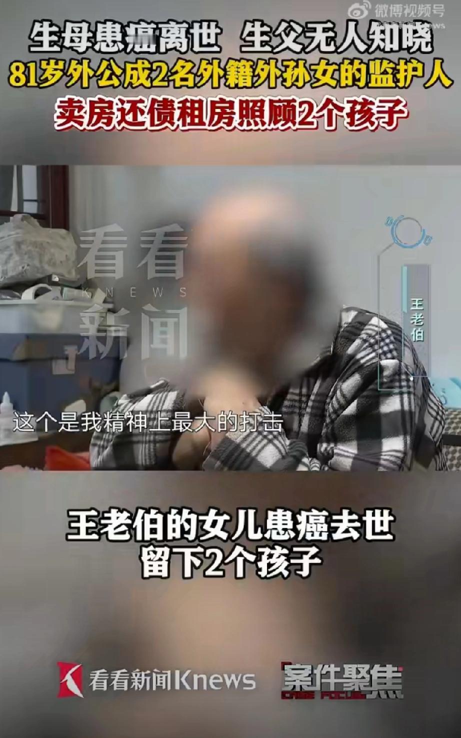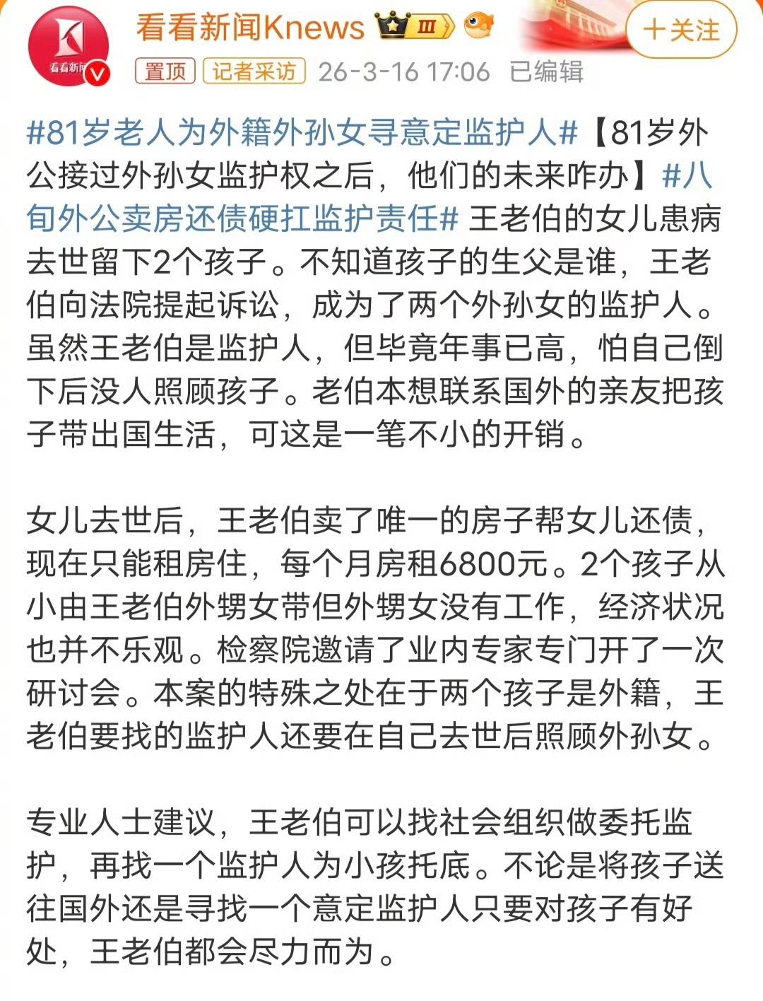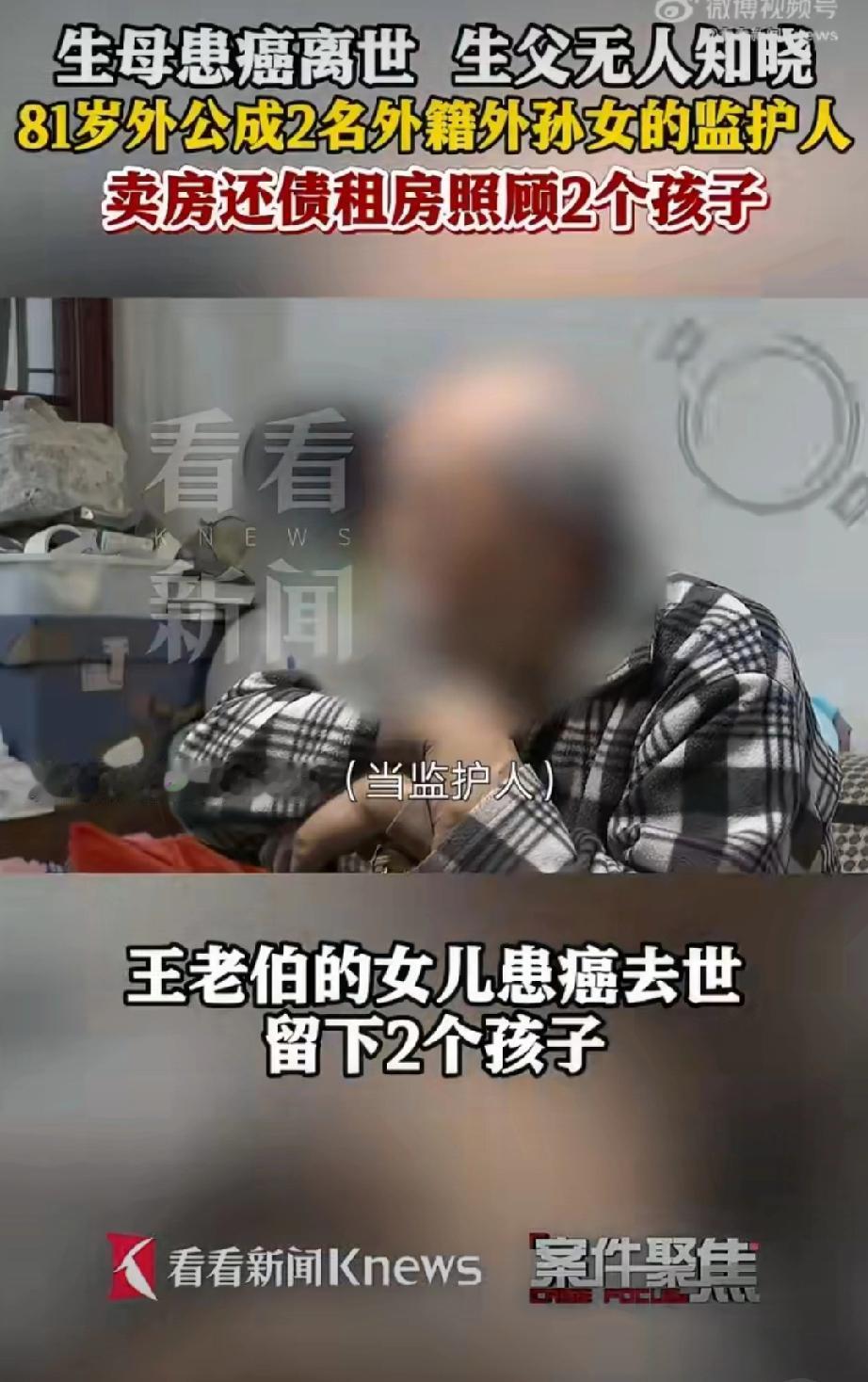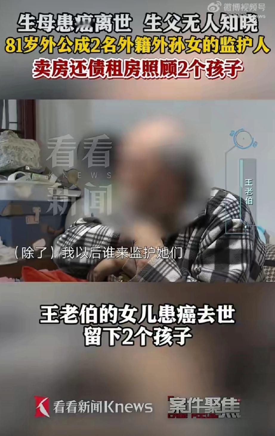 81岁老人为外籍外孙女寻意定监护人。这个新闻,去年就上过热搜,女儿跑到美国去生了两个孩子,不知道孩子的亲生父亲是谁,两个孩子美国籍,但是,在上海上学,因为女儿去世了,孩子护照过期了,如果没有监护人就要被驱逐出境了,81岁外公申请成了两个美国外孙女的监护人。 今年的新闻又补充了一些信息,女儿不但生了两个没爹的美国人,还欠了一屁股债,为了帮女儿还债,82岁老汉连房子都卖了。现在的问题是,这个外公毕竟已经82了,万一外公去世了,这两个美国外孙女怎么办?美国领养小孩 外孙女生父 黑人外孙