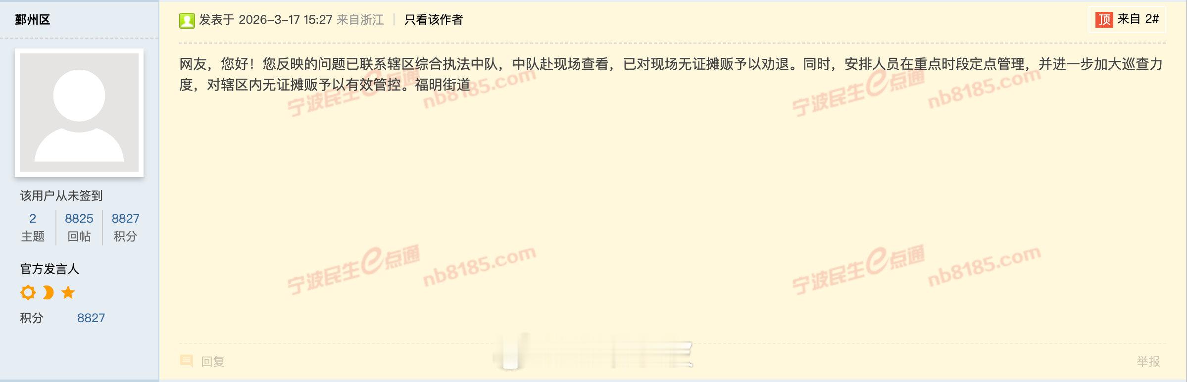 3月17日,鄞州区福明街道回应称,已第一时间联系辖区综合执法中队赶赴现场核查,对现场无证摊贩进行劝退。后续将在重点时段实行定点管理,加大巡查频次与管控力度,切实规范辖区市容秩序。