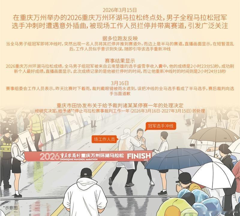 3月15日,重庆万州环湖马拉松冠军盛雪李在冲线时被误拦,引发广泛关注。裁判因视线受阻做出误判,选手最终仍以个人最佳成绩夺冠。 3月15日,重庆万州环湖马拉松在阴雨连绵的天气中举行。男子全程马拉松冠军盛雪李即将冲线夺冠时,一名身穿白色雨衣的终点裁判突然冲出,将其强行拦截并推至半马赛道区域,坚称其为半马选手误入全马赛道。盛雪李事后在社交平台上调侃:“今天全马冲线,差点被裁判给抱走,第一次全马站台居然发生这样的乌龙,我也是服了。”经过现场工作人员与观众的提醒,裁判才发现误判,盛雪李得以重返赛道完成象征性冲线,最终以2小时23分53秒的成绩荣获冠军,且被确认被拦截时刻的计时成绩有效。赛事组委会对此表示遗憾,称涉事裁判因眼镜被雨水遮挡导致视线受阻,但裁判的行为确实干扰了运动员的正常比赛节奏,并造成了不良的社会影响。为此,重庆市田径协会决定给予该裁判停止马拉松赛事裁判工作一年的处罚,禁赛期限自2026年3月16日至2027年3月15日止。此事件提醒了各方,裁判在比赛中必须更加谨慎和准确,以维护赛事的公平性和秩序性。