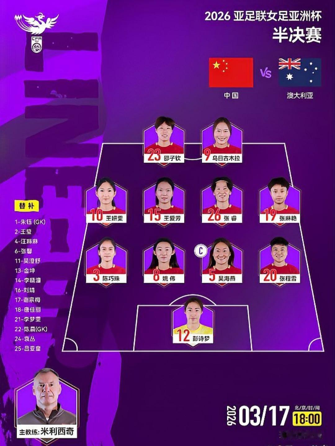 中国女足为冲击决赛更换六名首发球员,张琳艳顶替王霜出战,能否创造惊喜? 在即将进行的亚洲杯决赛前,中国女足做出了大胆的阵容调整,更换了包括前锋、中场和后卫在内的六名首发球员。这一变动的最大亮点是张琳艳的先发,她顶替了因累计黄牌停赛的头号球星王霜。主教练米利西奇选择了经验丰富的吴海燕和姚伟继续坐镇后防,张程雪和陈巧珠也获得了宝贵的先发机会。中场方面,王妍雯和张琳艳的组合有望发挥更强的进攻组织能力,而锋线则由乌日古木拉和邵子钦搭档。此次调整旨在提升球队的整体实力,争取在决赛中取得佳绩。